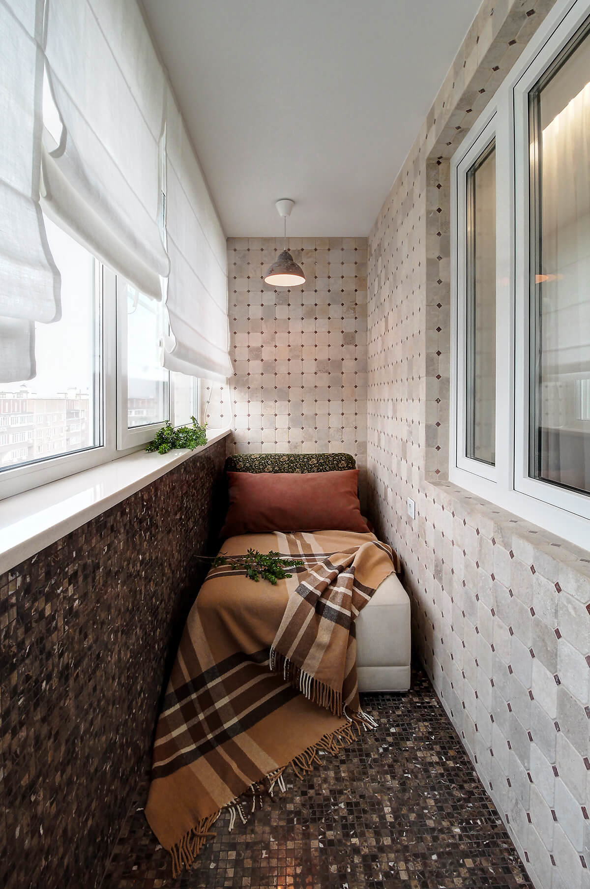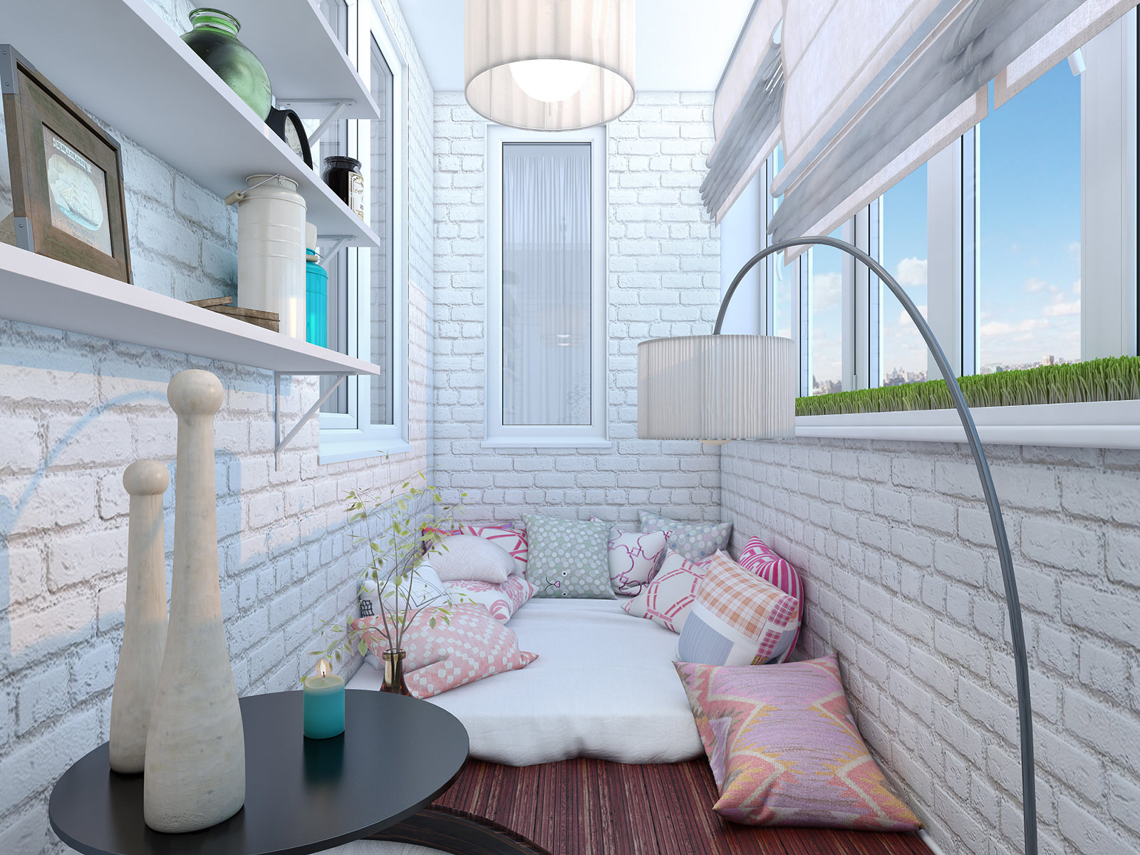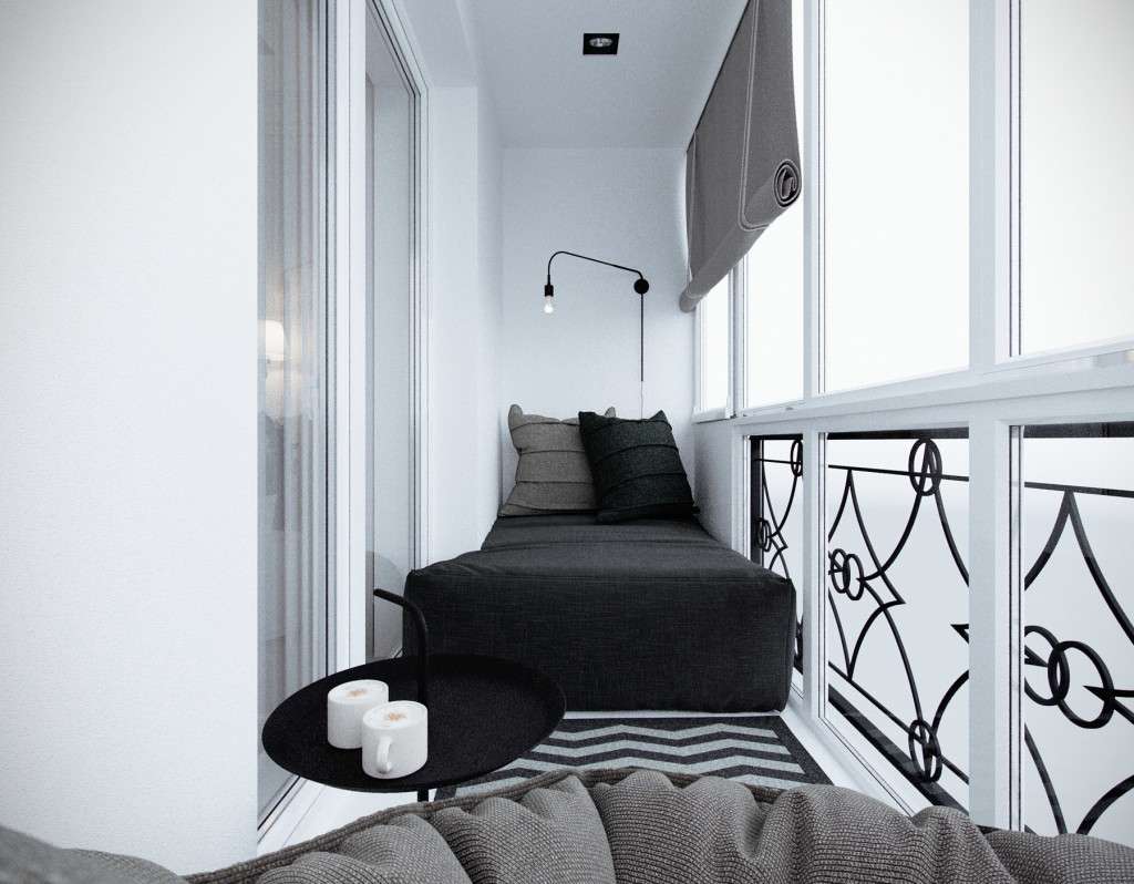 Feita no minimalismo correto, uma pequena varanda parece maior do que realmente é. E devido ao fato de que as janelas ocupam a maioria das paredes, esse sentimento só se intensifica.