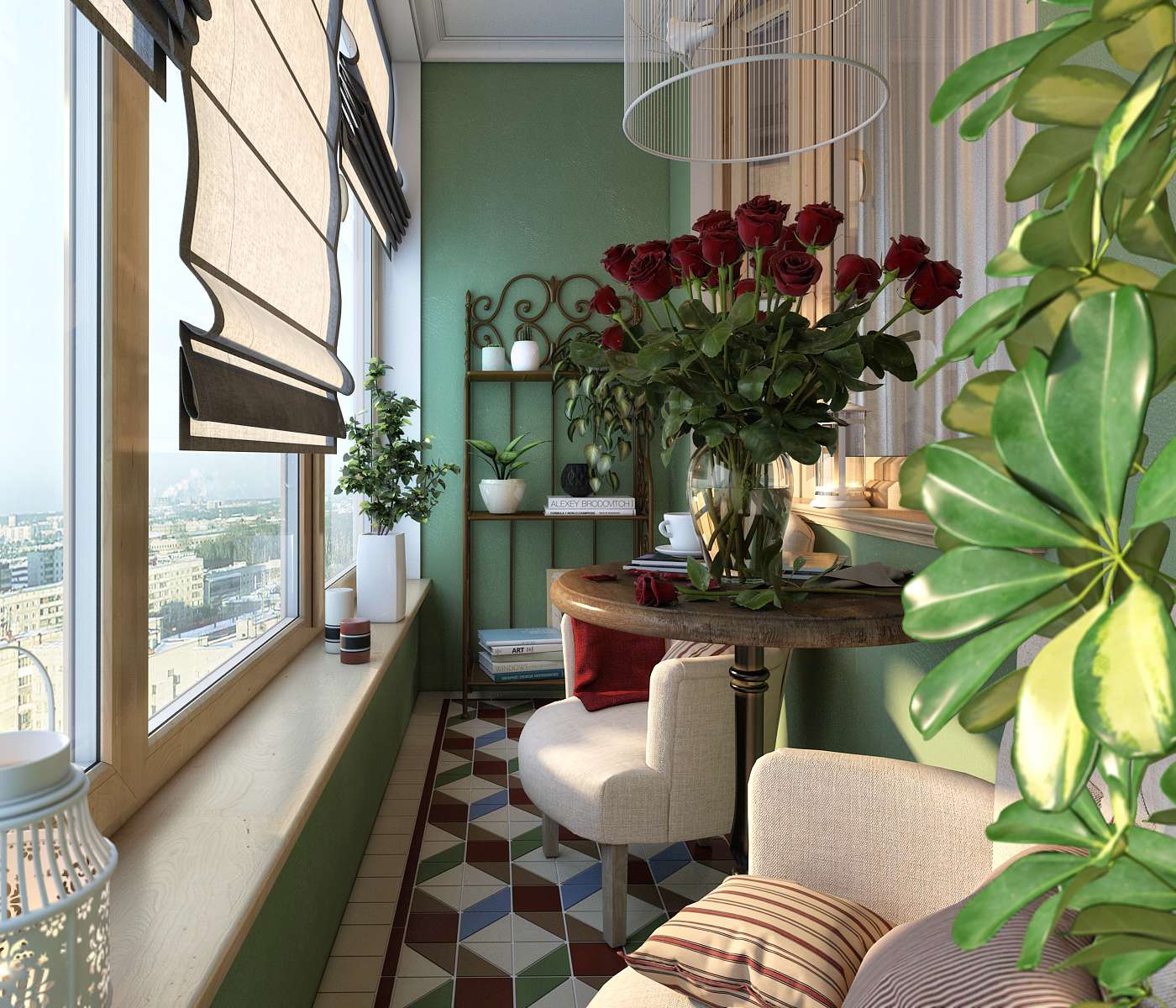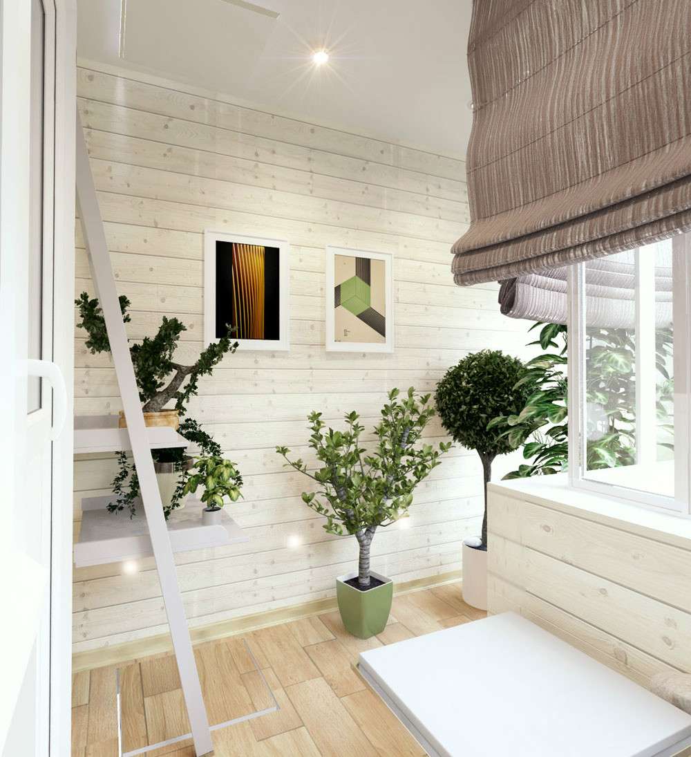 Este também é um estilo minimalista, mas com uma referência à vida selvagem. Se você quiser fazer uma estufa na varanda, ela se encaixará melhor do que nunca - mas você também pode fazer um local de descanso nela.