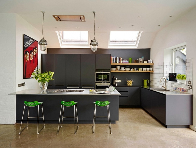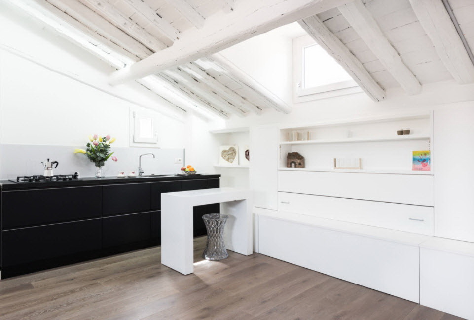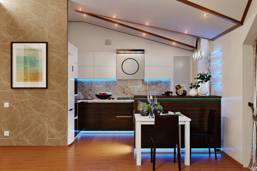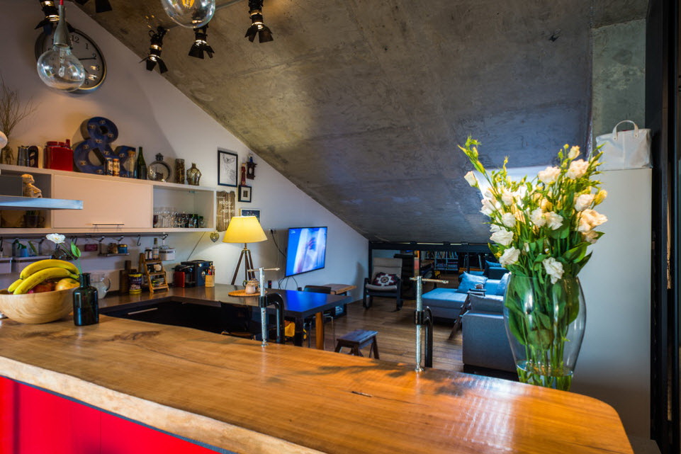 - Cozinha. Uma decisão bastante original, mas se você tem um lugar ruim nos andares inferiores, é bem possível. É necessário, naturalmente, suar, passar a água, e o teto deve ser alto para isso, mas nada é impossível. Móveis devem ser leves, geladeira também. O design geral é geralmente resiliente.