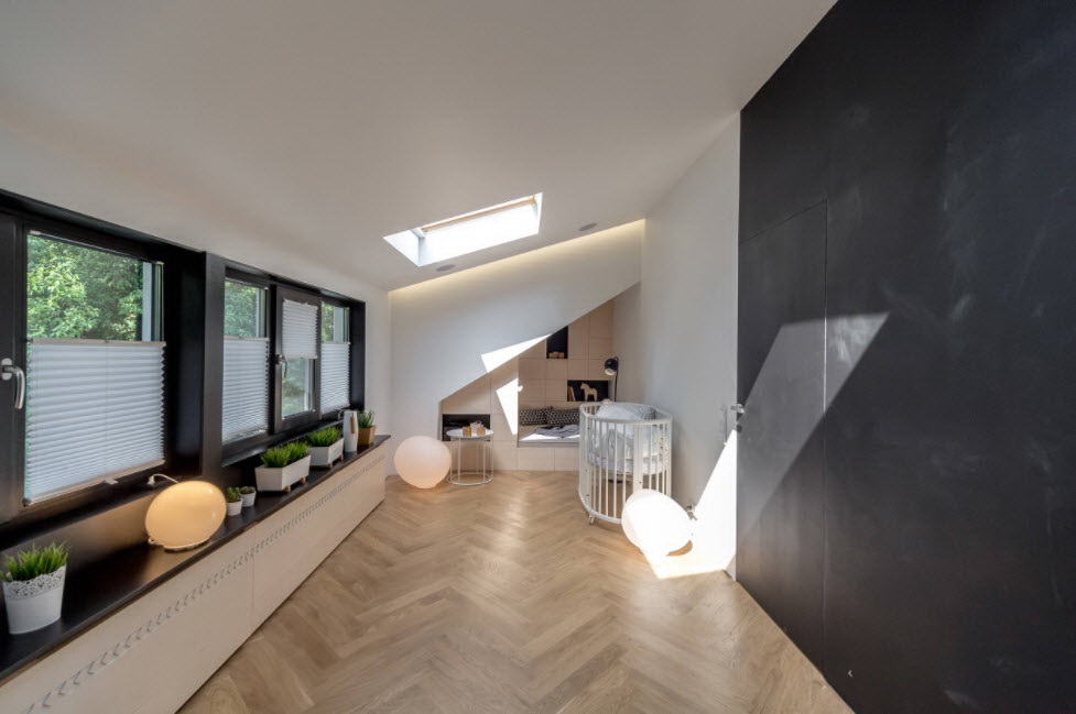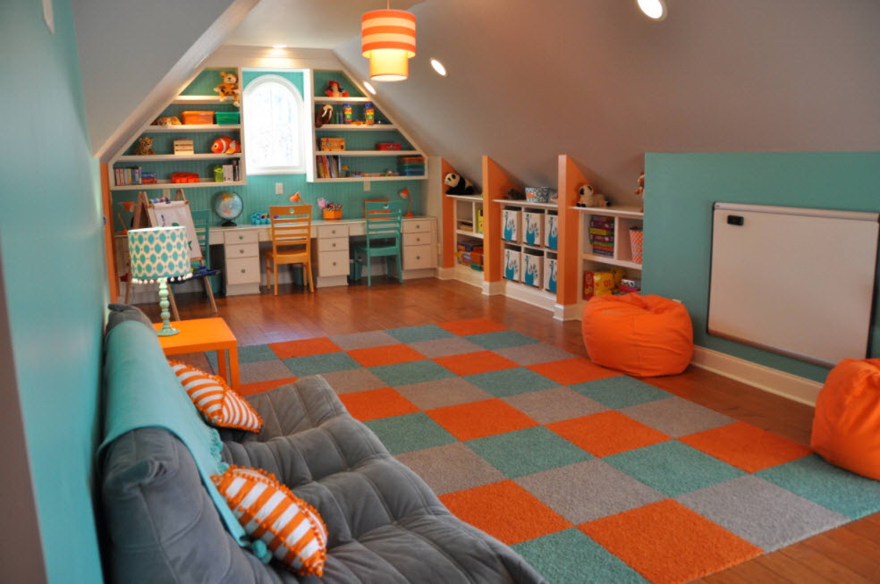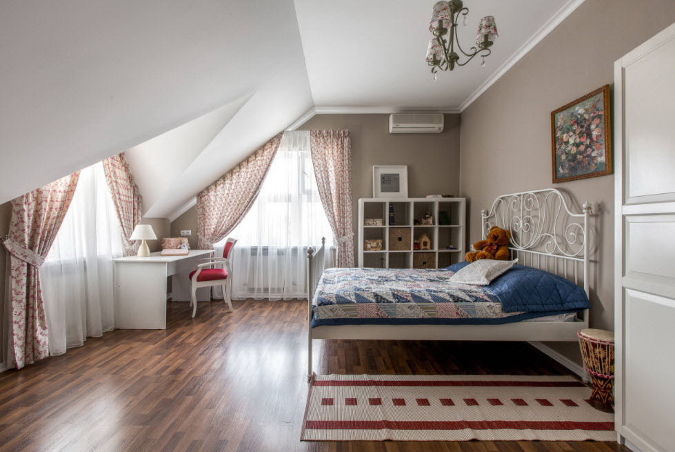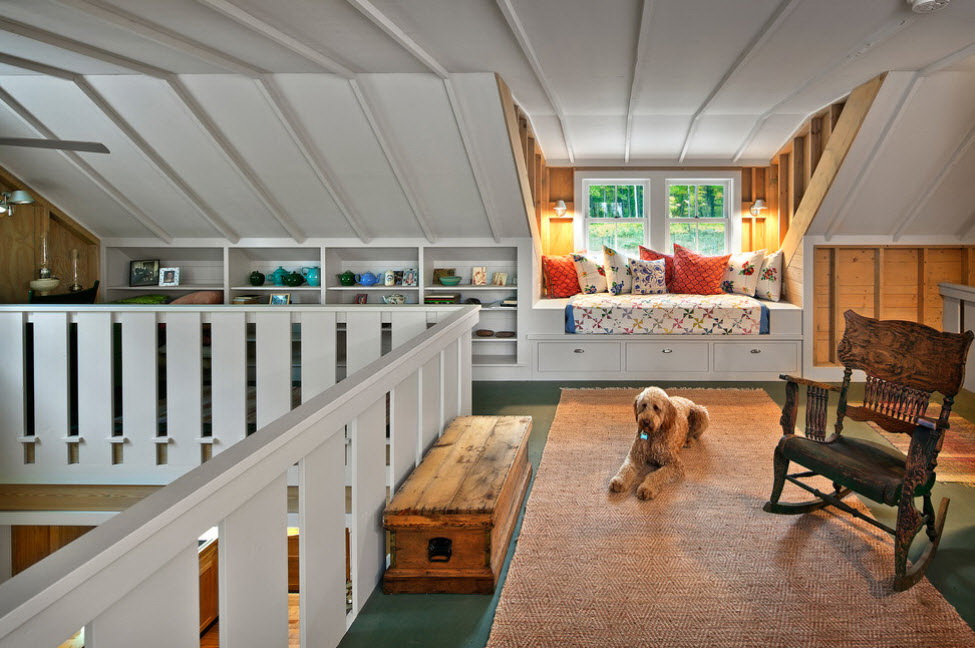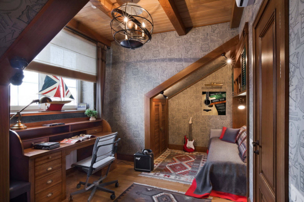 - Infantil. Para uma criança pequena, é inconveniente - nem todas as escadas do sótão permitem que você suba com o bebê em seus braços. Mas para um moleque de dez anos e mais - completamente. As crianças geralmente adoram a altura, é interessante brincar no sótão, é como uma casa na árvore, apenas na própria casa.É necessário apenas garantir que é impossível cair pelas escadas e os móveis não têm cantos afiados.
