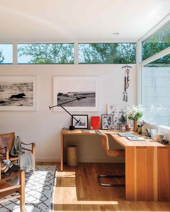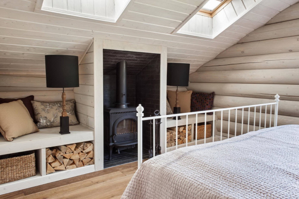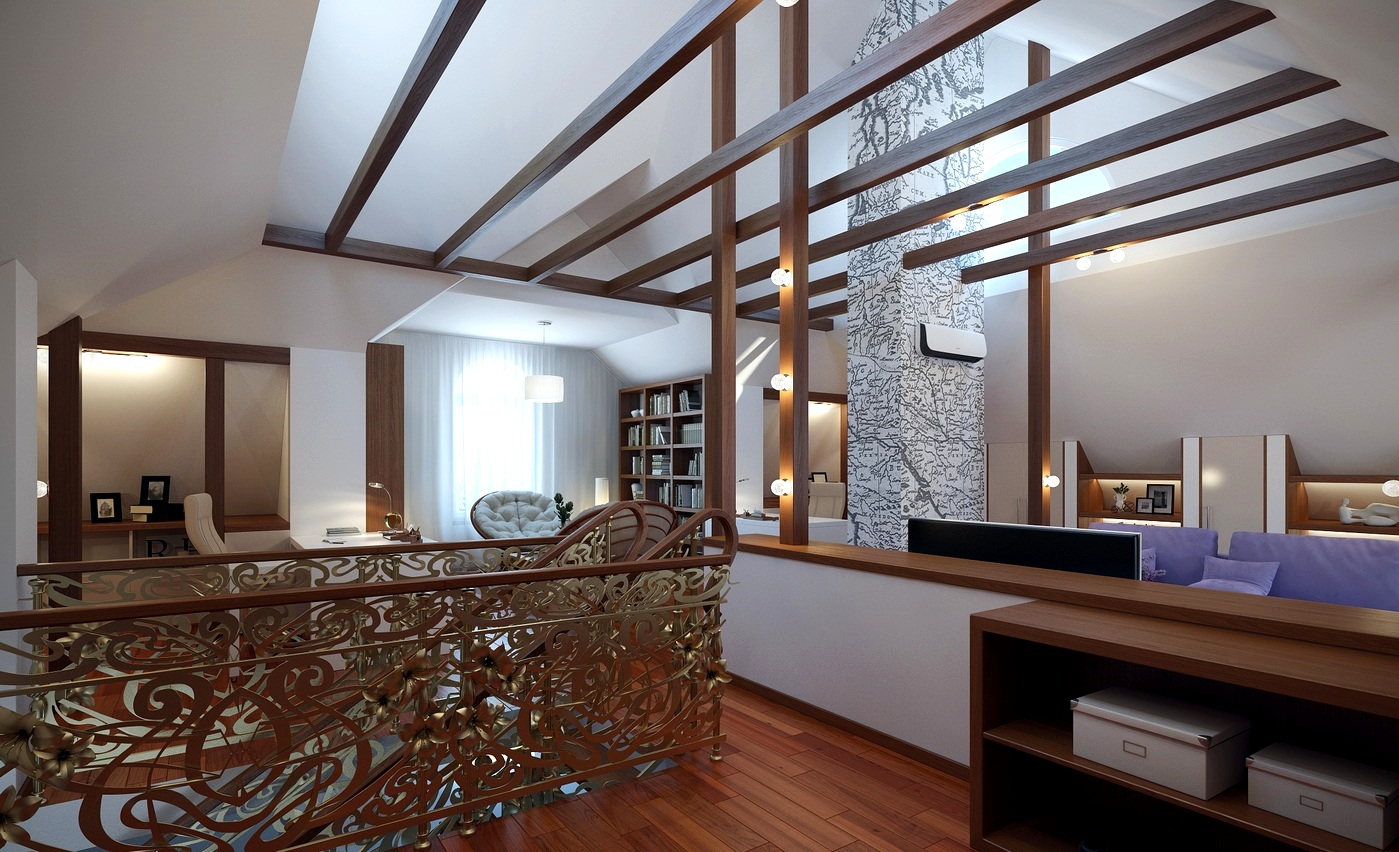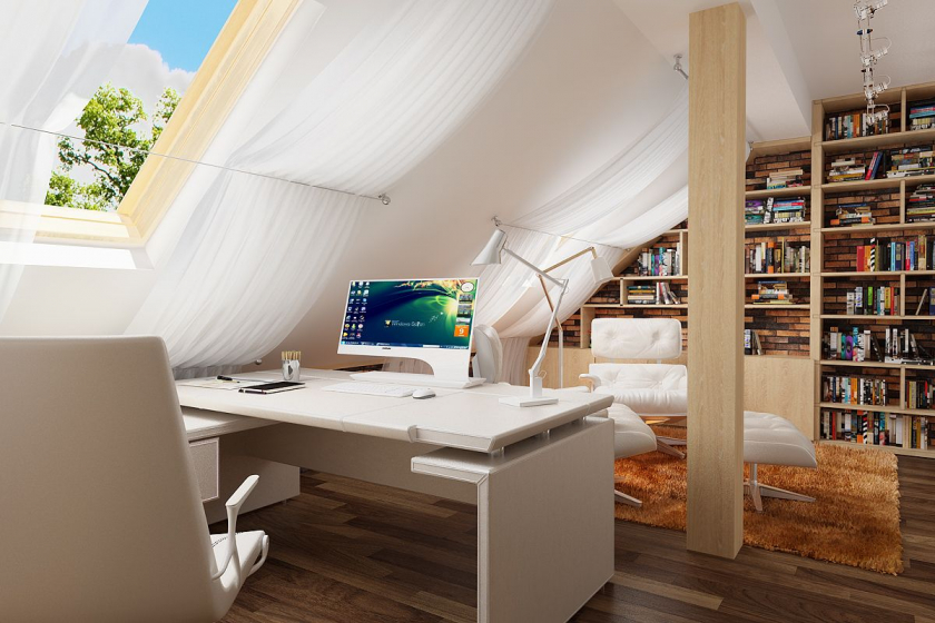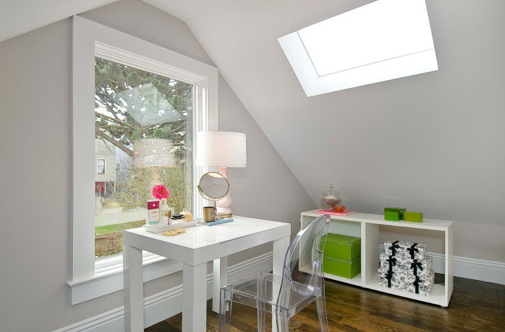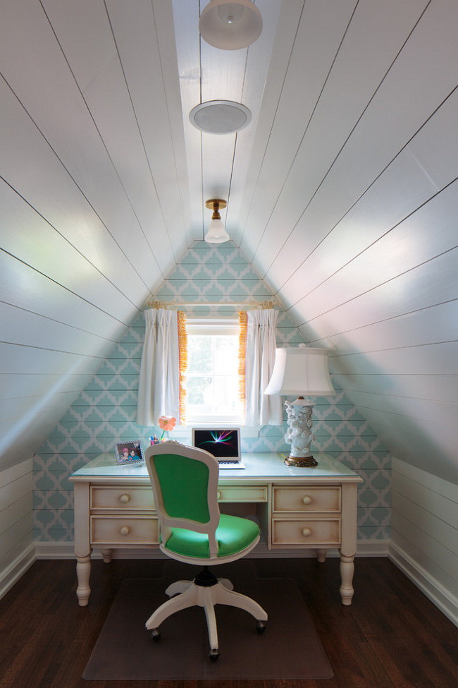 - Gabinete. Se você não gosta de ser perturbado durante o trabalho, um escritório no sótão é uma ótima solução. Coloque a mesa na janela, conduza eletricidade e desfrute da sua privacidade - a casa será difícil de chegar até você e eles pensarão dez vezes antes de você se distrair.