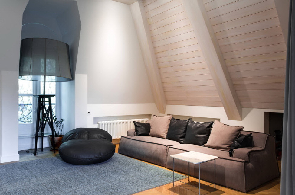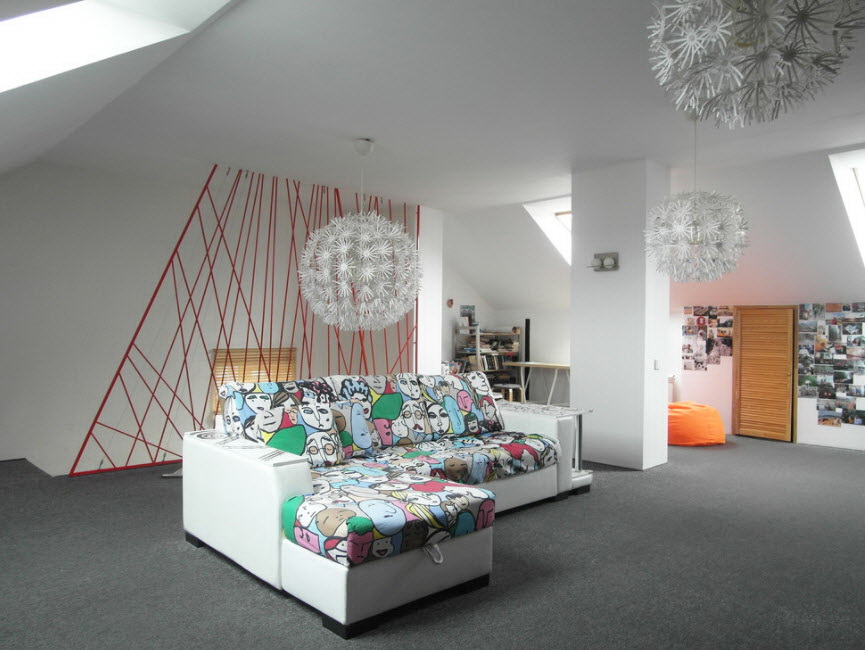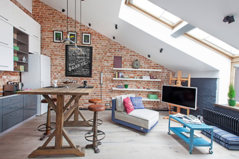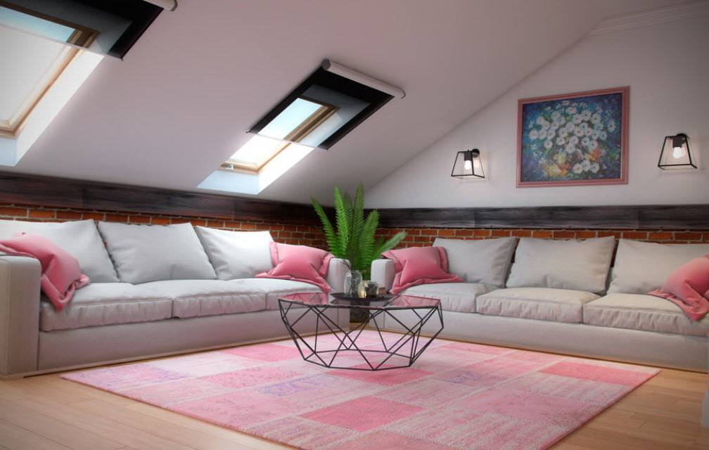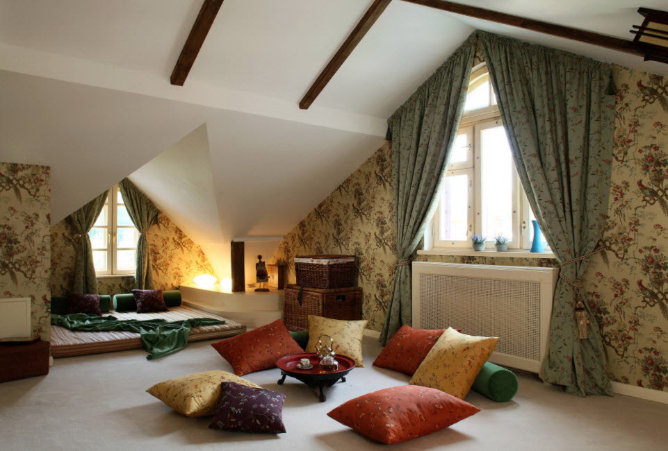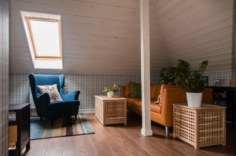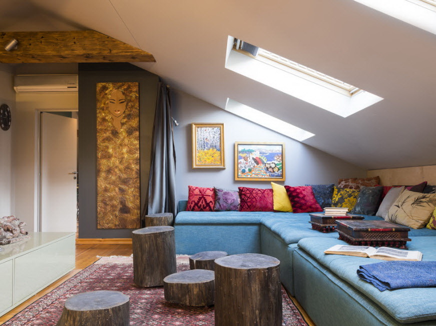 - Sala de estar. Se seus convidados amam o exótico, você pode equipar a sala de estar no sótão. Macio sofálembranças e bugigangas a prateleira com livros na parede ficam ótimos em combinação com janelas cortadas e um teto de formato estranho.