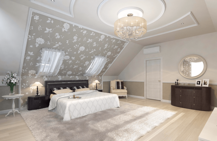- Papéis de parede. A solução tradicional, que é tão apropriada no sótão como em outras salas. Se você tirar papel de parede com vidro ou com polímeros especiais, eles serão resistentes à umidade e, no mínimo, você não precisará refazer o reparo.