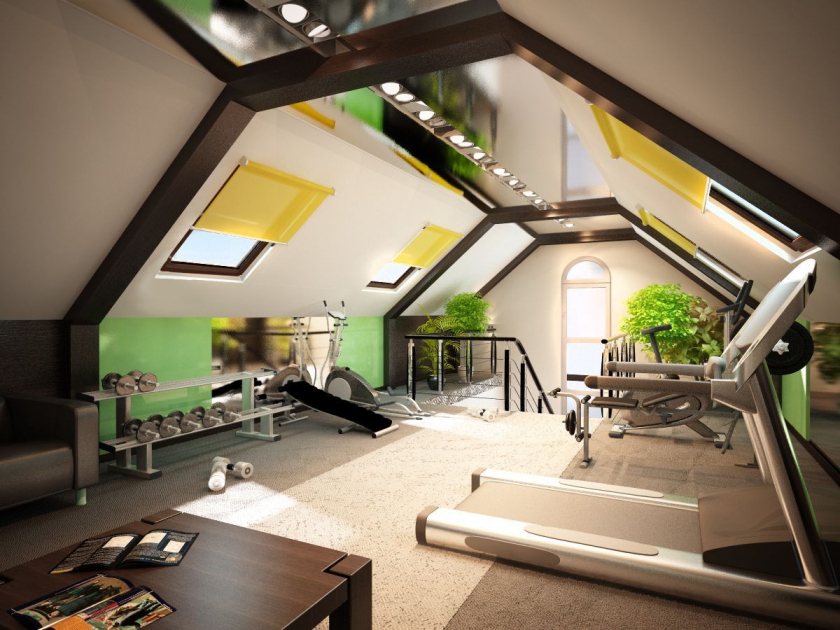 - Ginásio em casa. Se você tem pisos confiáveis e bom isolamento acústico, no sótão, você pode organizar um ginásio. Pendure nas paredes espelhos, instale um par de simuladores básicos ou crie espaço para exercícios de dança. O principal é certificar-se de que o teto não vai balançar dos saltos no sótão abaixo.