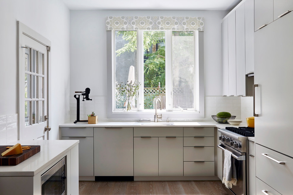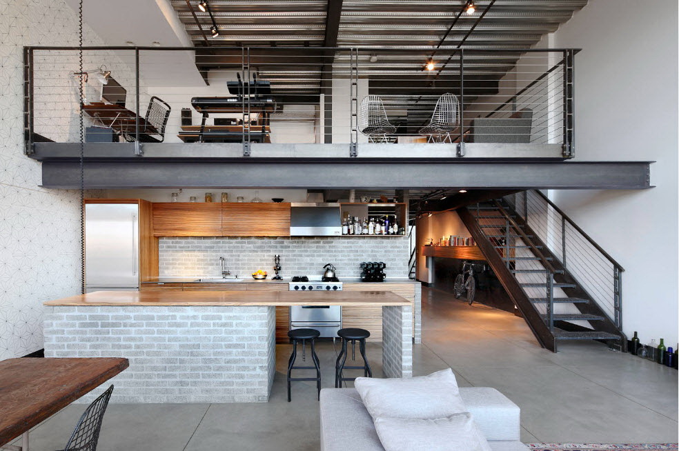 Cor cinza para design é escolhido por homens, é típico para o estilo industrial, loft ou de alta tecnologia. A cozinha monocromática em aço está decorada com tecidos naturais e móveis de madeira.