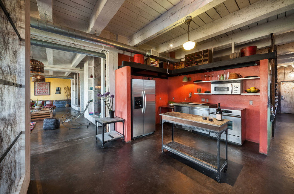 Não há necessidade de repintar todo o interior em vermelho para adicionar originalidade. A superfície vermelha da geladeira, móveis escarlate ou pratos parece ganhar. A sala mudará se você habilmente organizar detalhes em cores.