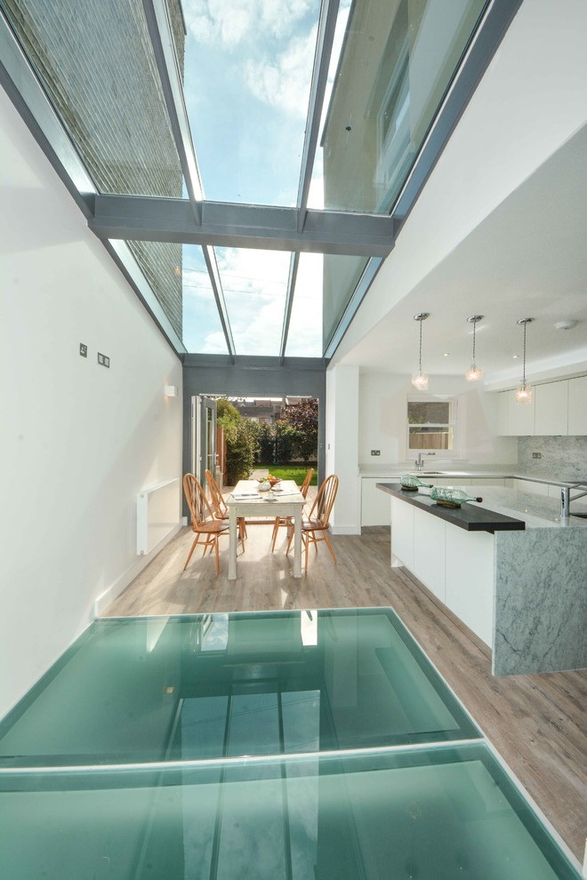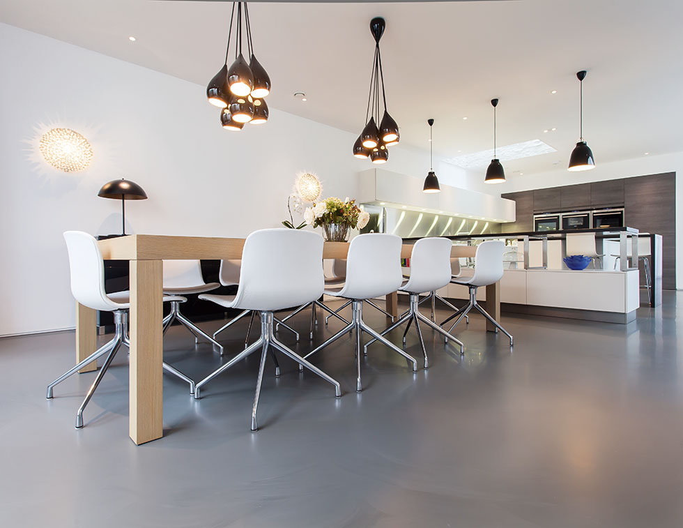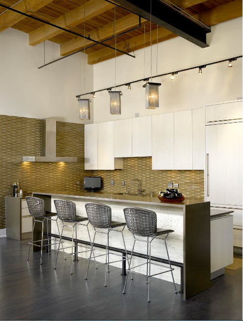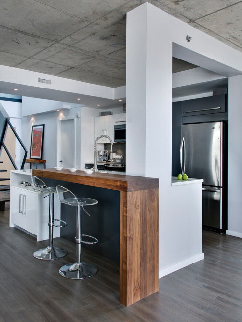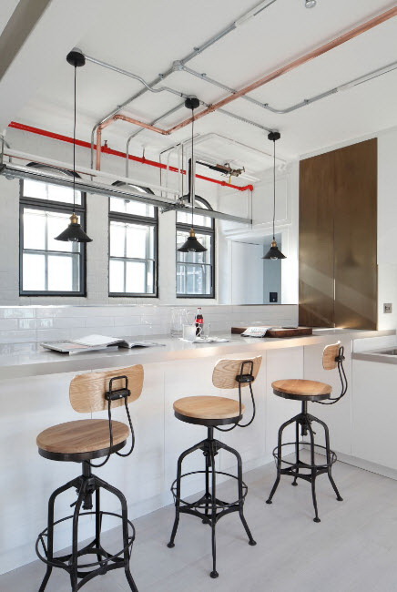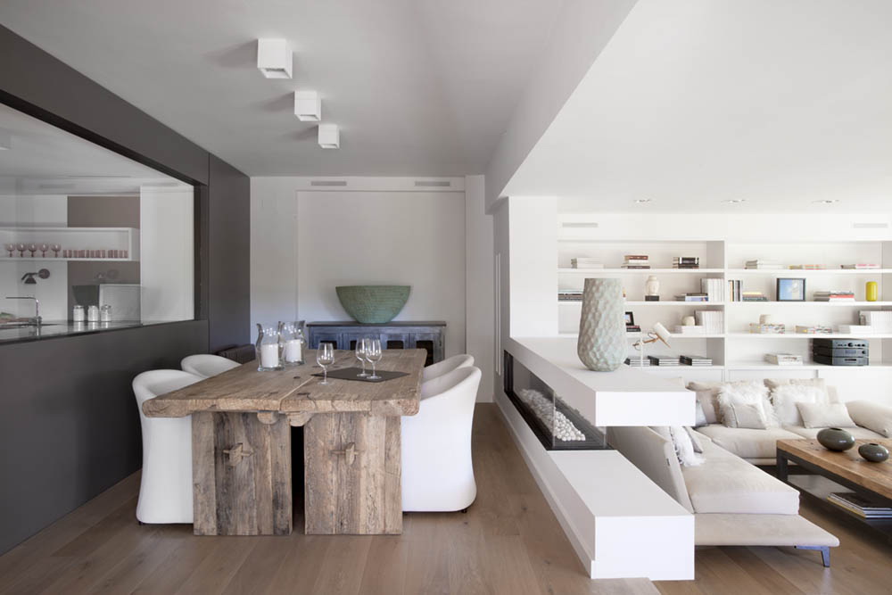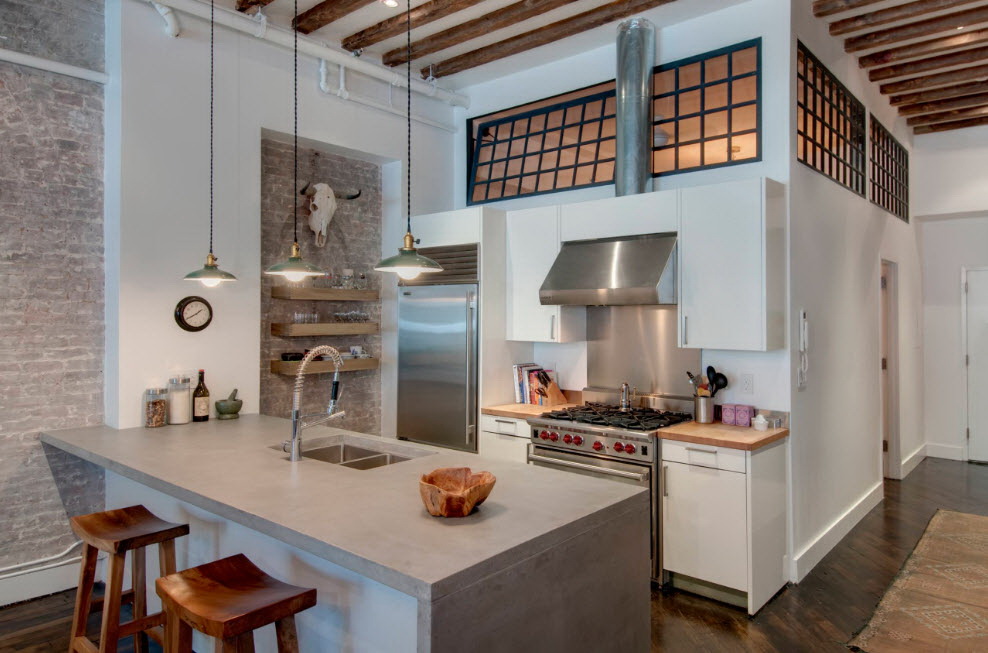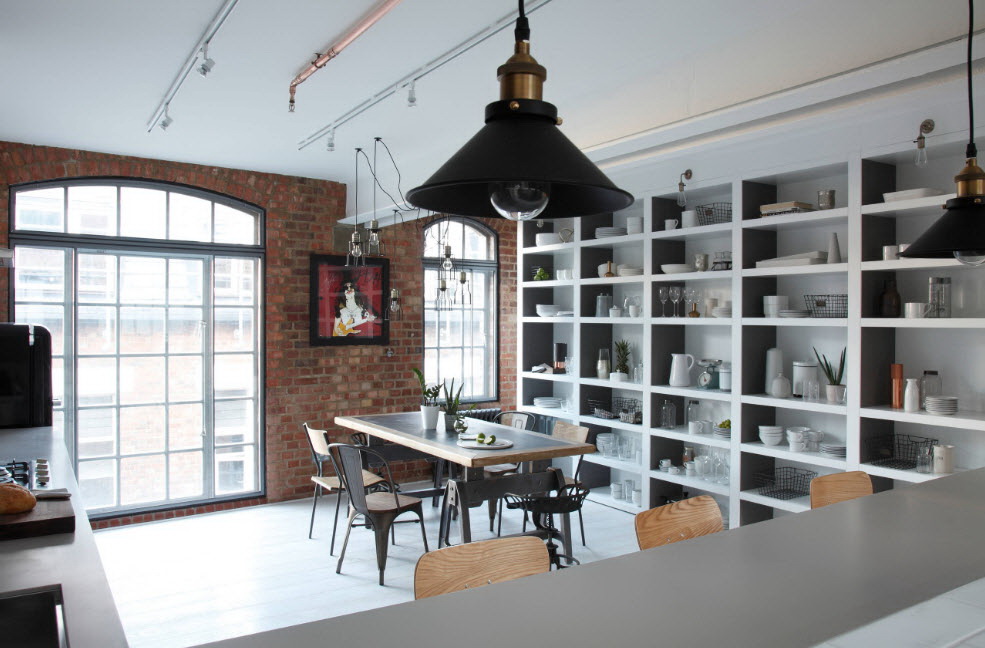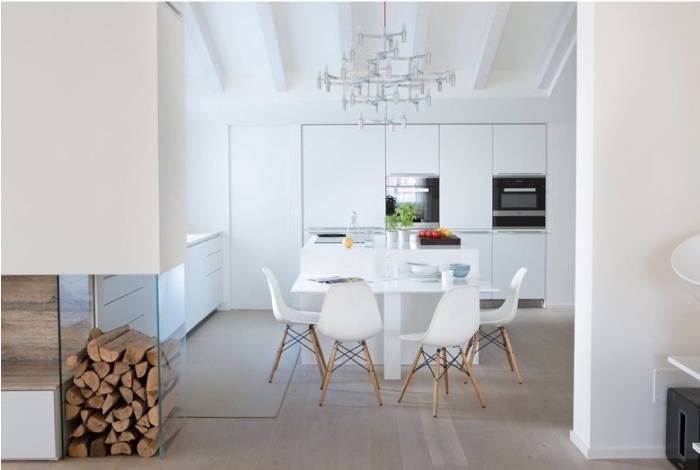 - Branco cinza. Tal paleta é pacificadora, os sotaques serão vasos, pratos e luminárias de teto. Combinação justificada com piso de madeira clara.
