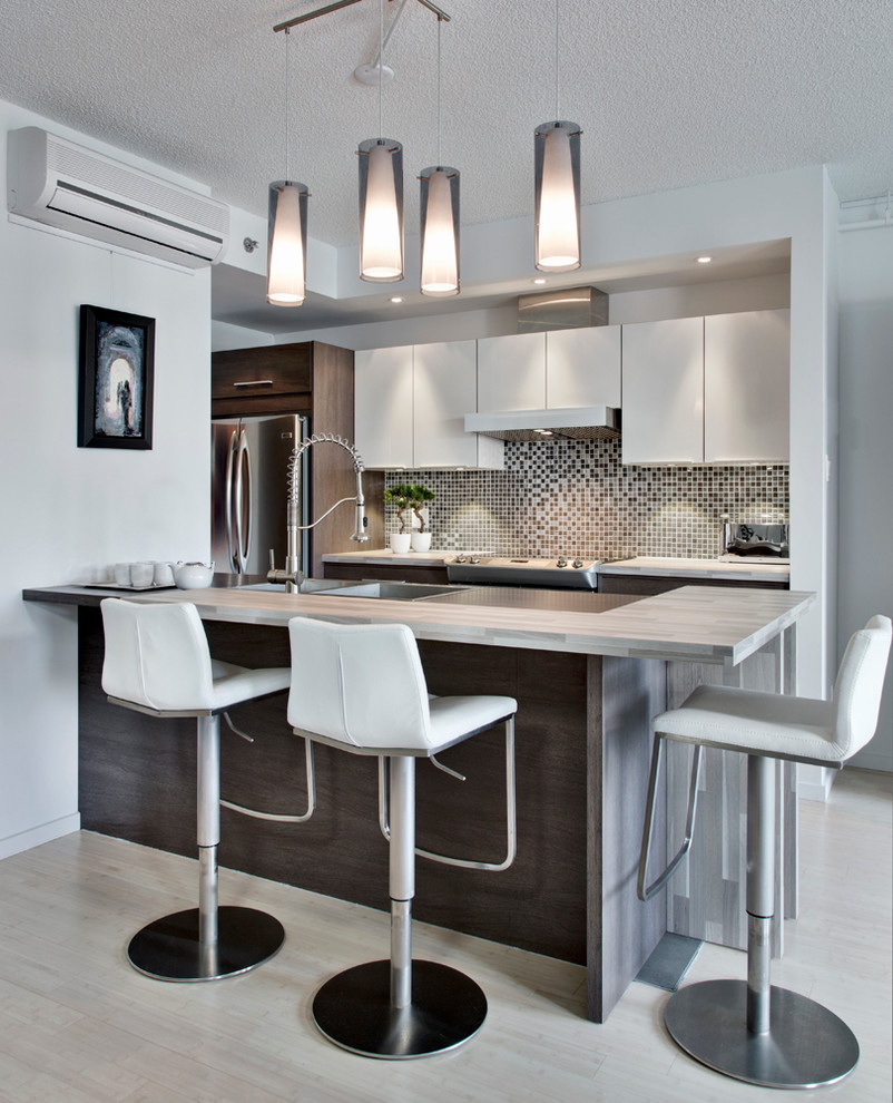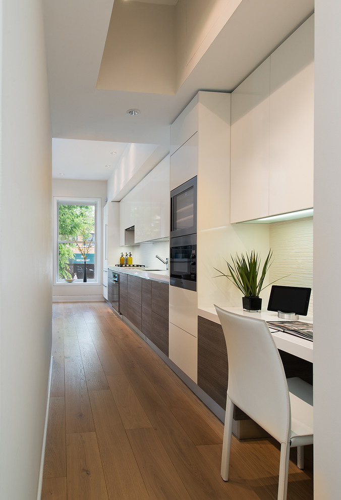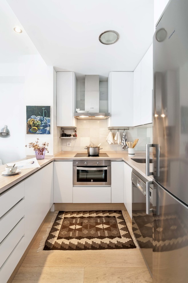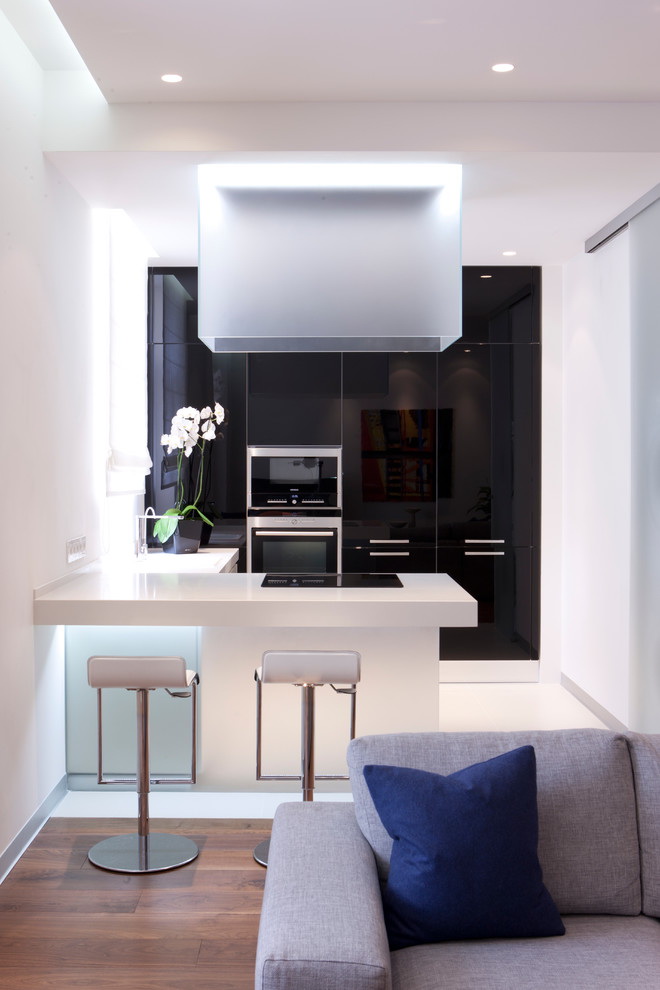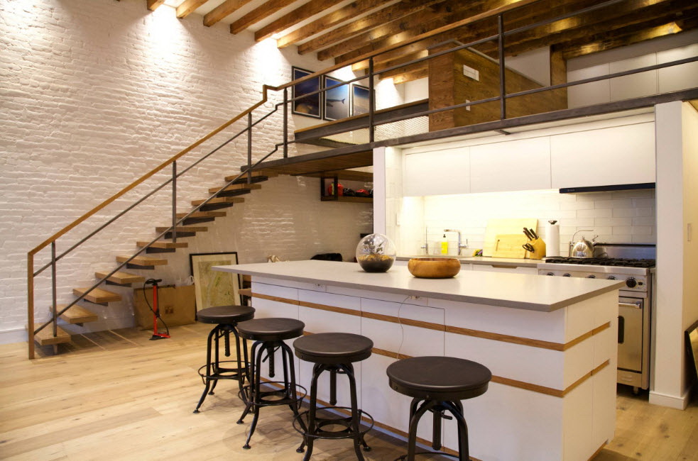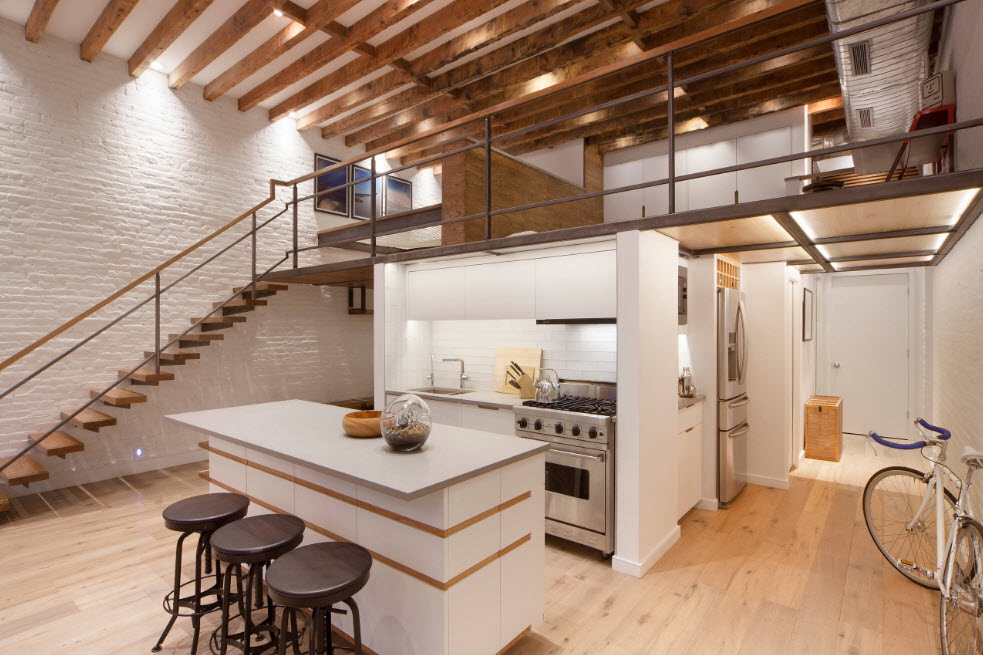- Moderno. Expandindo uma pequena cozinha espelhos e o frescor do branco. Escolhendo elementos cromados, faça alguns acentos com plástico brilhante.