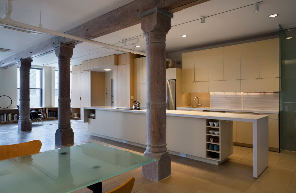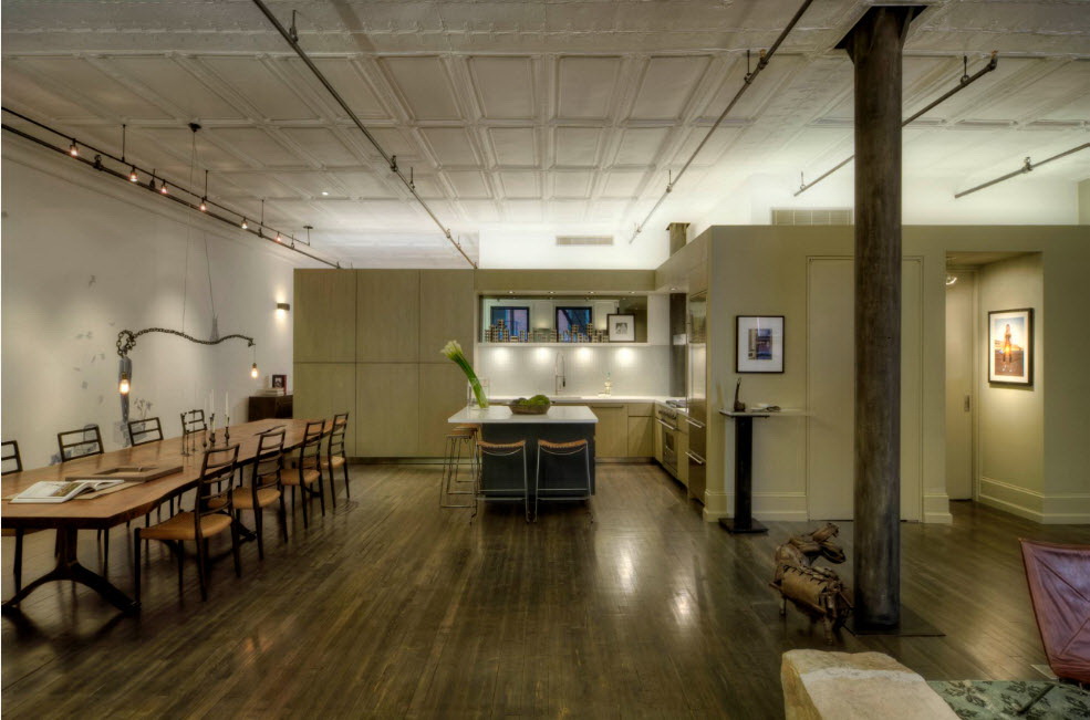 - Minimalismo. Instalamos headsets estritos sem detalhes desnecessários, usamos appliances embutidos. Para o teto, escolha uma superfície fosca em vez de vidro e nas paredes penduramos várias pinturas.