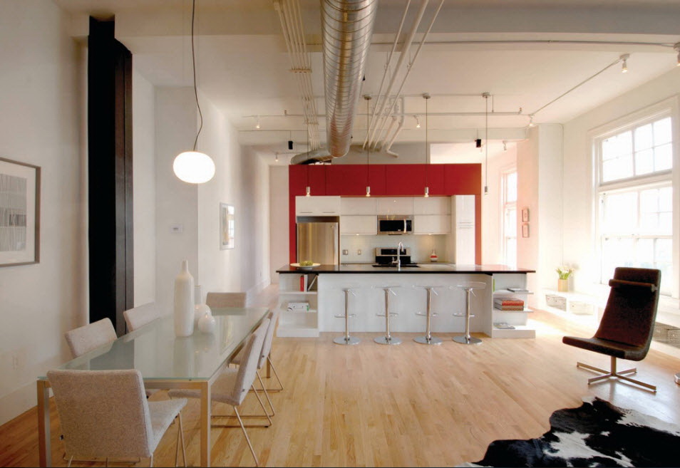 A suíte da cozinha de cor escarlate se destaca contra a sala branca. Entre o papel de parede branco escarlate mobiliário parece expressivo, traz facilidade. Graças à iluminação artificial, a superfície brilhante cria uma atmosfera festiva.