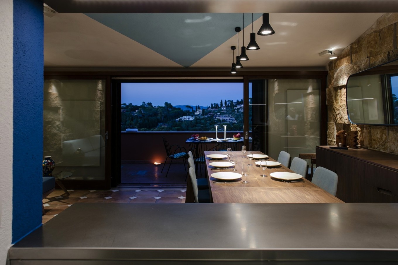 - Contraste. A sala é criada em duas cores contrastantes, traz a sensação de comemoração. Jogo alaranjado brilhante da cozinha, cortinas protegidas do azul do cornflower.