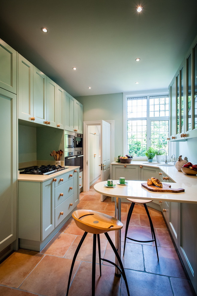 - Cozinha verde-laranja. A regra funciona - quanto mais brilhante for o tom laranja, mais rico deve ser o verde. Ao usar tons de abóbora ou pêssego, reduza o brilho do verde. Colamos as paredes com tons neutros para não sobrecarregar a composição.