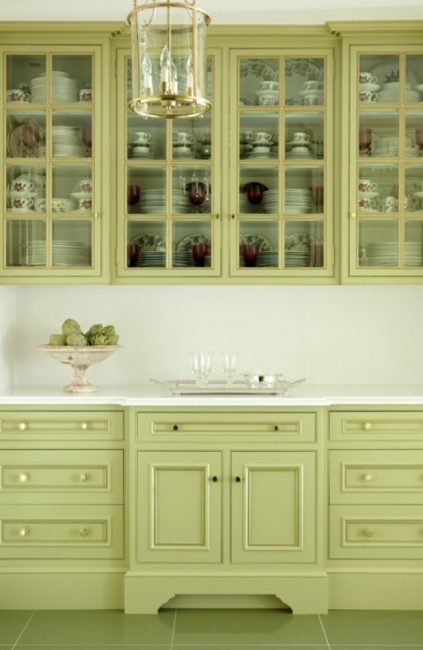A cozinha com um suave tom amarelo-esverdeado mantém o seu charme em qualquer luz, independentemente da iluminação natural ou artificial. É fácil colocar em ordem tal sala, porque não há manchas na superfície, nenhum arranhão é visível.