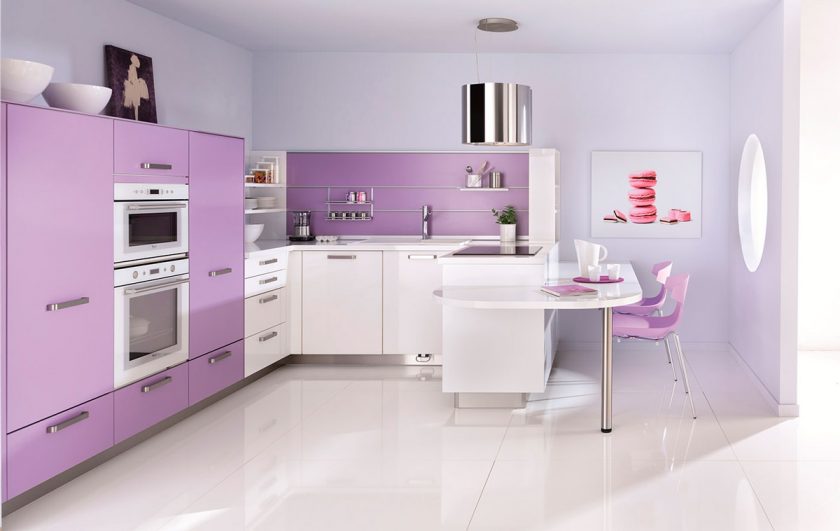 Em vez de violeta estrito, escolhemos um interior em tons lilás. Tons suaves transformarão a sala - darão frescor e vigor. Auricular lilás adequado, complementado bancada com padrões florais.