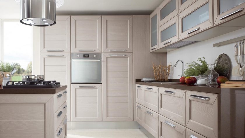 Armários luminosos decoram o interior, então você não pode usar a mesma cor para as paredes. Colamos papéis de parede e pintamos paredes em cores suaves - marfim, leite, aço ou limão claro.