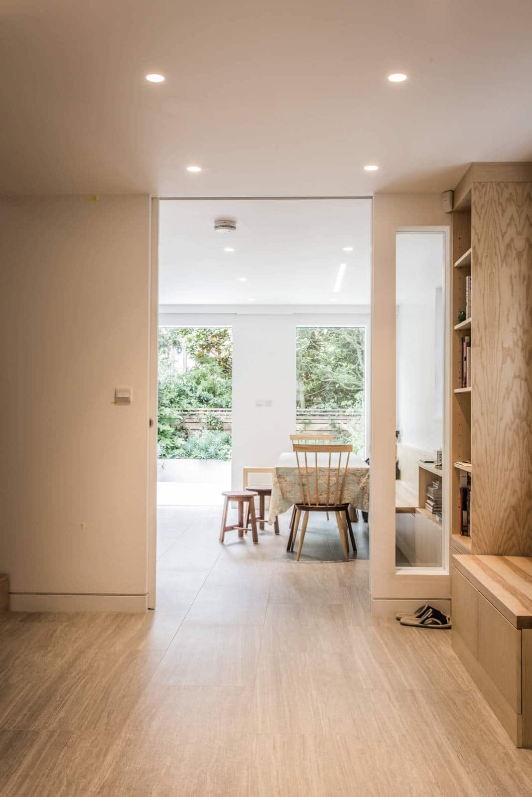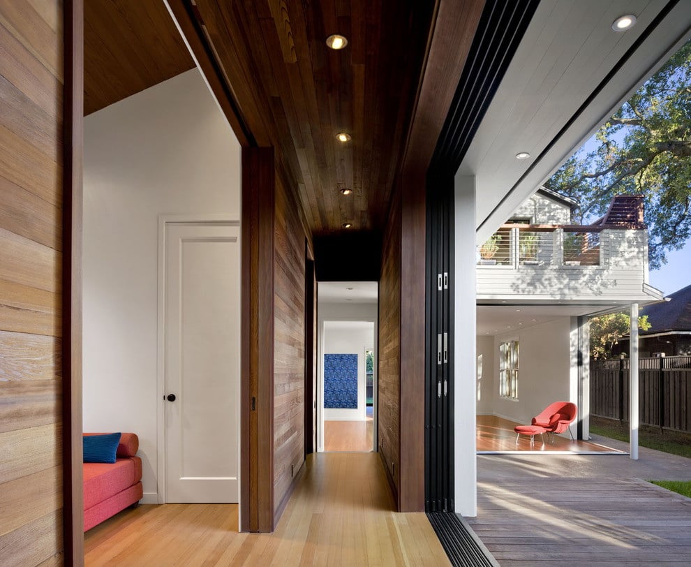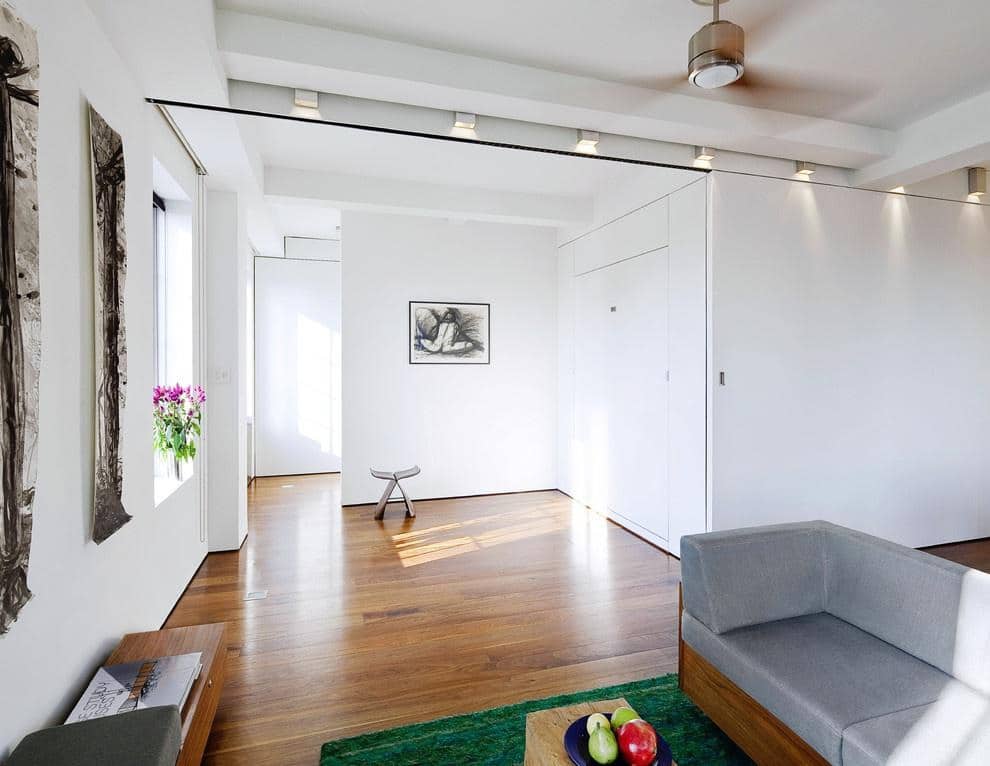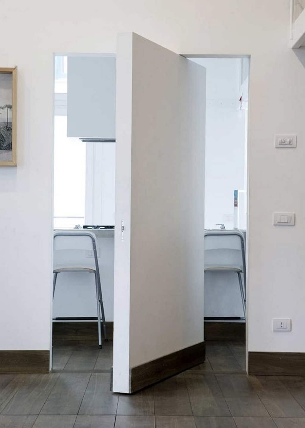 - Economia de espaço. Isso é mais óbvio. Em vez de alocar um medidor para abertura, você pode restringir-se a deixar alguns centímetros ao longo de cada parede perto dos batentes e mover silenciosamente a porta.