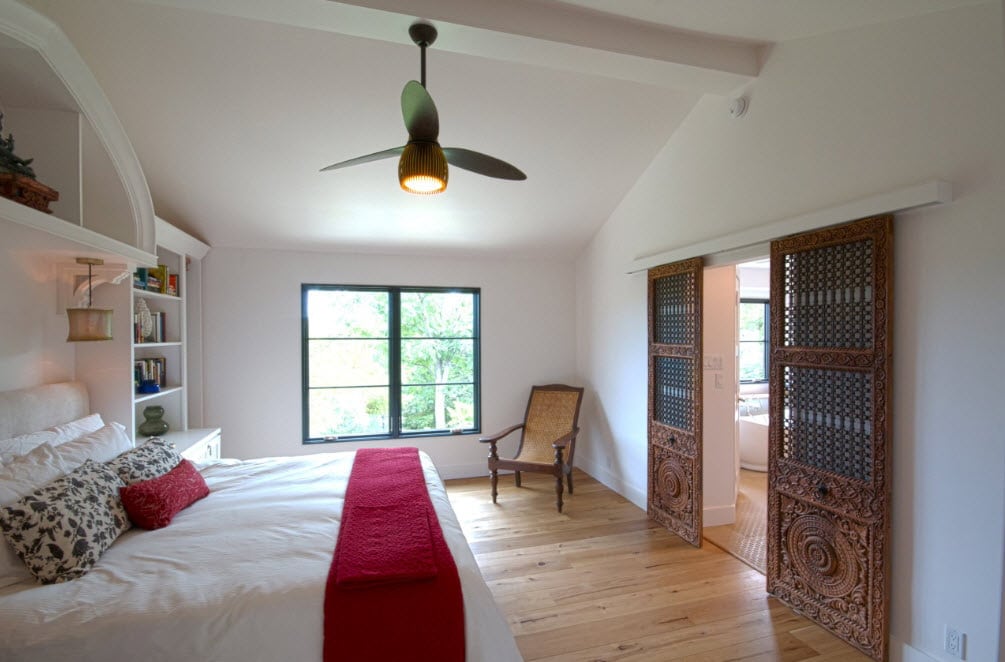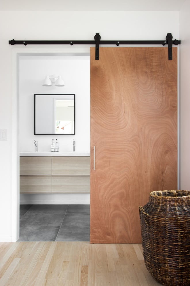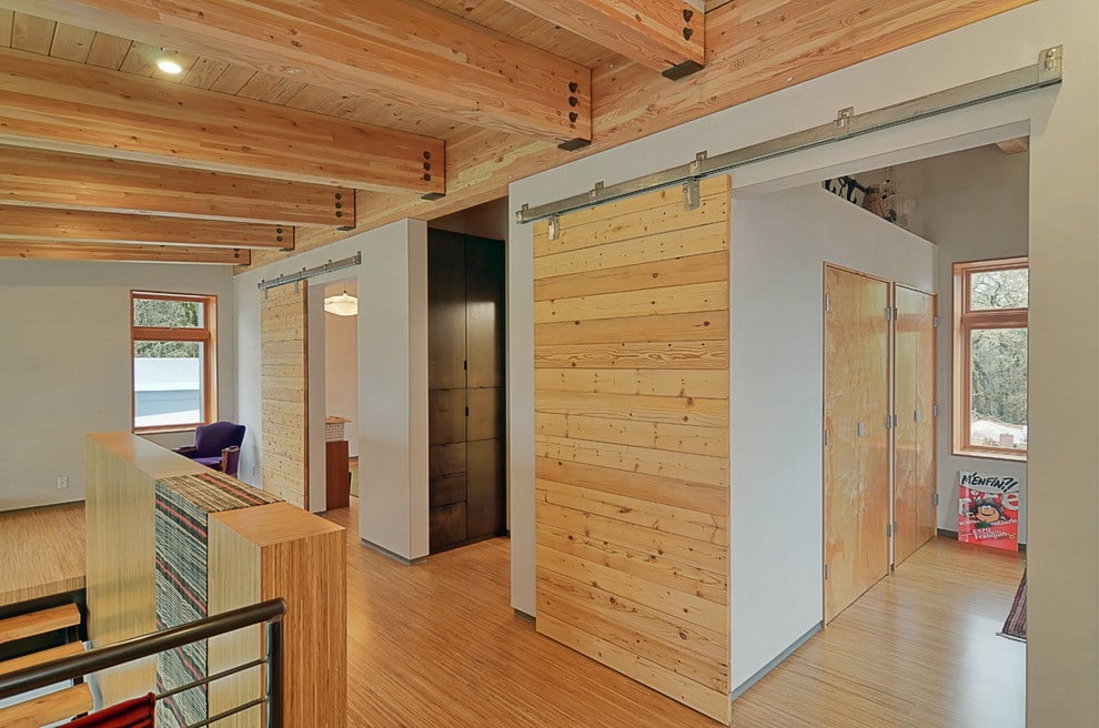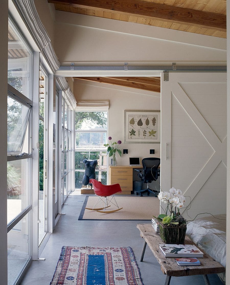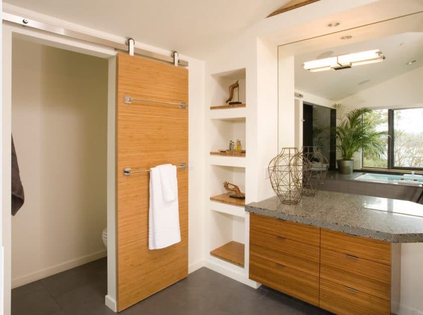 - Eco. Eco-design - madeira natural ou falso. Sem verniz visível, preservando a textura original, simplicidade deliberada. A solução original será uma porta de vidro com um padrão floral simples ou uma porta dobrável com elementos finos e quase de papel.