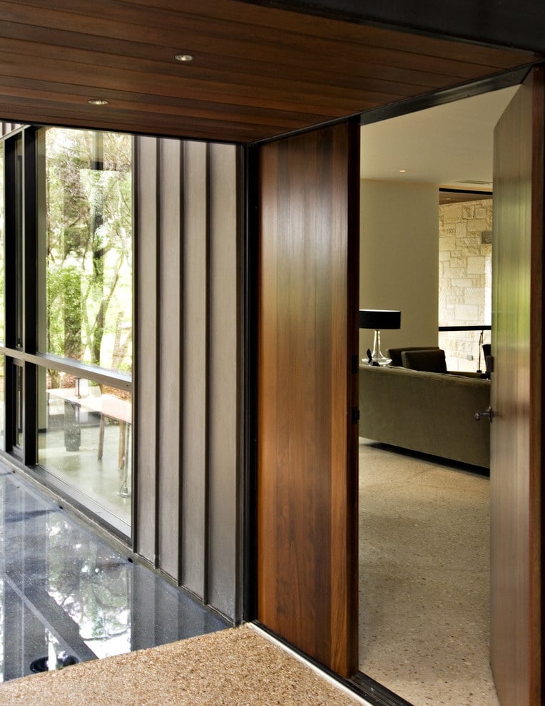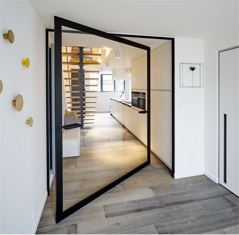 - Balançando. Relativamente desconfortável e ocupa ainda mais espaço que os regulares. Eles se abrem de uma vez em ambas as direções, dependendo de onde a pessoa vai empurrar. Eles raramente são usados em prédios residenciais porque não fornecem boa estanqueidade - não apenas pessoas passam facilmente através deles, mas também rascunhos, ruídos e calor. No entanto, existem amantes. Se você tem um apartamento no estilo de um loft ou de alta tecnologia - balançando "pêndulo" pode servi-lo em grande estilo.