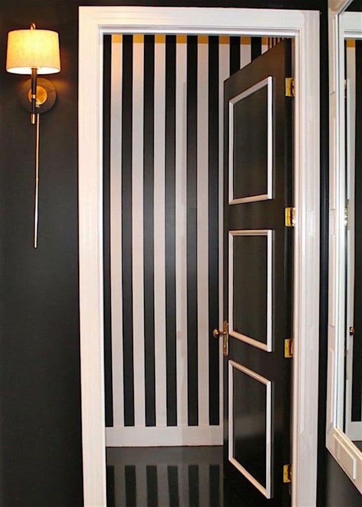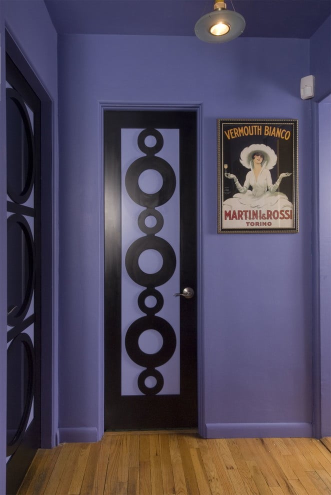 - Preto. Um clássico que permite algum descuido no cuidado, mas não se encaixa bem com tudo, exceto os interiores art deco, barroco e moderno. Parece bom em salas contrastantes, em combinação com mobiliário branco, piso branco. Mas ainda assim, a porta preta requer esforço - ela precisa se encaixar no interior.