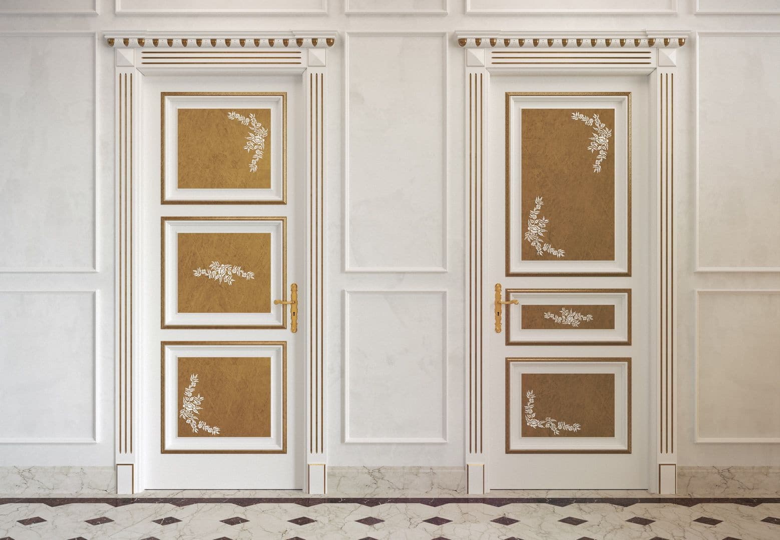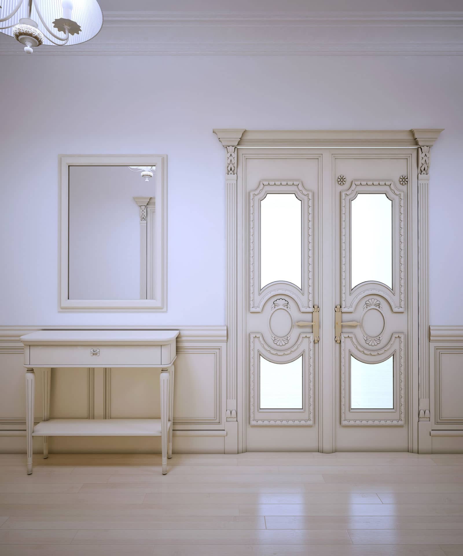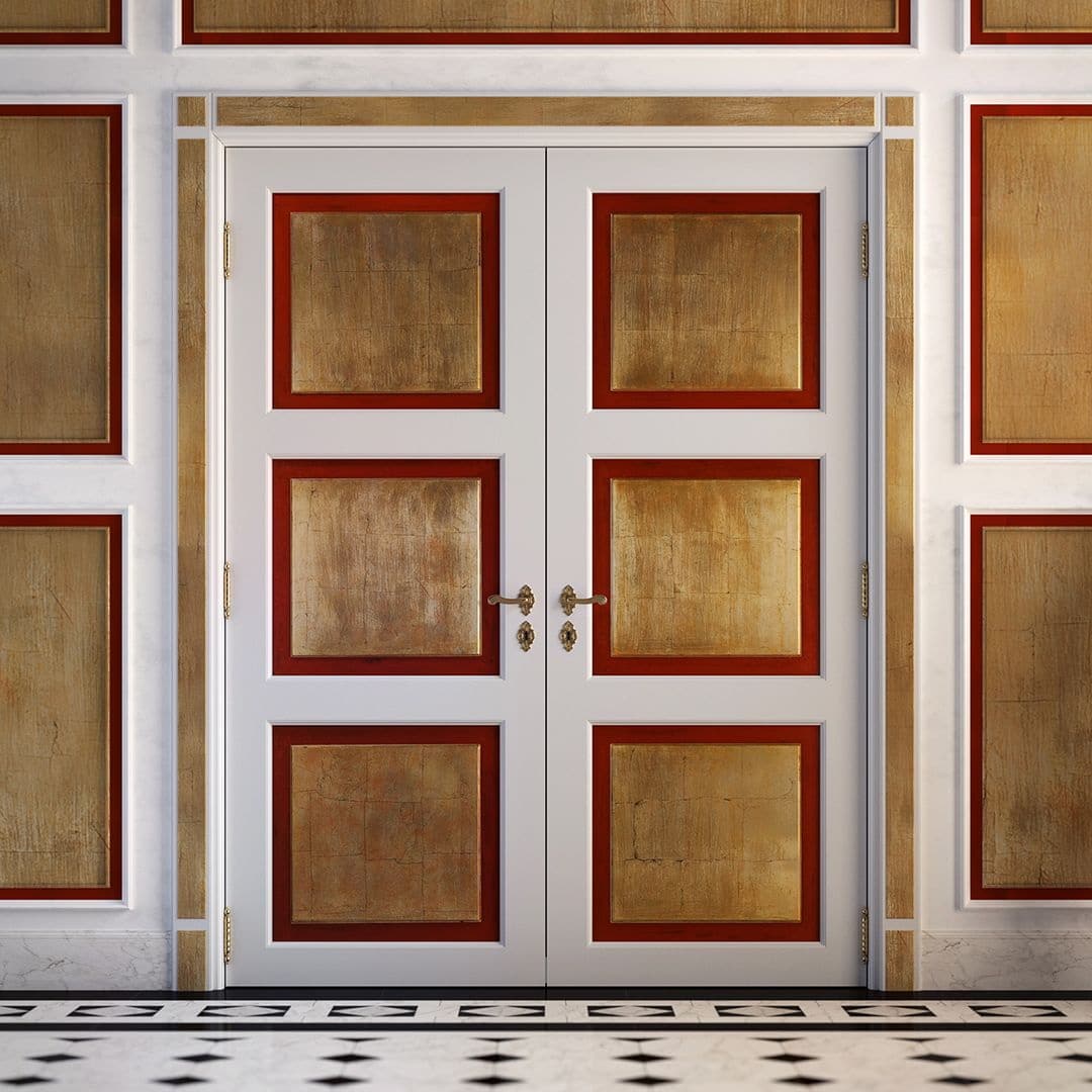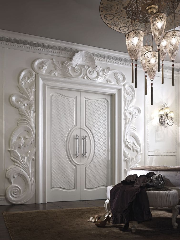 - Barroco. Pomposidade, algum pathos. Portas altas (podem ser portas duplas), elementos esculpidos, cor branca ou preta. Pode ser complementado com vitrais.