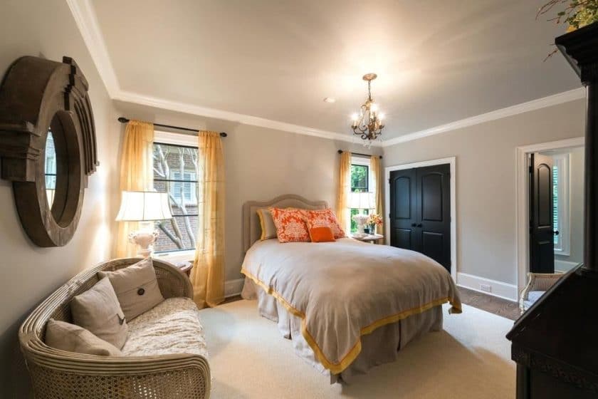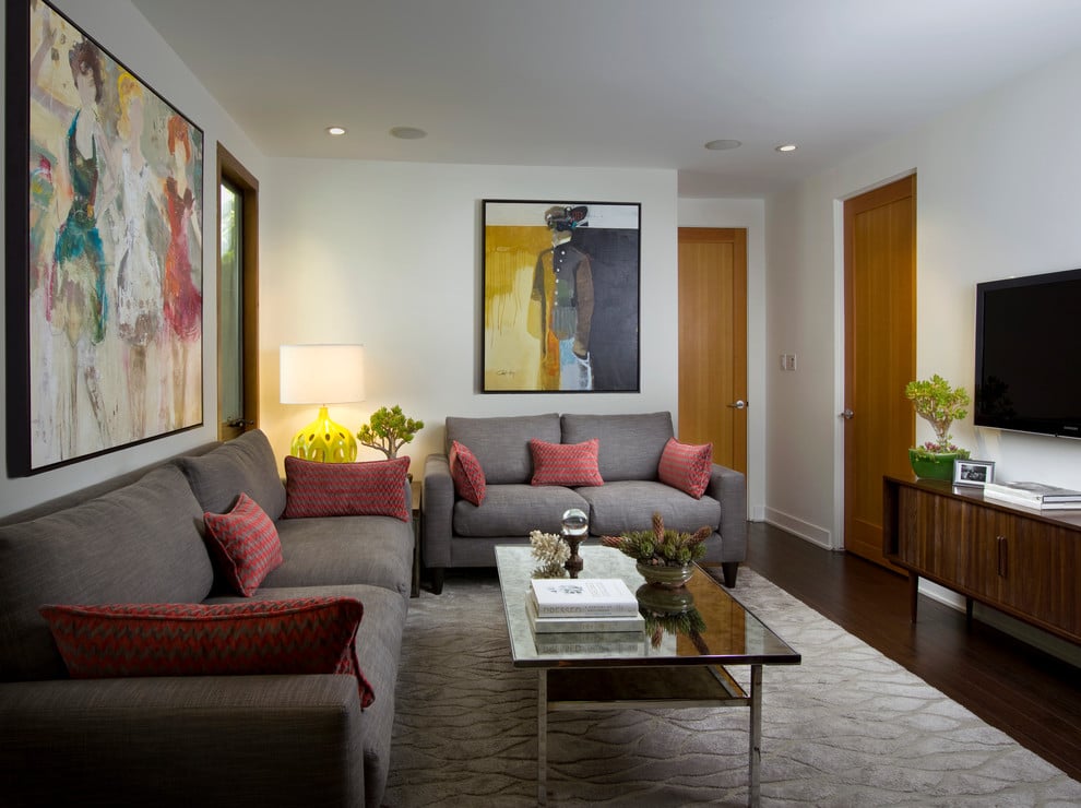 - Cores quentes brilhantes. Visualmente estreite a sala, mas ao mesmo tempo torne-a mais confortável.