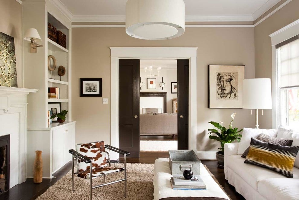 - Branco. Se encaixa bem em francês, Escandinavo o interior. Dá à sala alguma leveza, efemeridade, pureza. Requer cuidados mais cuidadosos do que outras cores - você precisa remover constantemente a poeira, certifique-se de que não haja manchas no revestimento, caso contrário a porta perderá rapidamente sua aparência elegante.