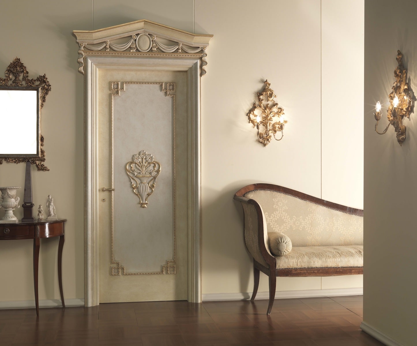 - Clássico. Para os clássicos - madeira natural com elementos esculpidos, lacados. Em casos raros - os elementos esculpidos em branco são adicionalmente dourados. Linhas retas estritas, forma geométrica regular.