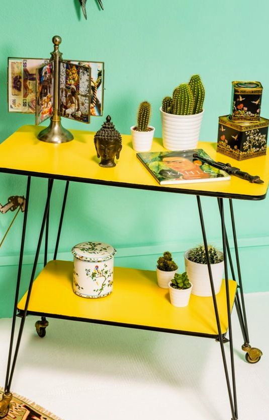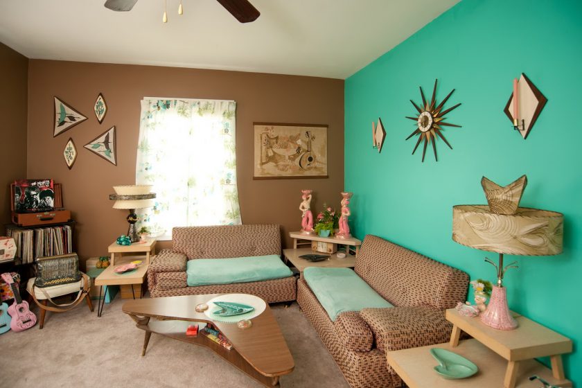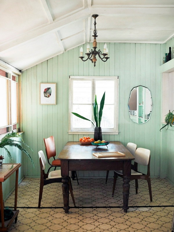A hortelã-pimenta era muito popular nos anos 1950, embora fosse usada com frequência nas décadas de 1930 e 1940. A cor é realmente elástica, muito popular hoje em dia. Muitas vezes você pode ver paredes verdes de menta em designs modernos. Muitas vezes aparece em acessórios modernos, especialmente em combinação com metálico.