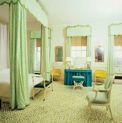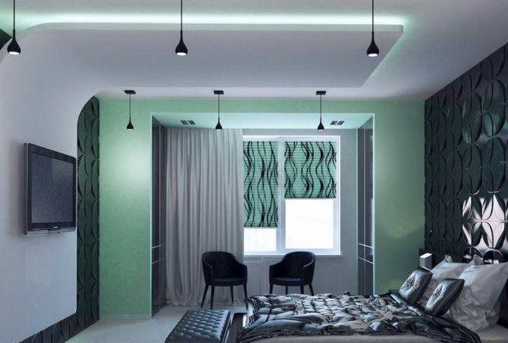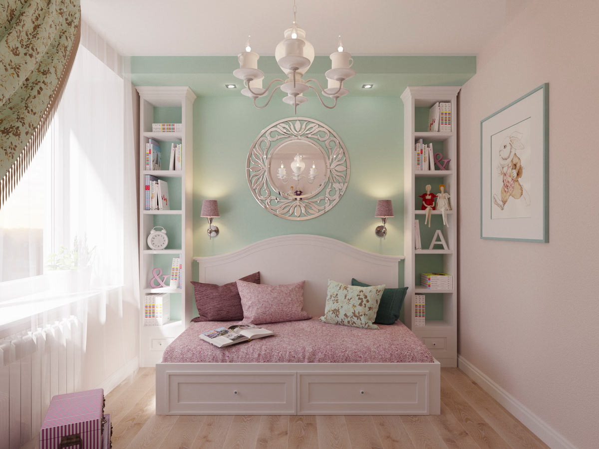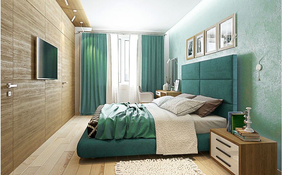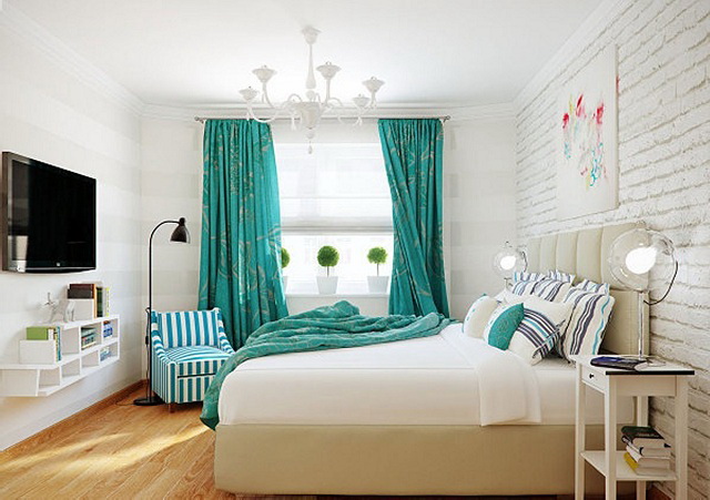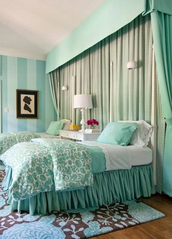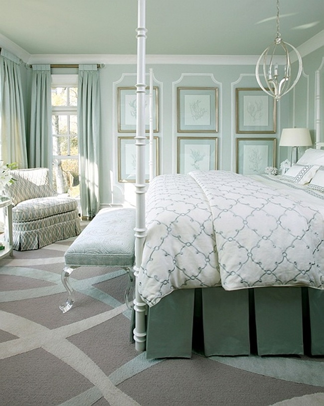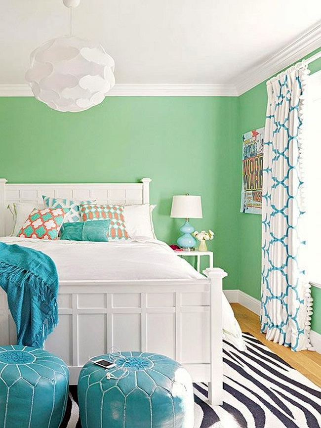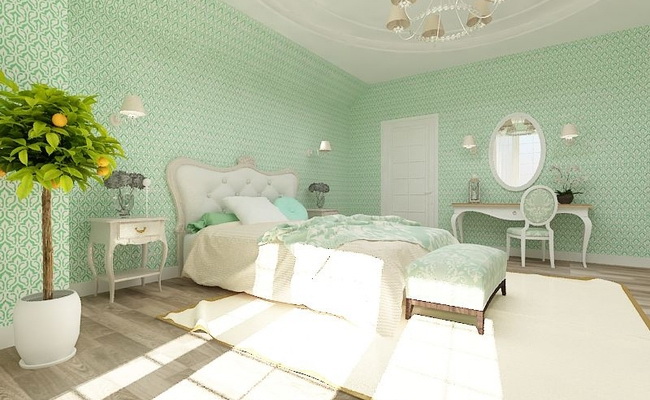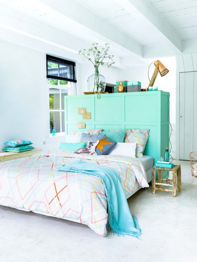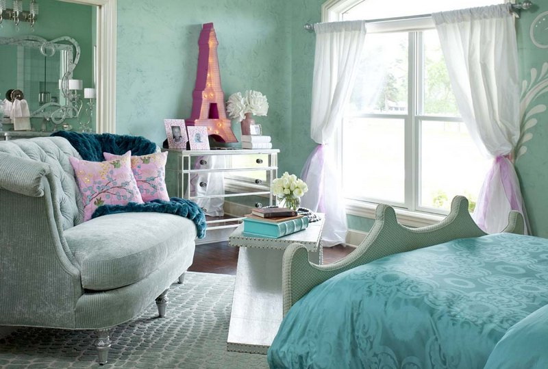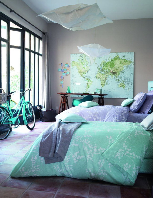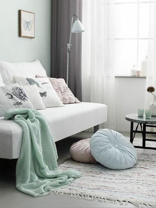 Em o quarto Você pode dizer olá ao sol, escolhendo hortelã para os têxteis. É útil experimentá-lo com um efeito relaxante para colchas, roupa de cama, cortinas, travesseiros. Quando se trata do quarto, a maquiagem vintage ou country não será ruim.