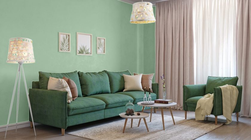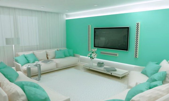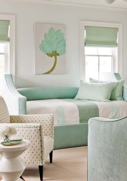 Na sala de estar você tem a oportunidade de usá-lo em todos os lugares, começando com a decoração do sofá com a ajuda de travesseiros mentol verdes, escolhendo acessórios de hortelã, usando hortelã nas cortinas para mudar a atmosfera da sala. Ou sinta a sensação de frescor, escolhendo vegetação para as paredes.