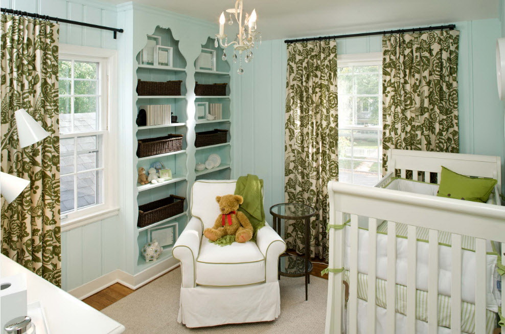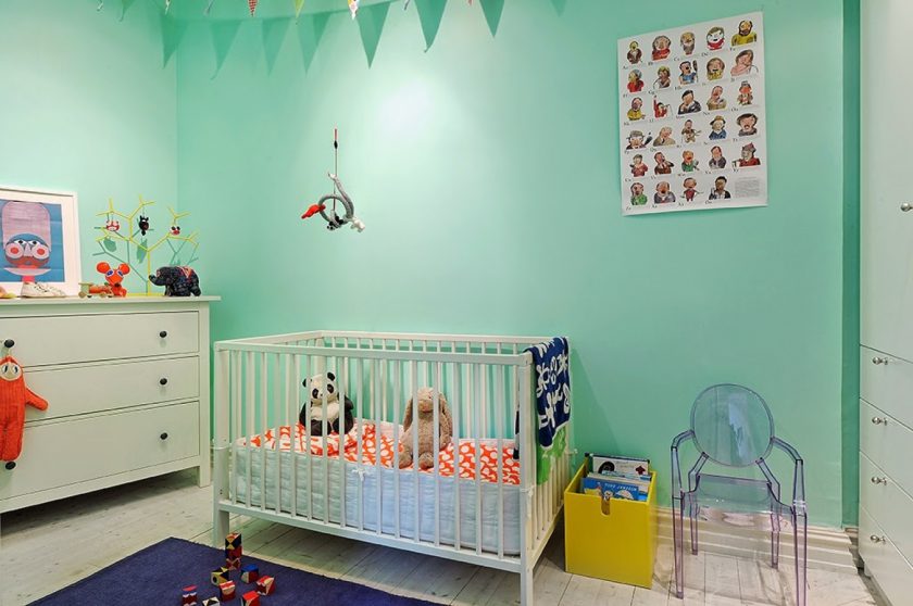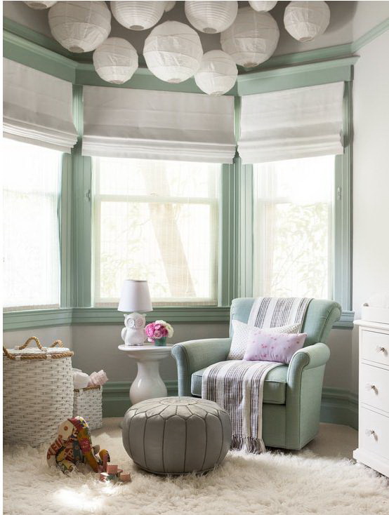 A cor da menta combina o poder calmante do azul com o poder nutricional do verde, por isso a simbiose de ambas as cores faz um tom sereno que é ideal para o berçário. Um tom verde reduz a ansiedade da criança, proporcionando uma profunda sensação instintiva de bem-estar físico. Os tons azuis relaxam a mente e o corpo, e seu efeito na redução física da pressão sangüínea, da freqüência cardíaca e da respiração foi comprovado Tudo isso é necessário para garantir um sono bom e saudável para a criança..