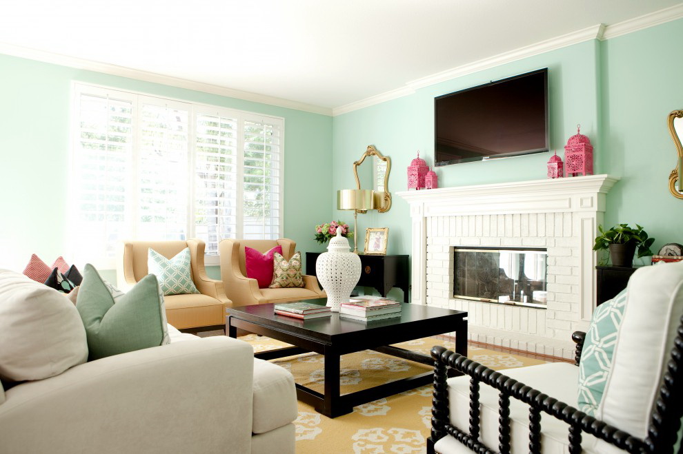 Numa sala onde já existem elementos de menta, as cortinas pastel contribuem para a coesão do esquema de cores.