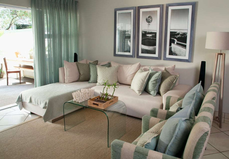 - Sofá de hortelã pastel é um toque de moda que pode acomodar qualquer sala de estar.