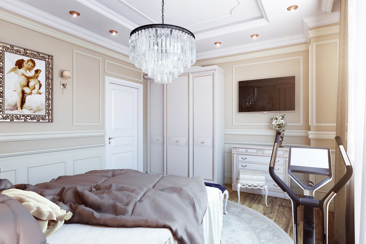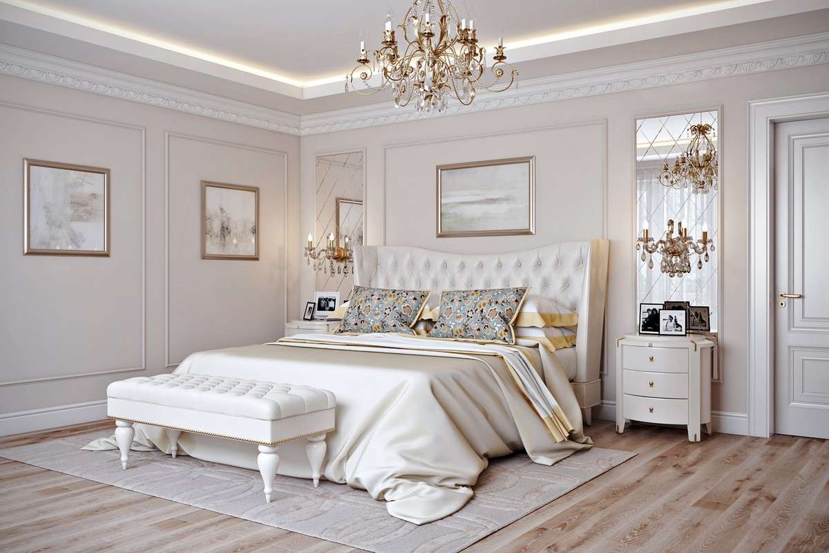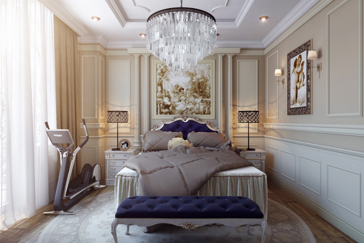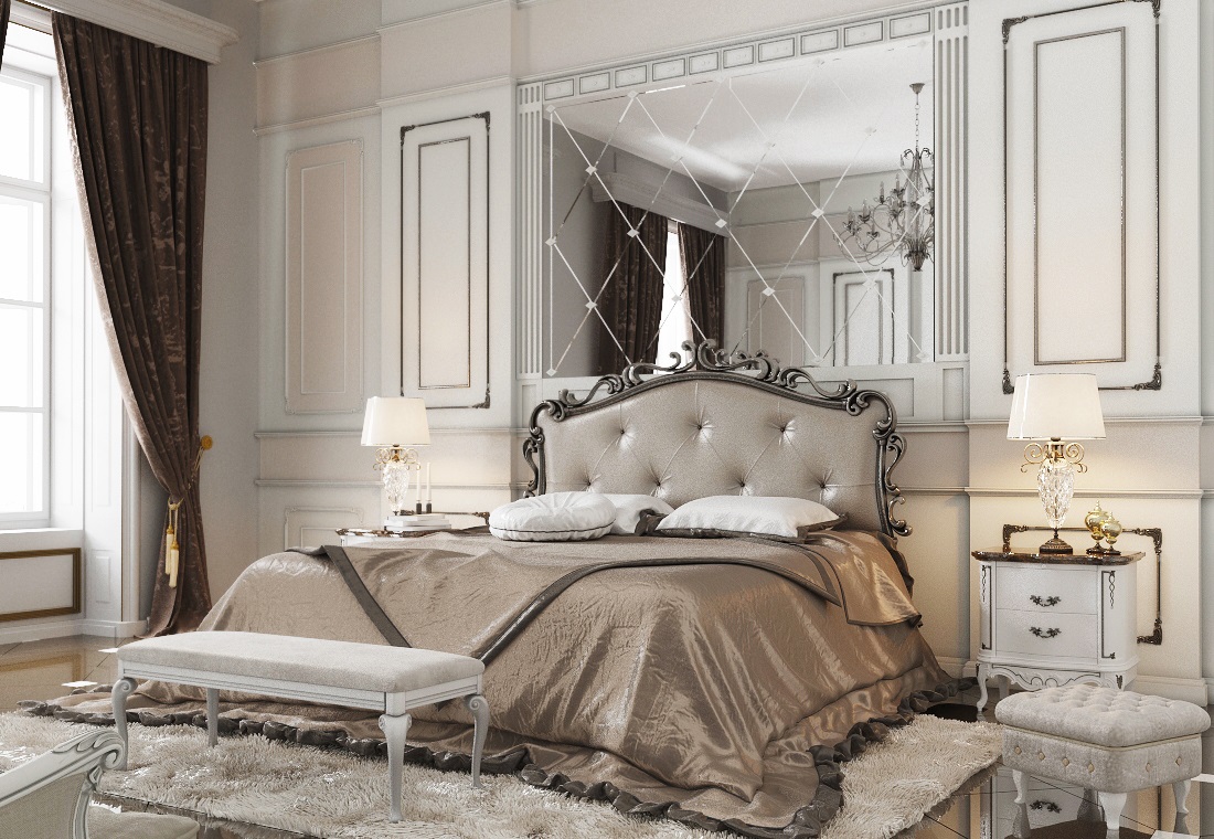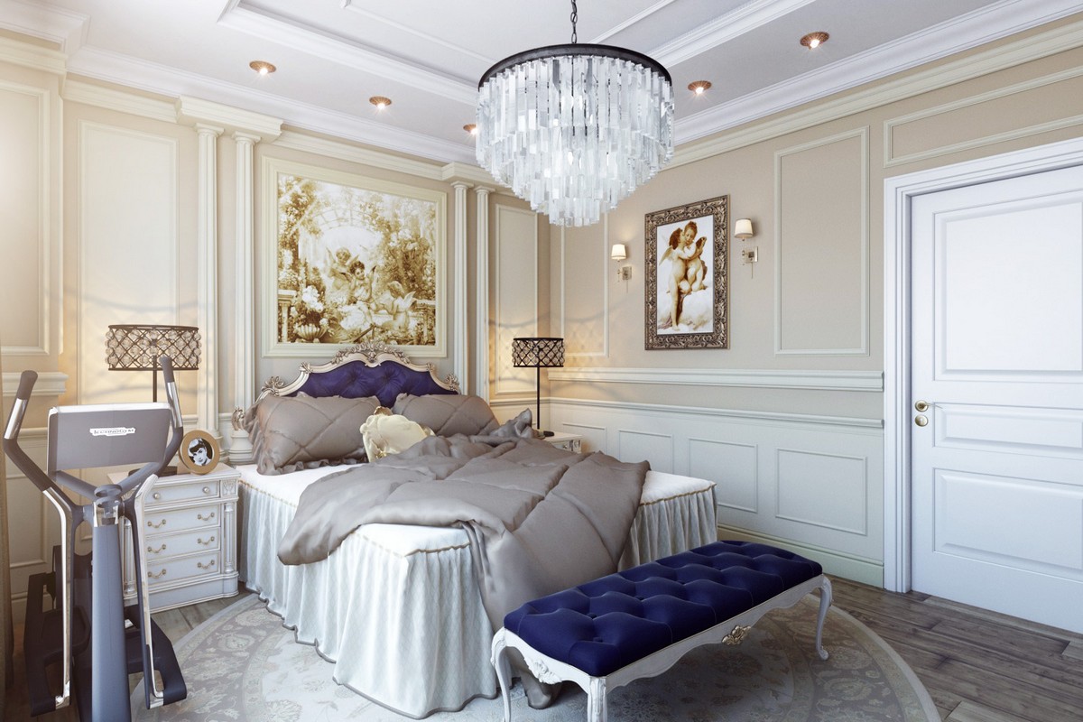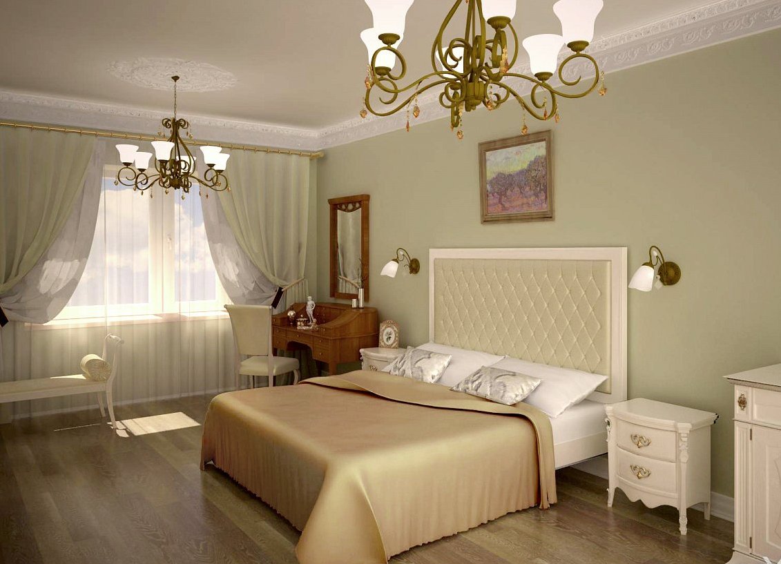 O desejo de decorar o quarto no interior do neoclássico é pensado em detalhes. Primeiro faça uma lista de móveis confortáveis, são determinados com materiais para decoração e decoração. Pompa excessiva vai estragar a impressão do quarto, então eles seguem a medida.