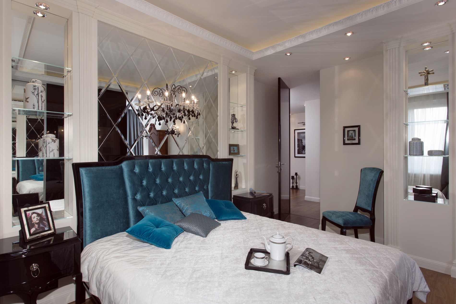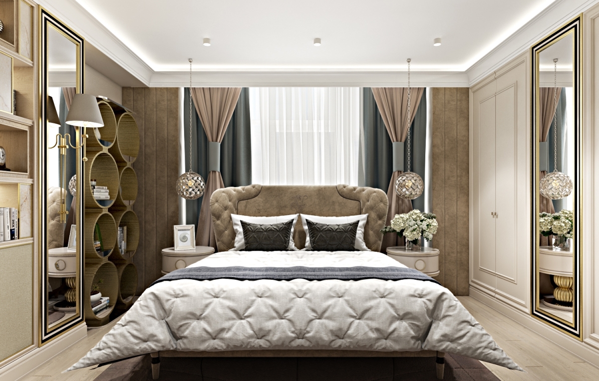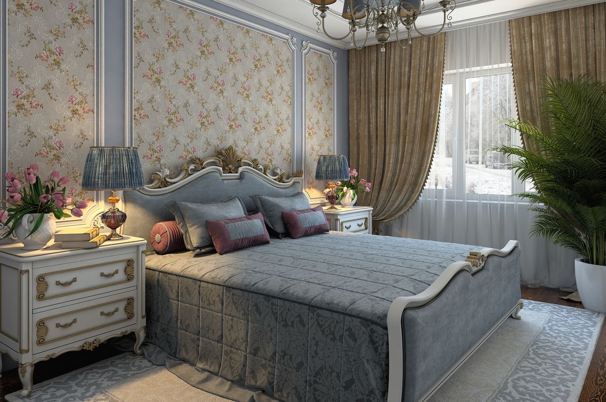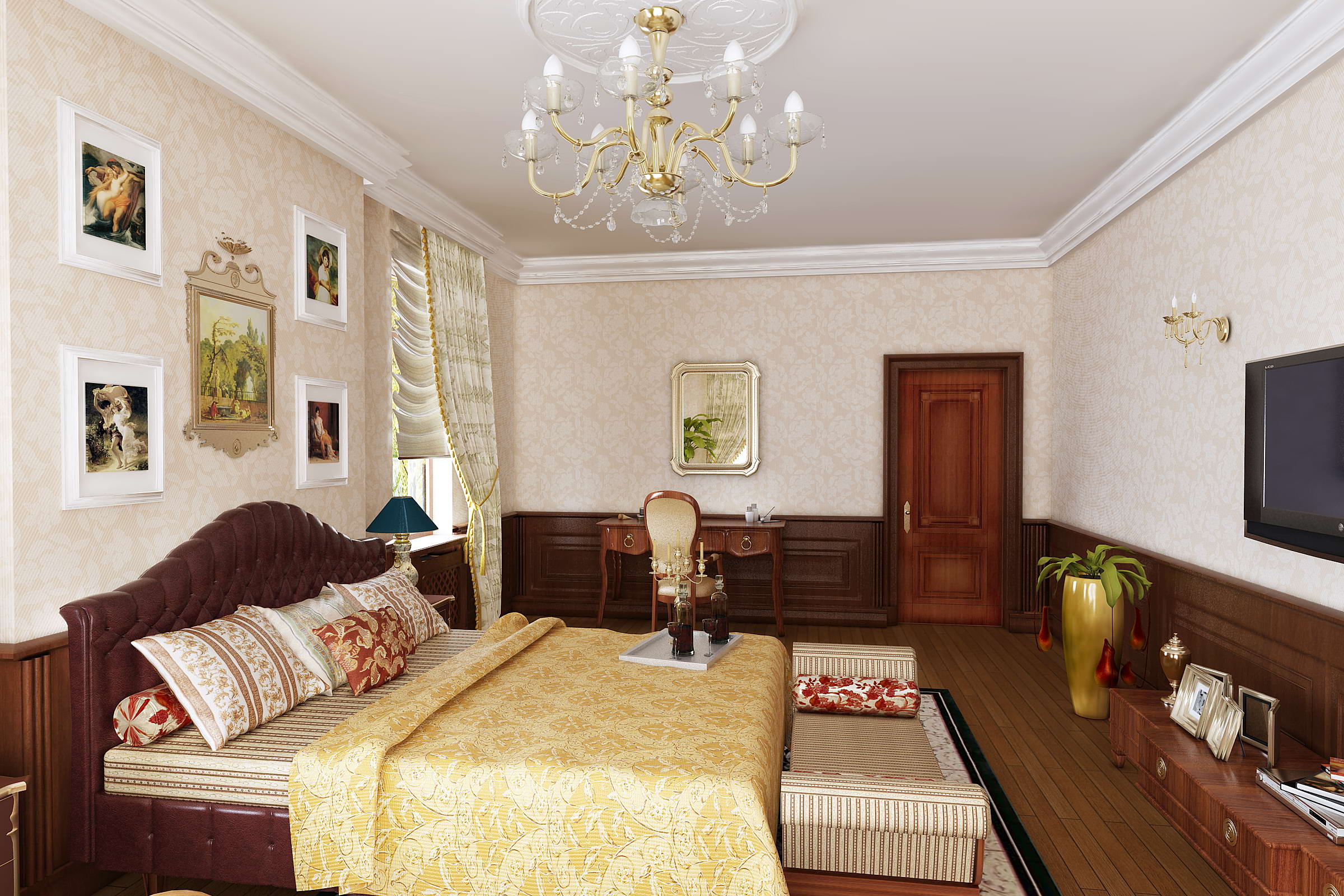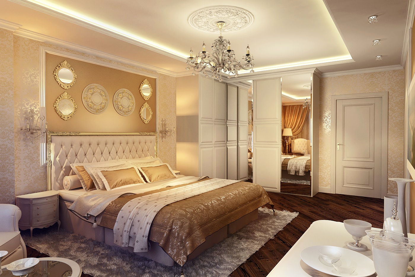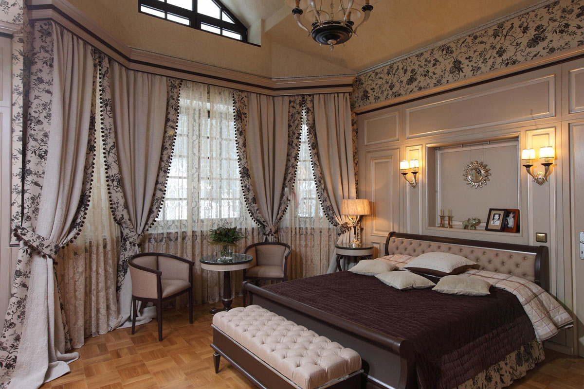 O desejo de decorar o quarto no interior do neoclássico é pensado em detalhes. Primeiro faça uma lista de móveis confortáveis, são determinados com materiais para decoração e decoração. Pompa excessiva vai estragar a impressão do quarto, então eles seguem a medida.