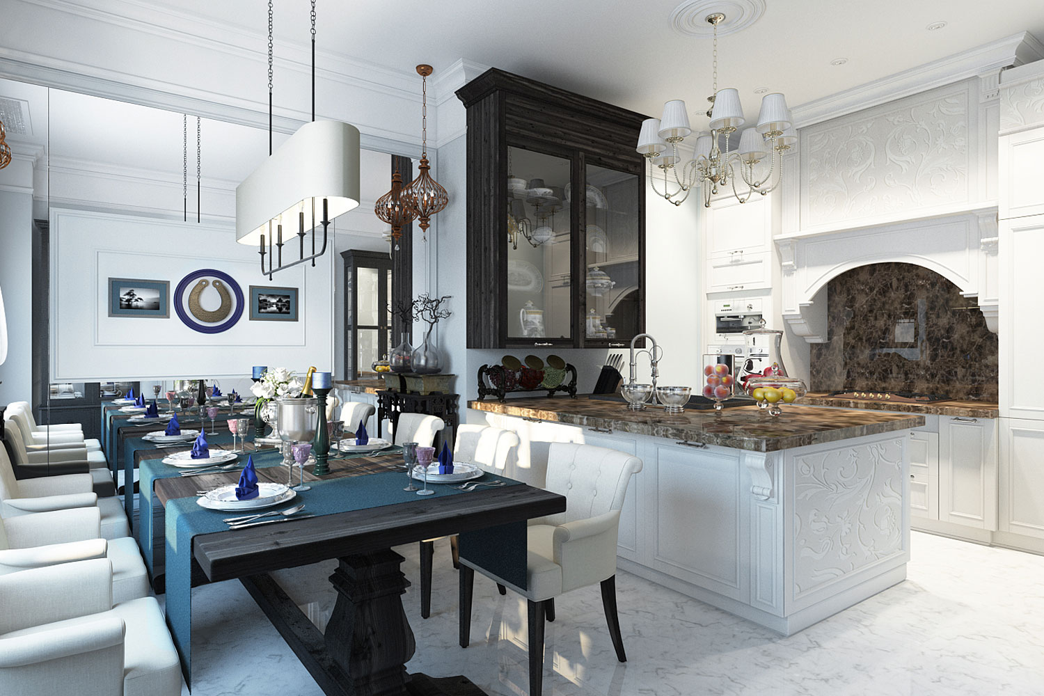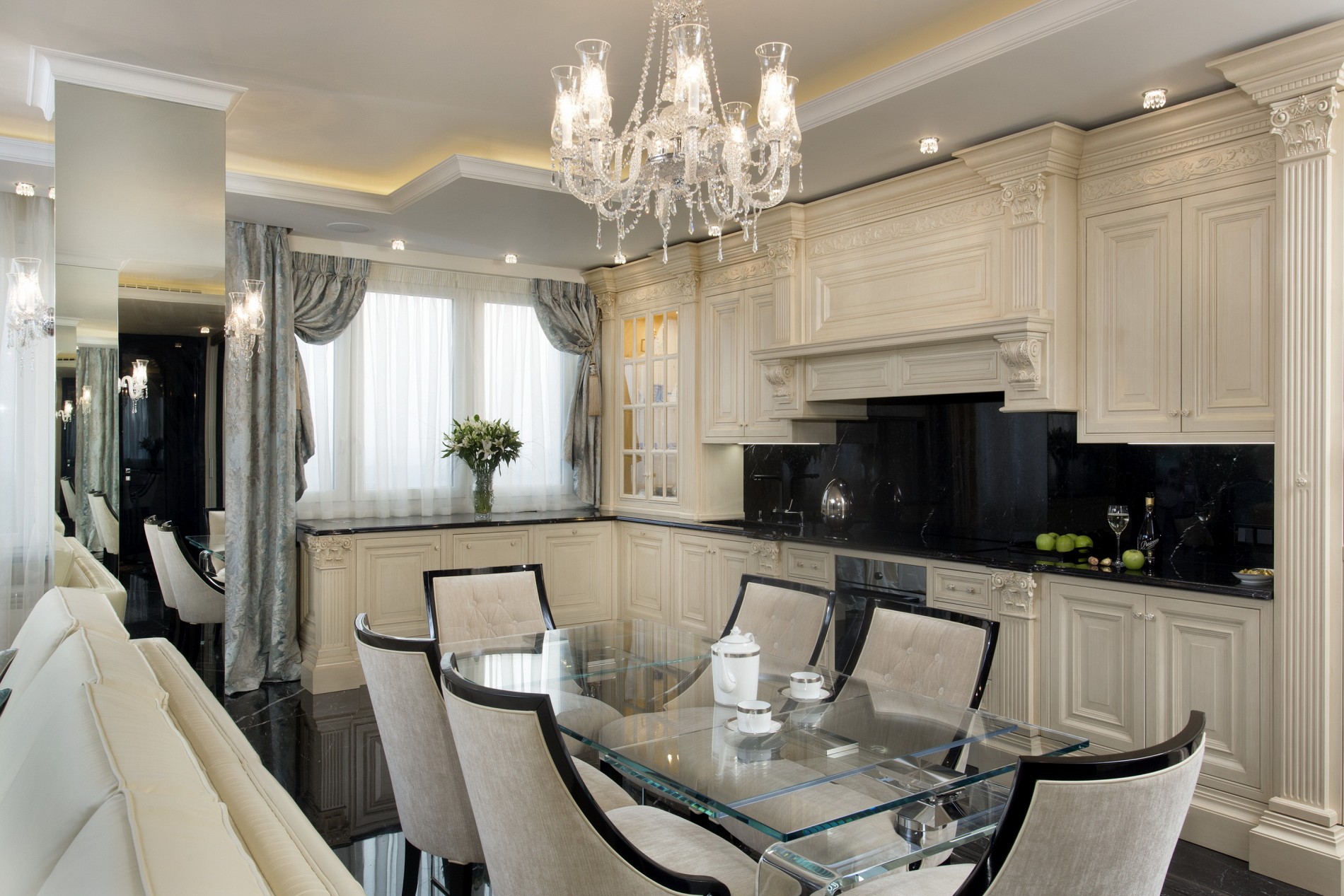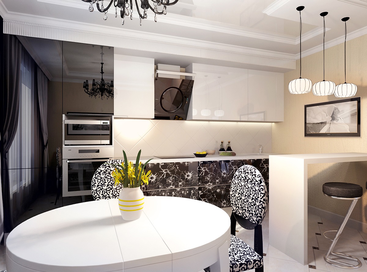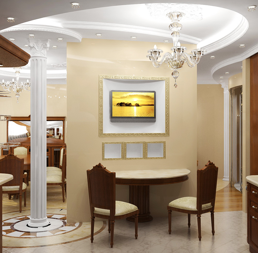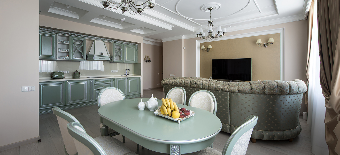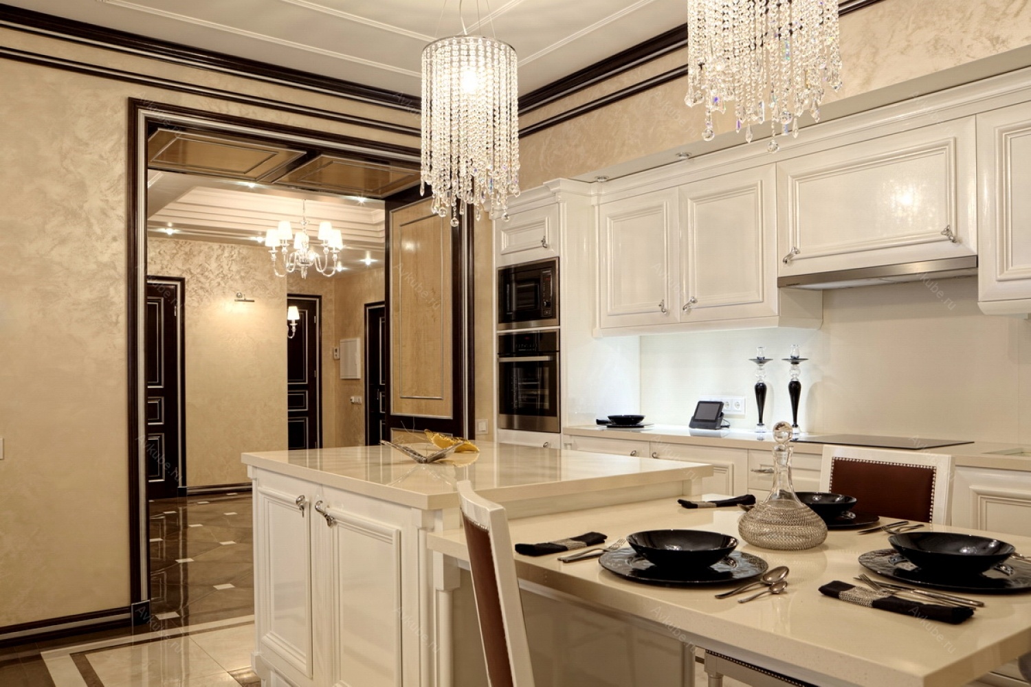 O neoclassicismo sugere quartos espaçosos com tetos altos. Se a sala de jantar a cozinha e sala de estar pequeno, é melhor combiná-los em um quarto. Cozinha no centro, pegando o resto da mobília debaixo dela.