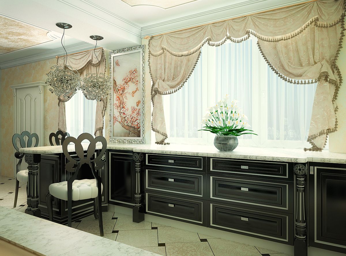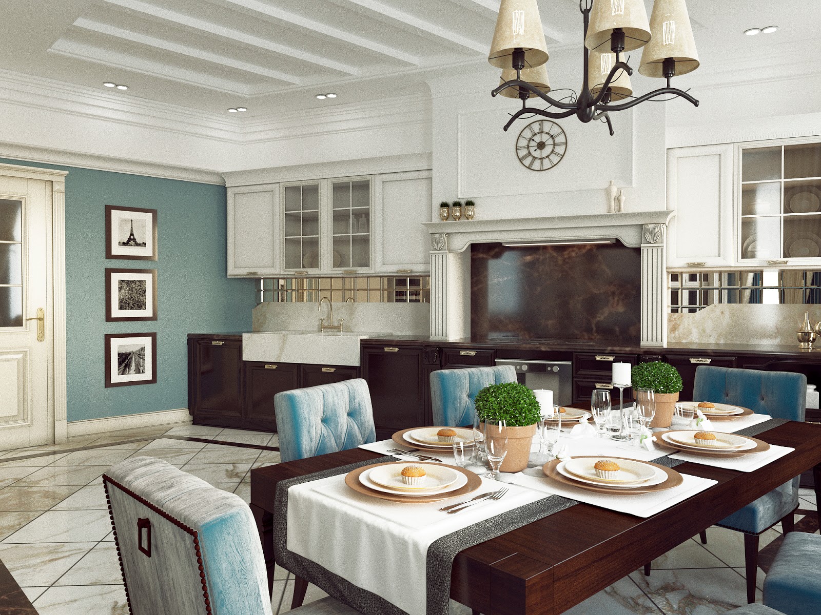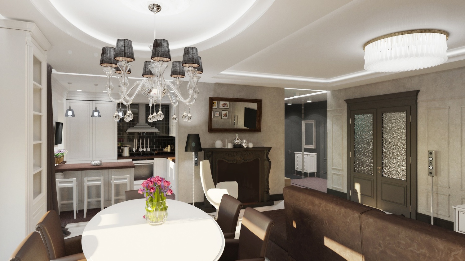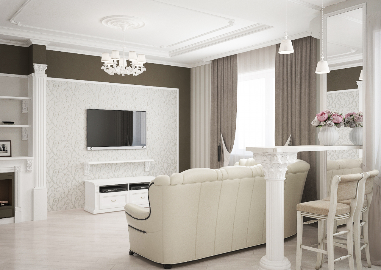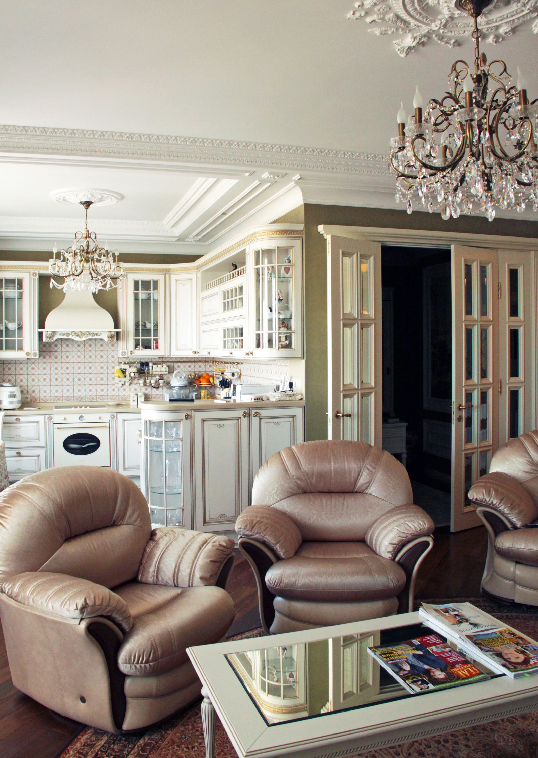 O neoclassicismo sugere quartos espaçosos com tetos altos. Se a sala de jantar a cozinha e sala de estar pequeno, é melhor combiná-los em um quarto. Cozinha no centro, pegando o resto da mobília debaixo dela.