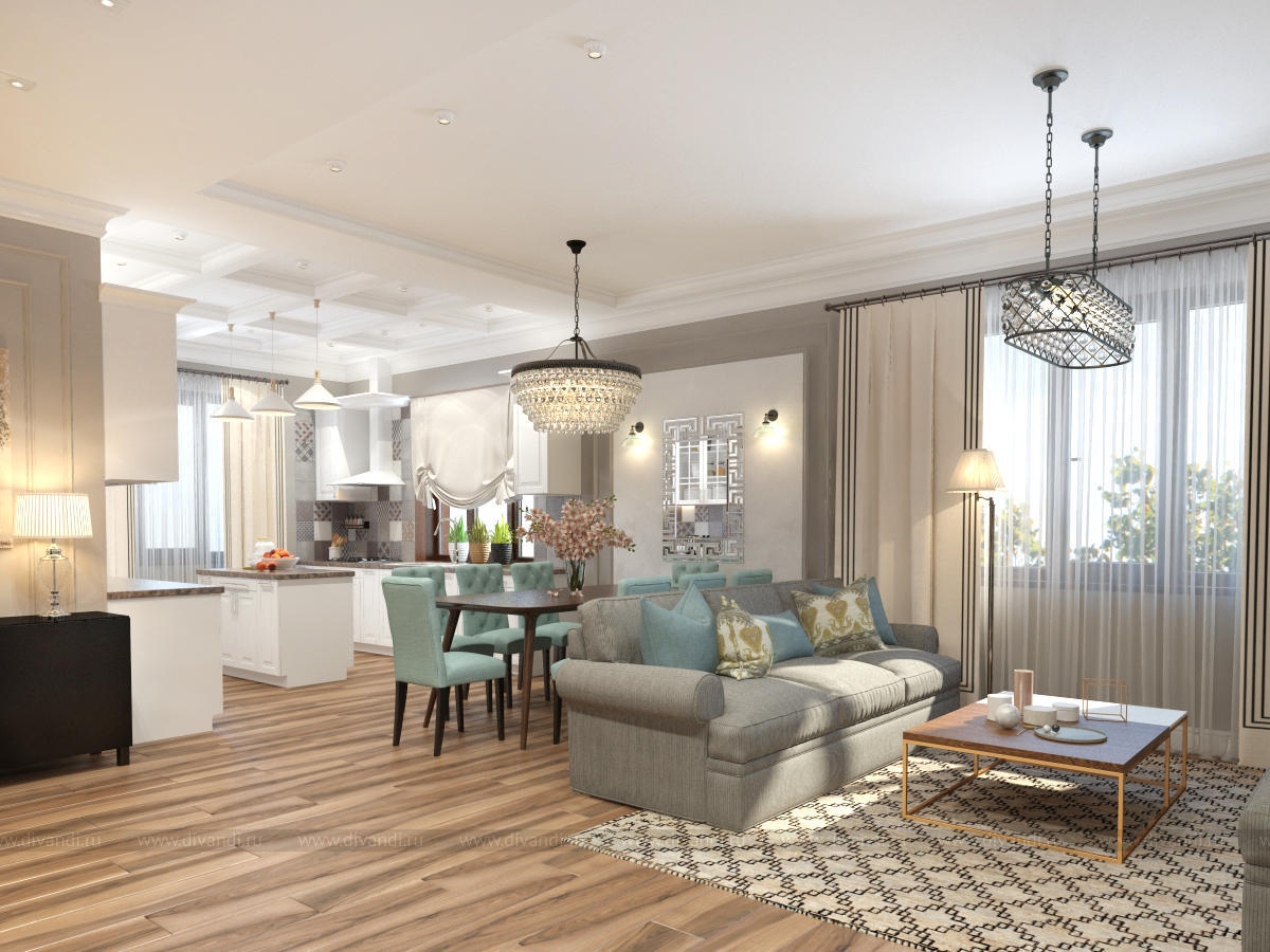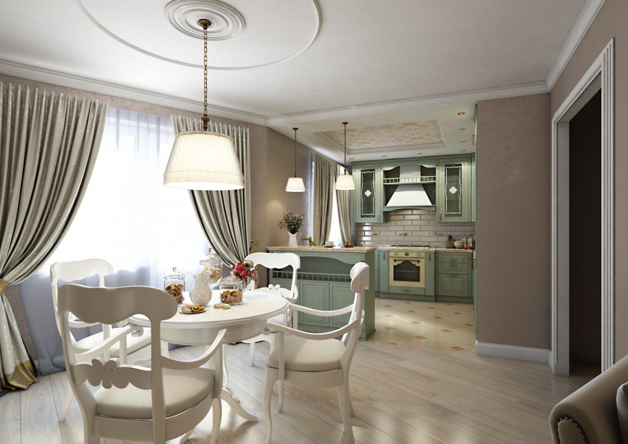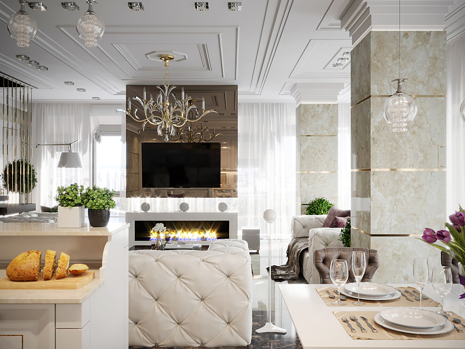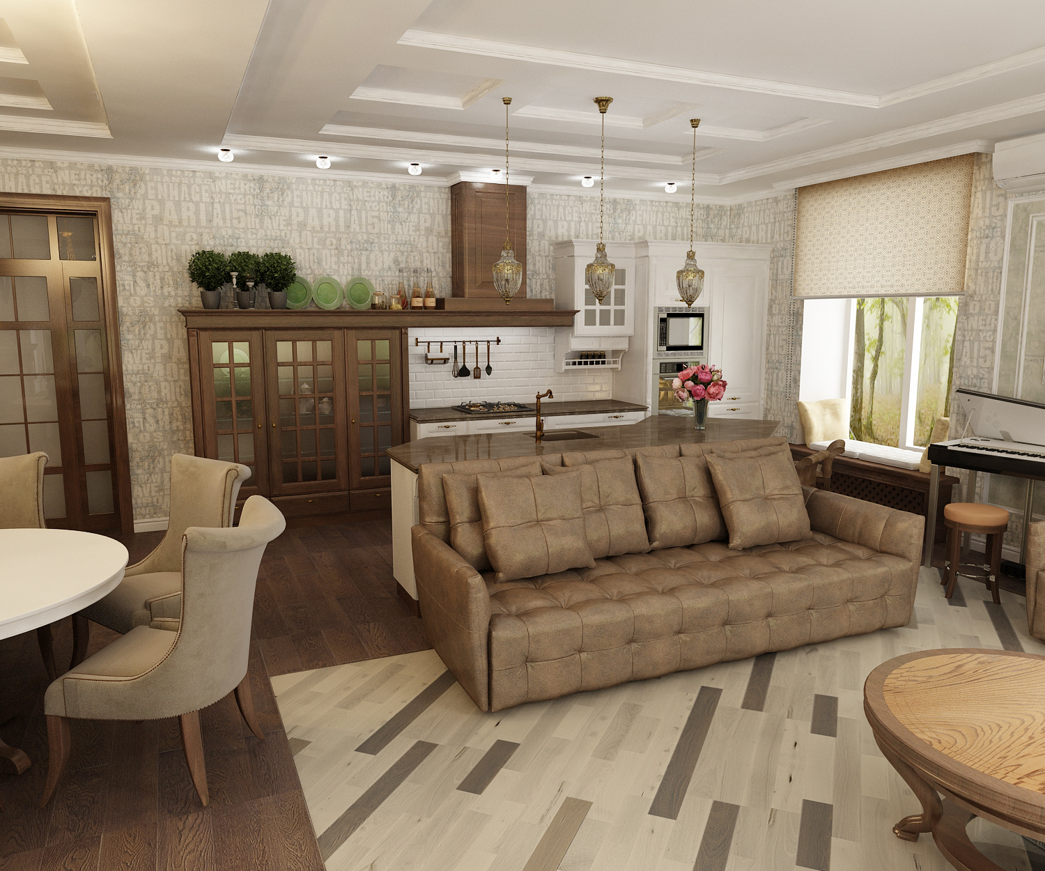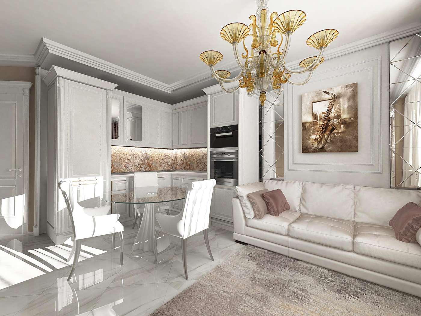 O neoclassicismo sugere quartos espaçosos com tetos altos. Se a sala de jantar a cozinha e sala de estar pequeno, é melhor combiná-los em um quarto. Cozinha no centro, pegando o resto da mobília debaixo dela.