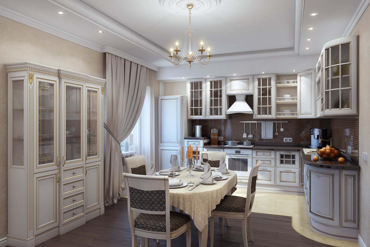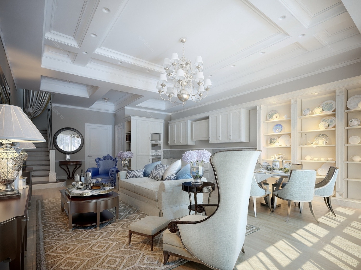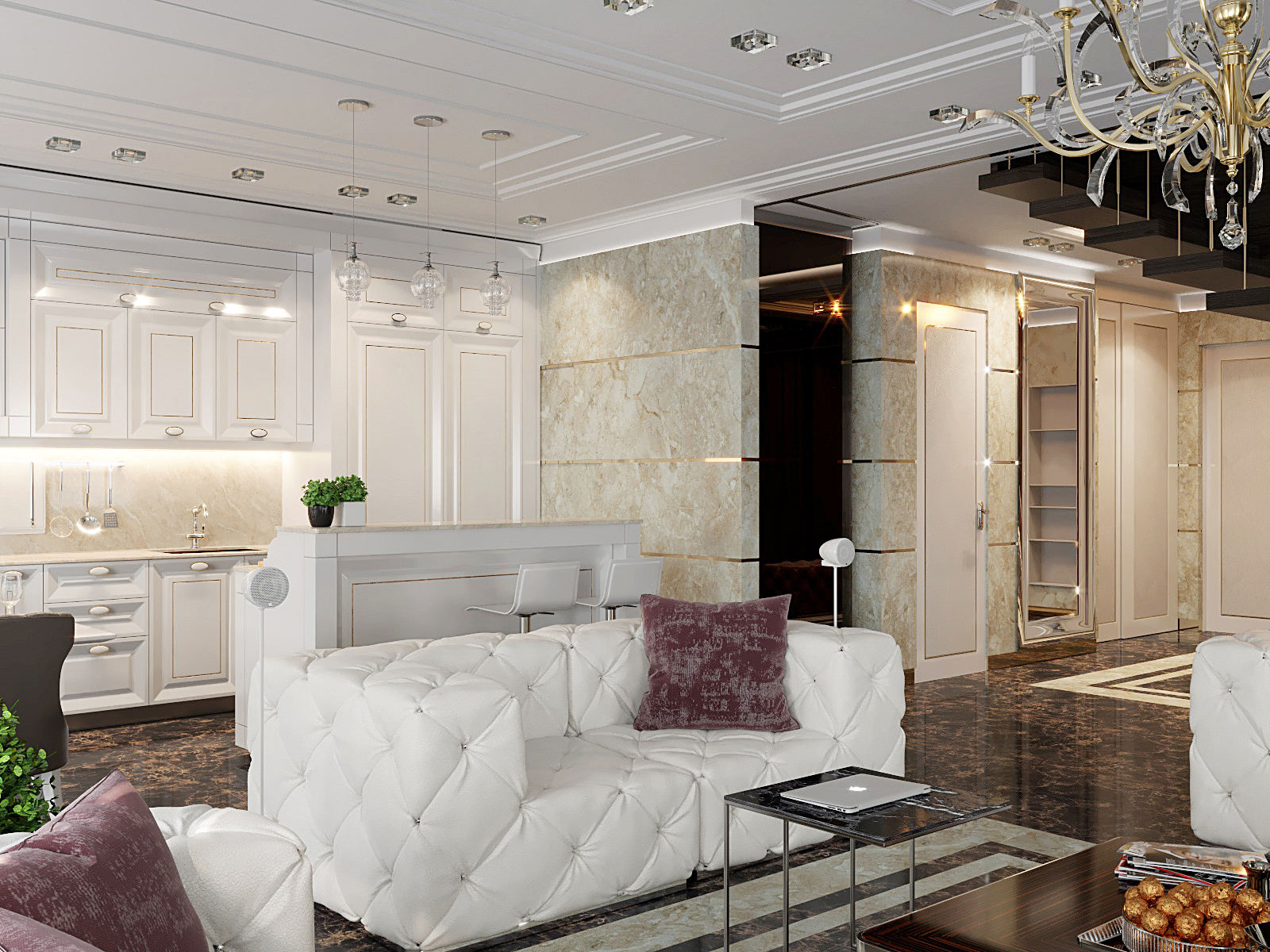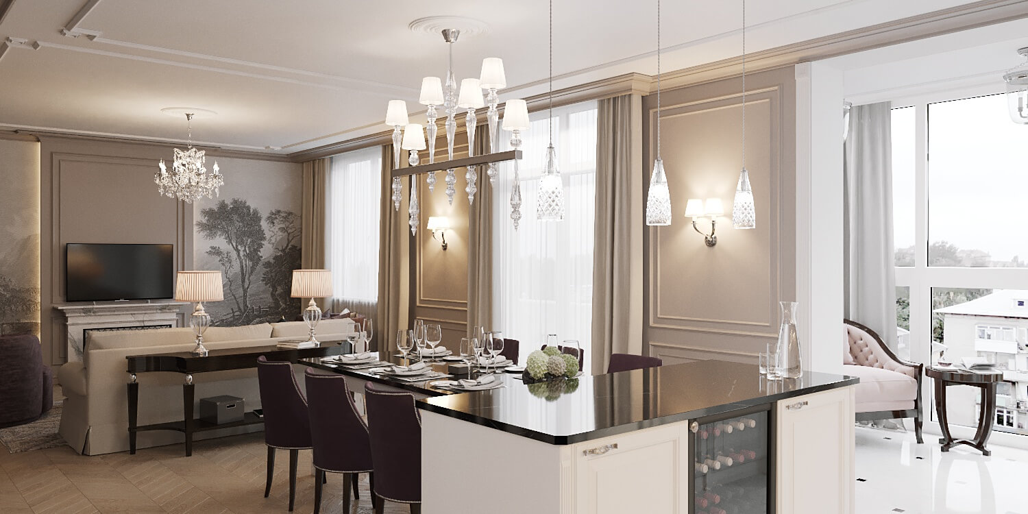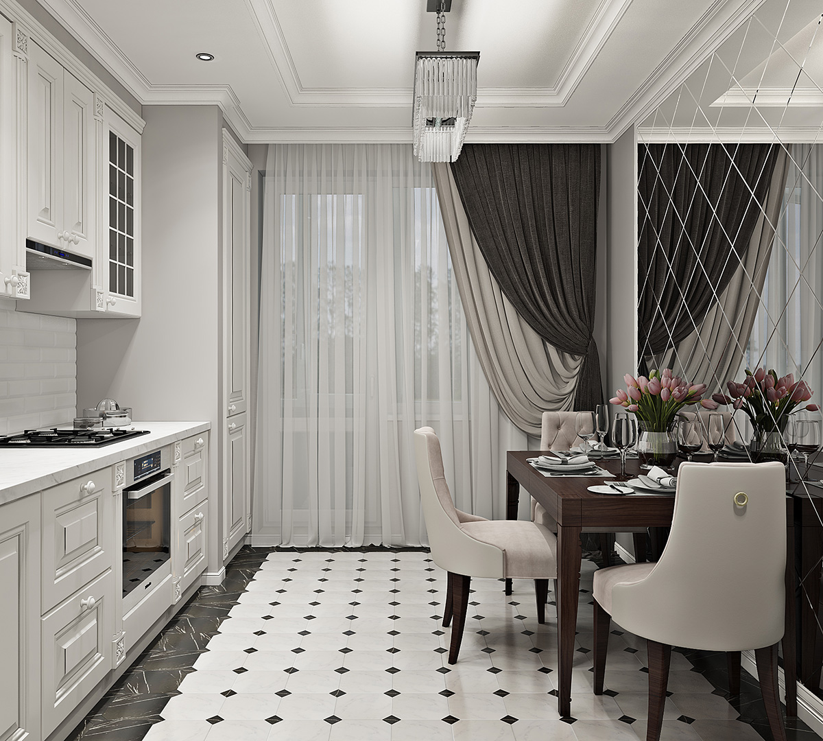 O neoclassicismo sugere quartos espaçosos com tetos altos. Se a sala de jantar a cozinha e sala de estar pequeno, é melhor combiná-los em um quarto. Cozinha no centro, pegando o resto da mobília debaixo dela.