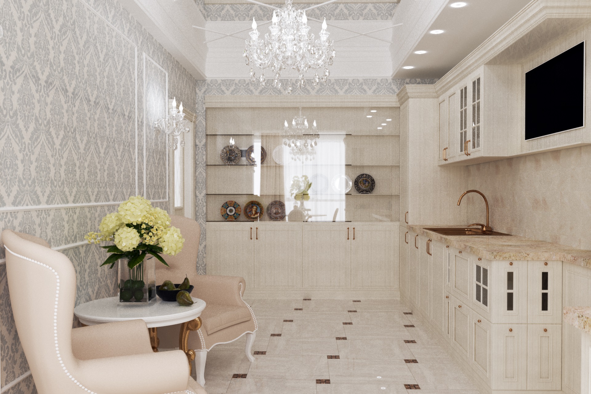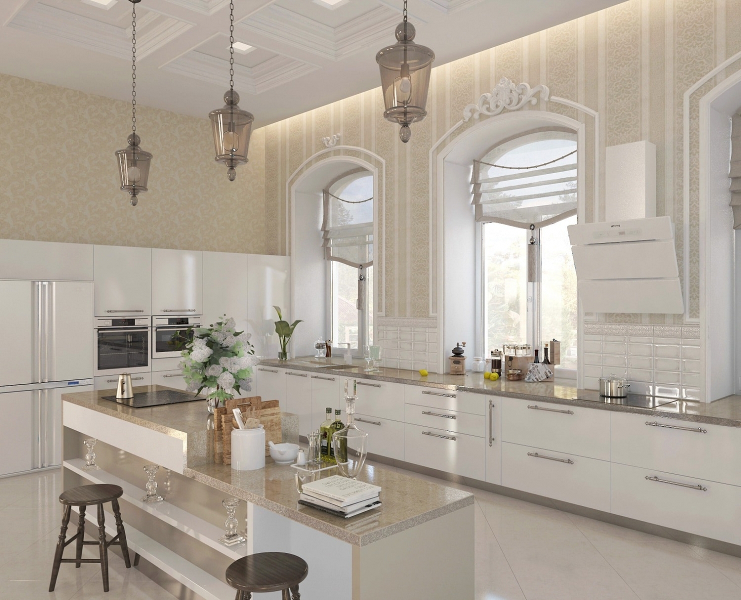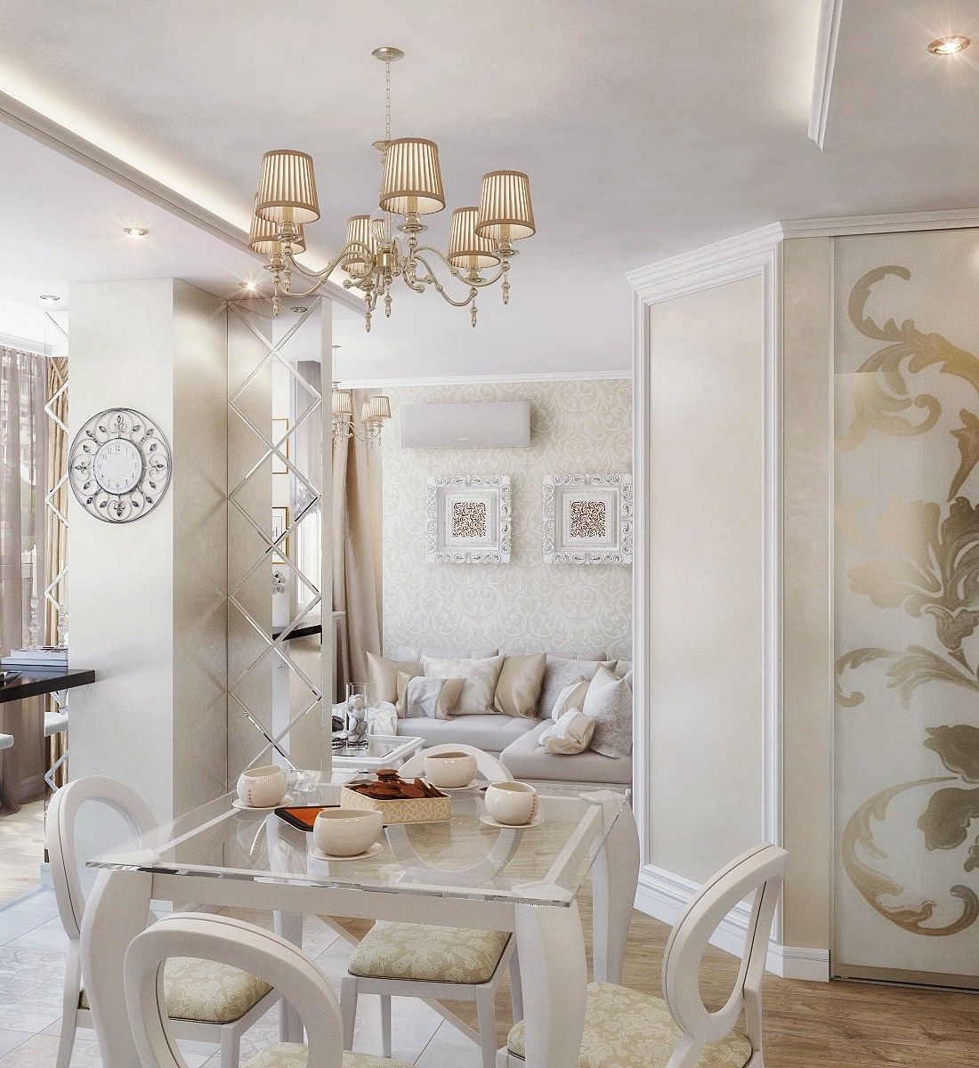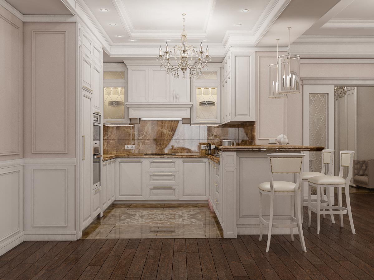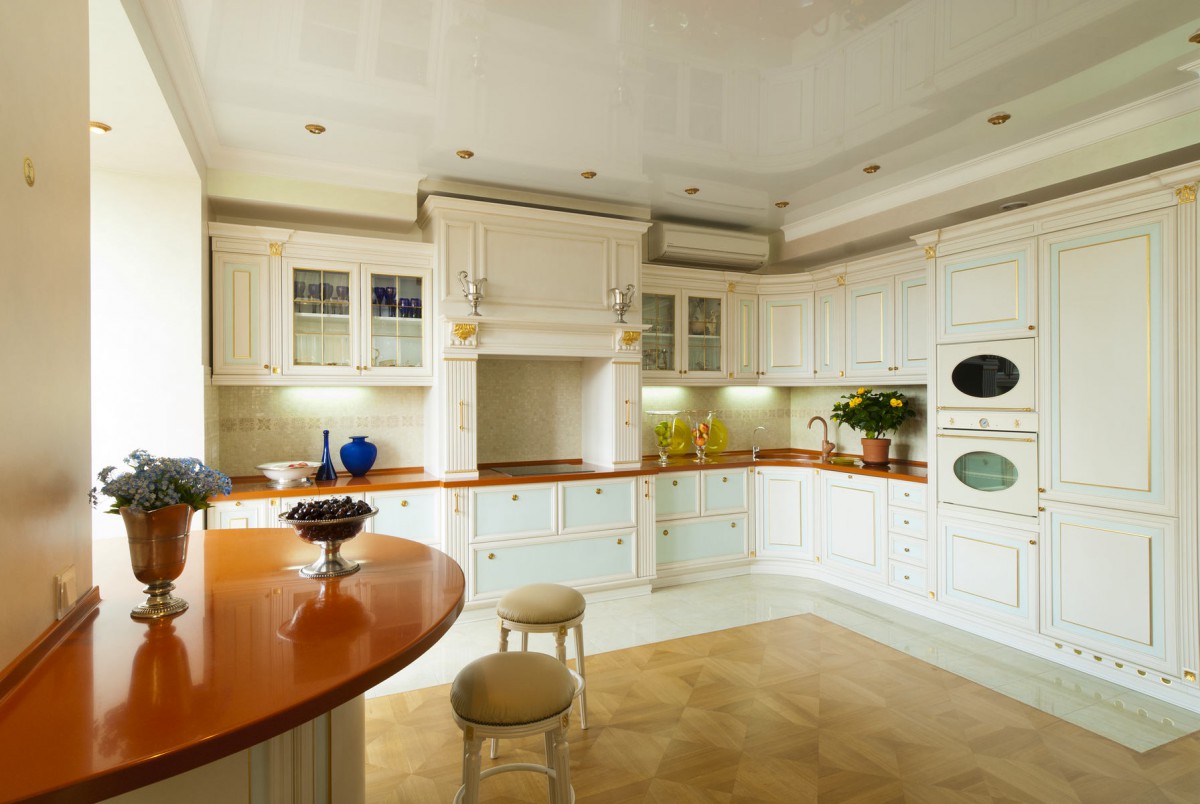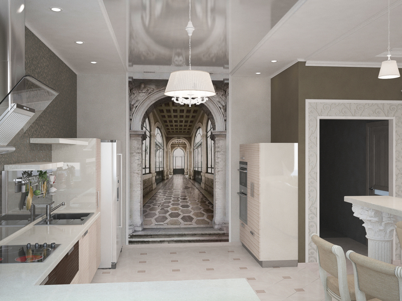 O neoclassicismo sugere quartos espaçosos com tetos altos. Se a sala de jantar a cozinha e sala de estar pequeno, é melhor combiná-los em um quarto. Cozinha no centro, pegando o resto da mobília debaixo dela.
