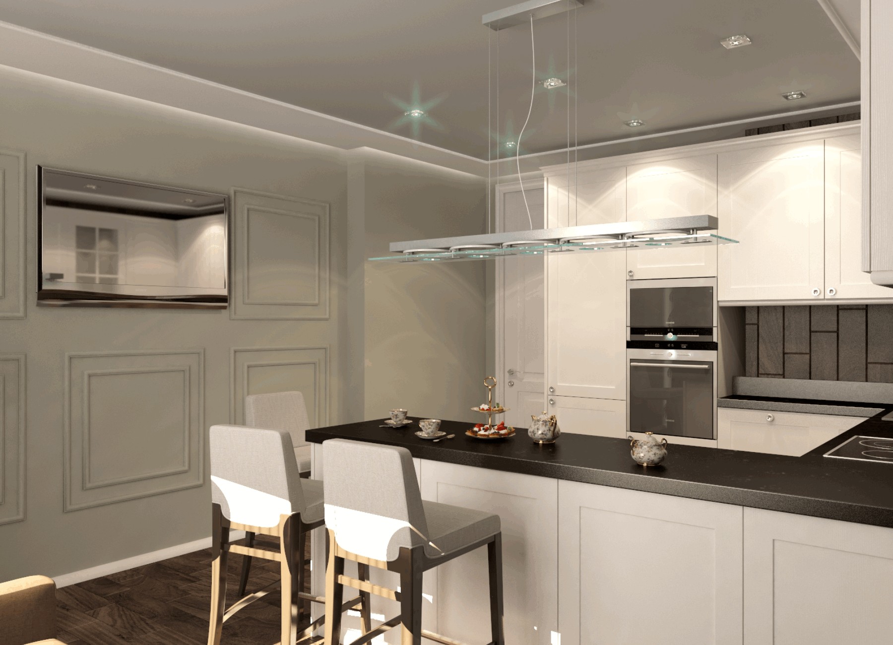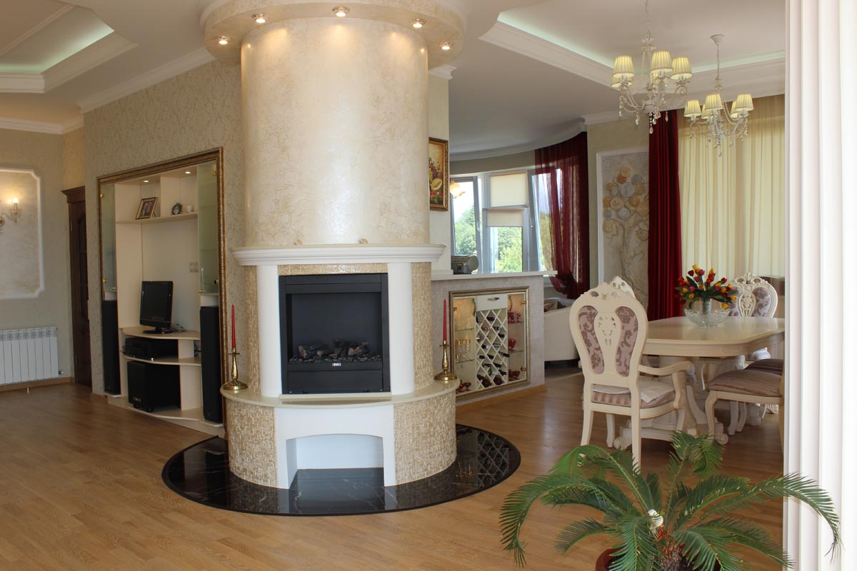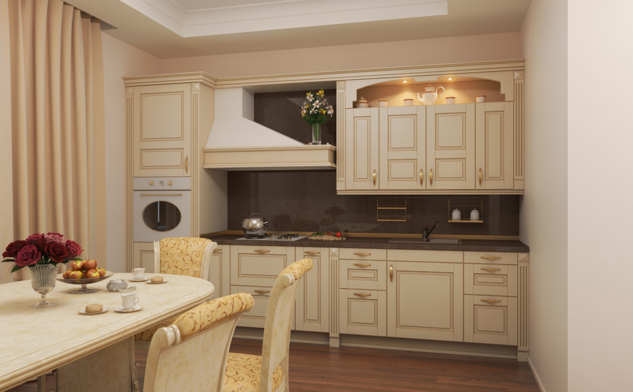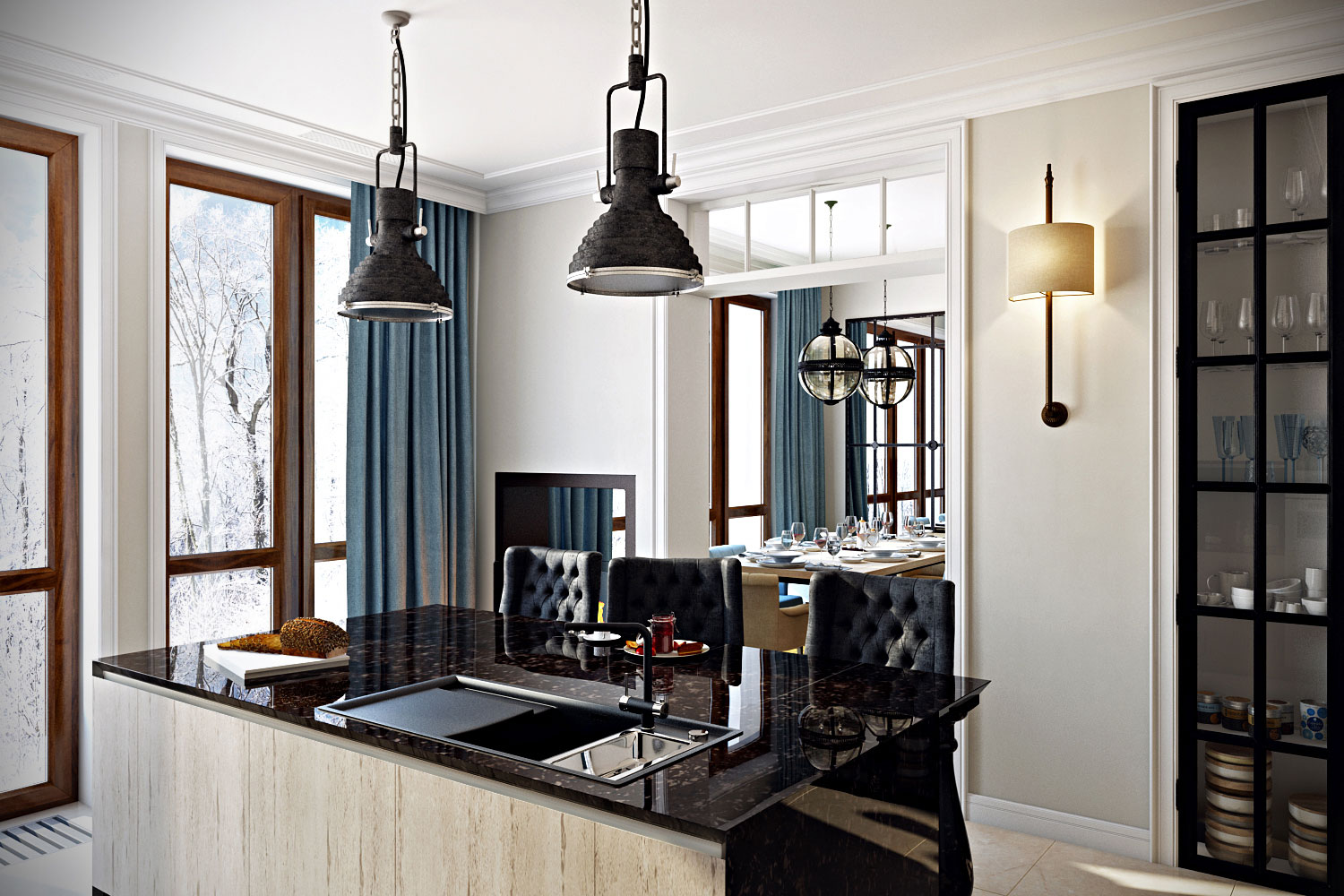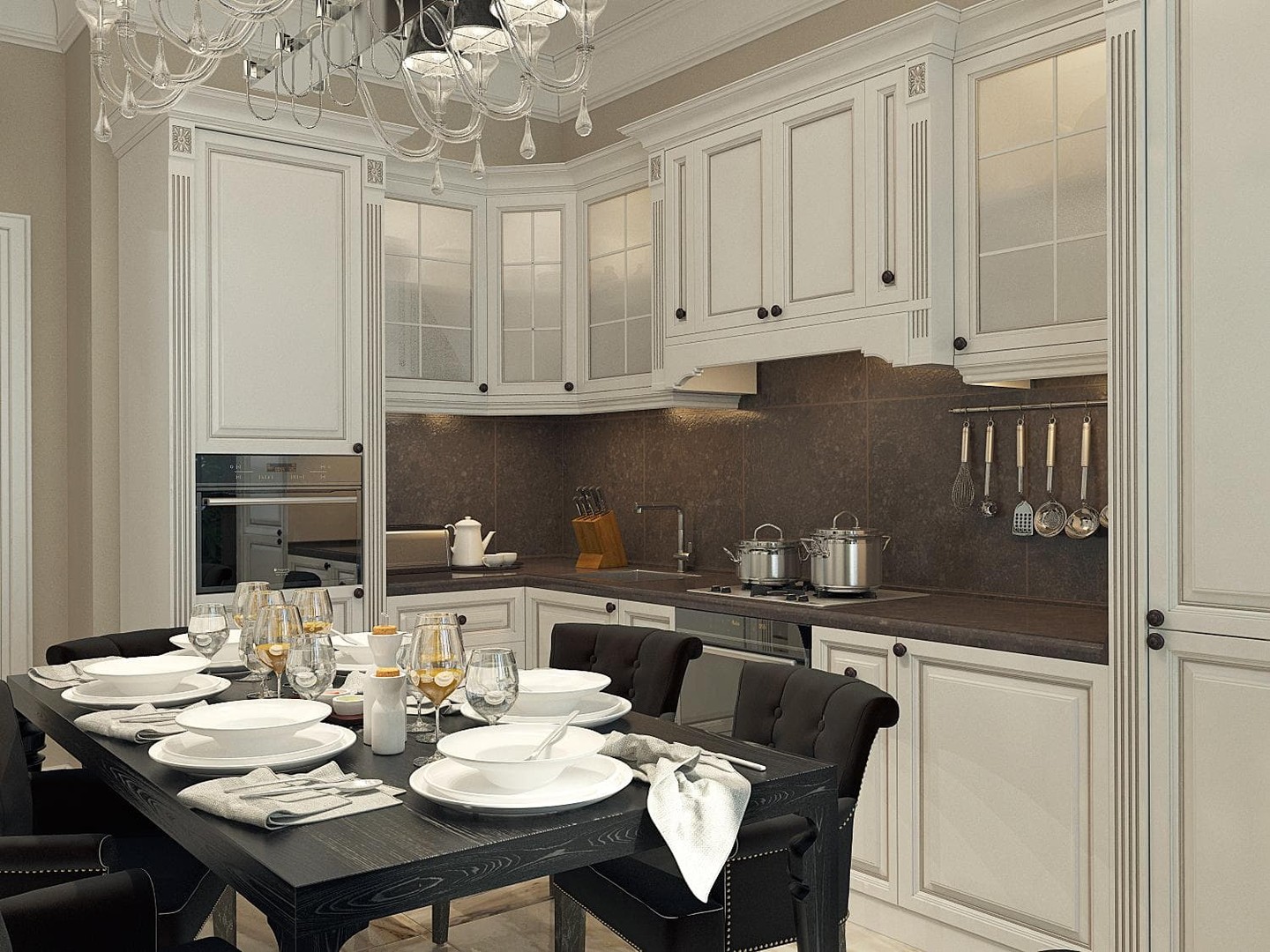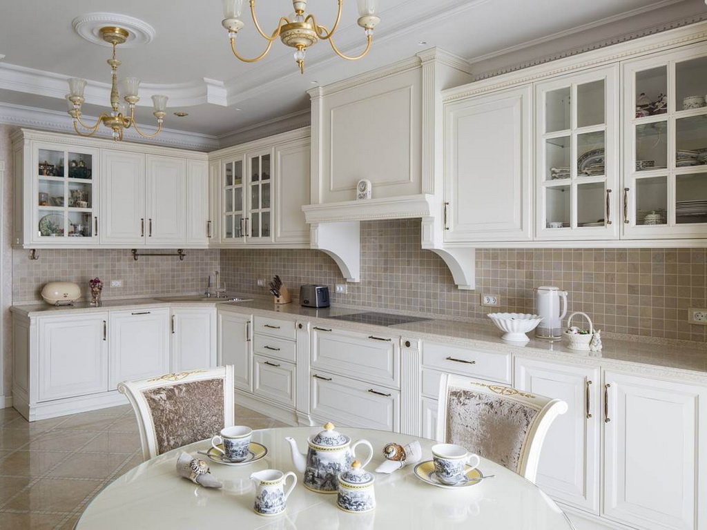 O neoclassicismo sugere quartos espaçosos com tetos altos. Se a sala de jantar a cozinha e sala de estar pequeno, é melhor combiná-los em um quarto. Cozinha no centro, pegando o resto da mobília debaixo dela.