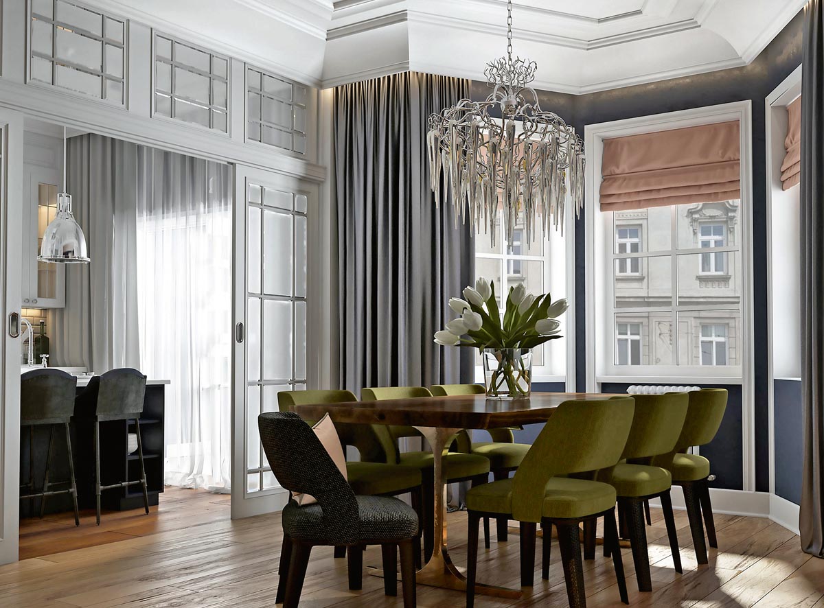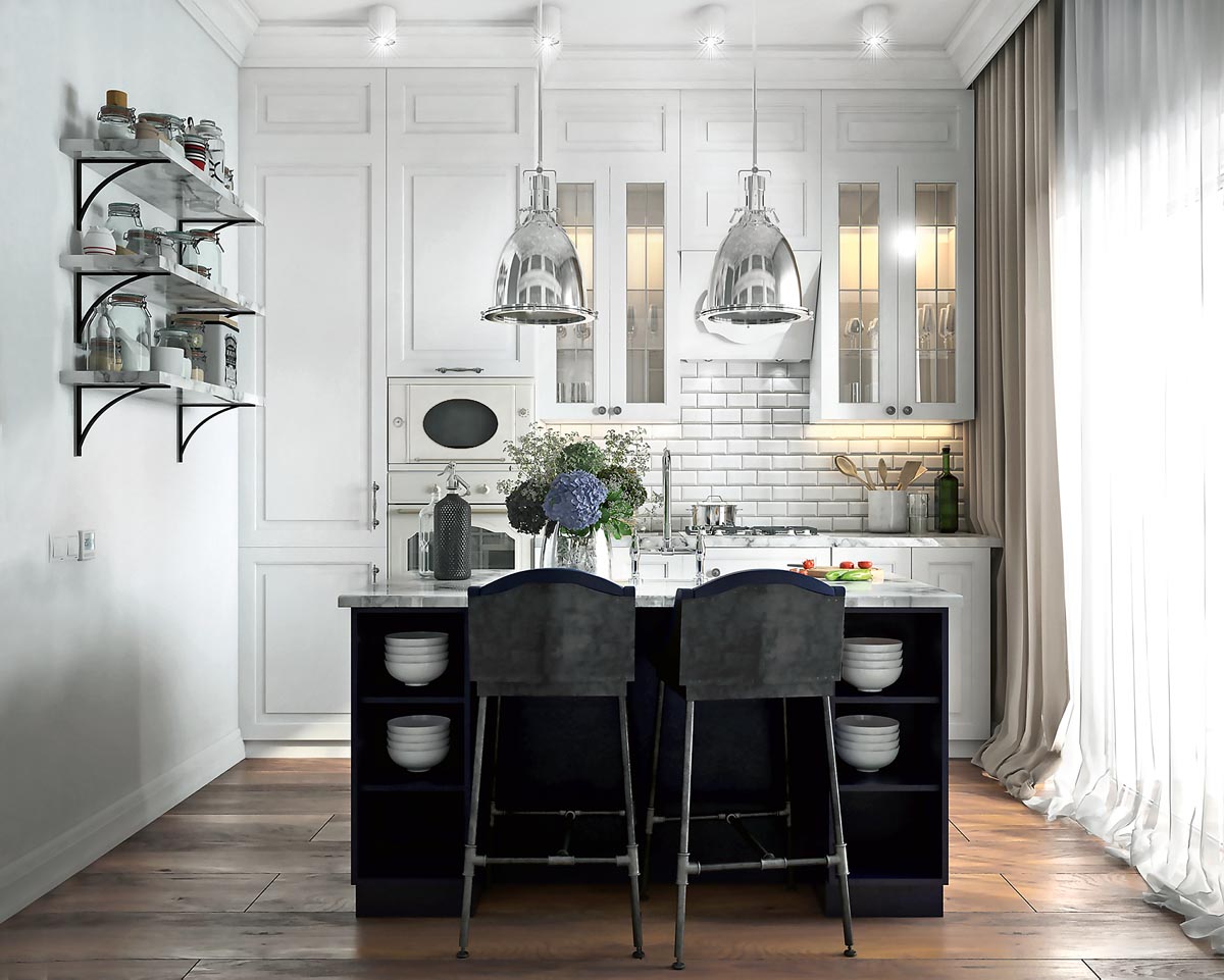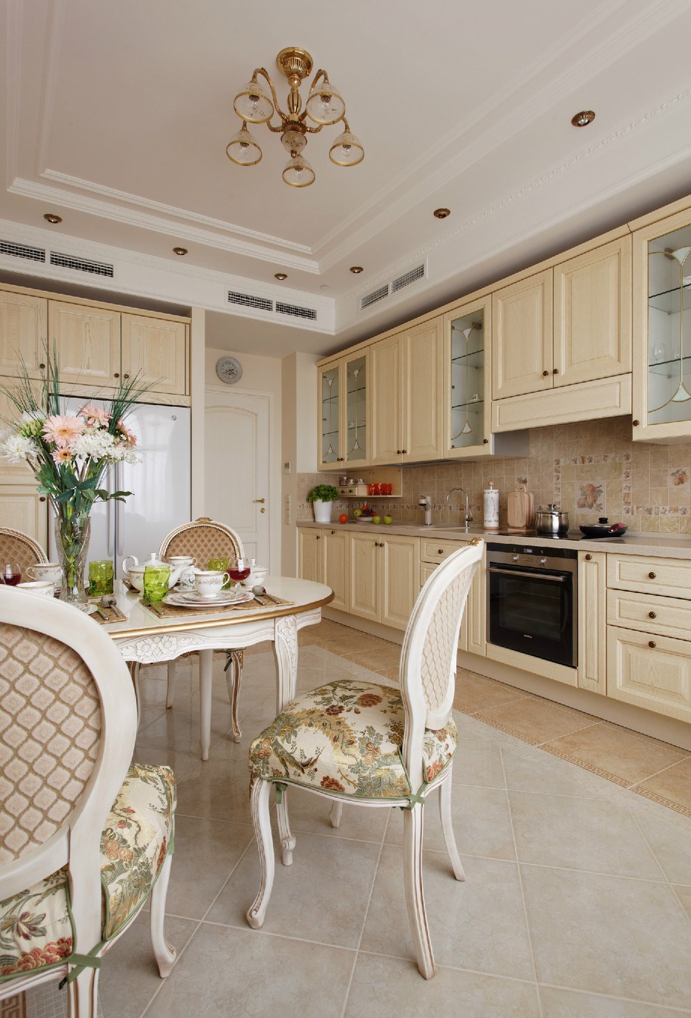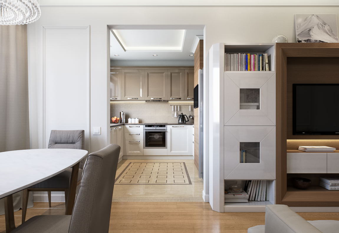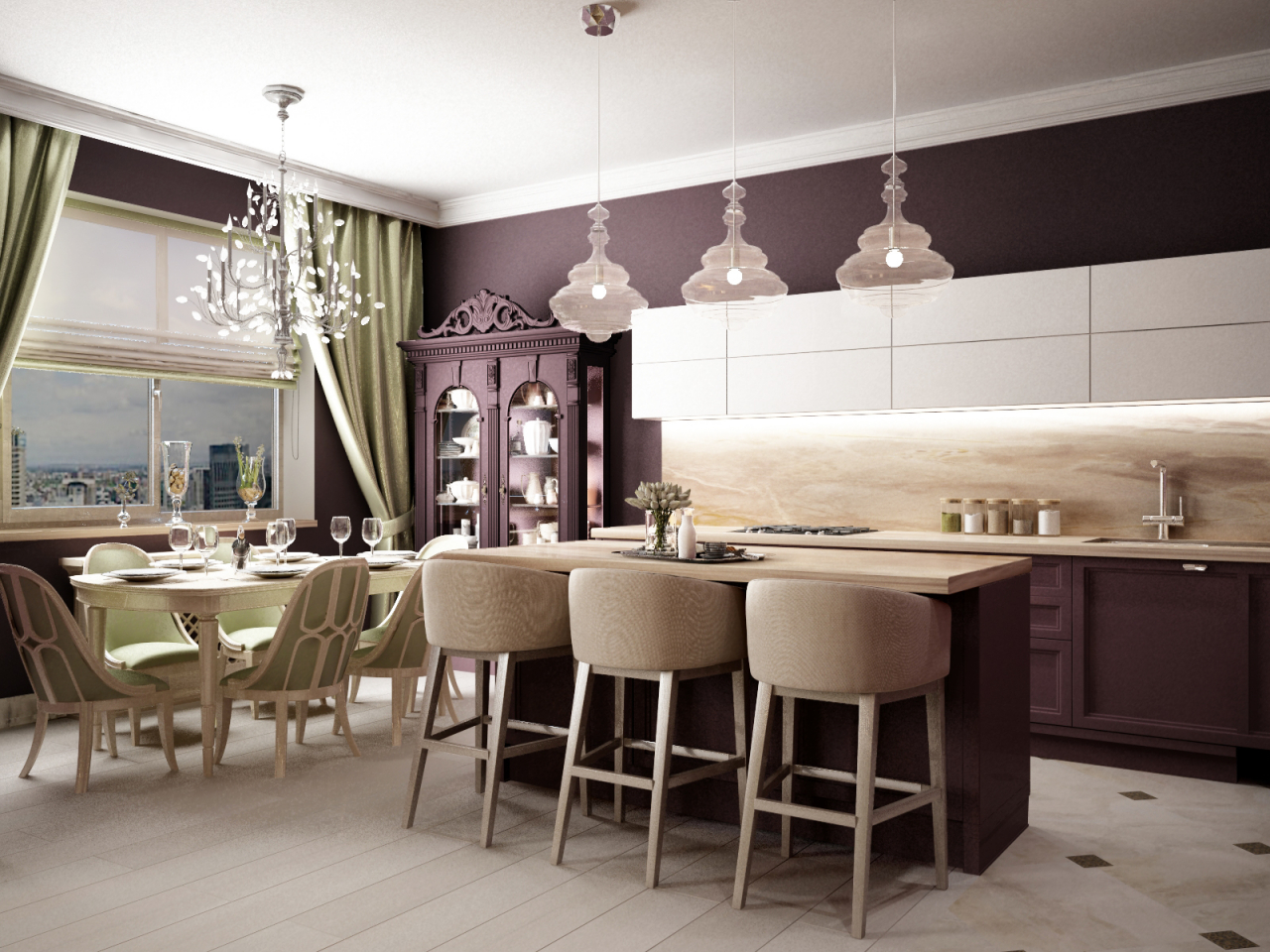 O neoclassicismo sugere quartos espaçosos com tetos altos. Se a sala de jantar a cozinha e sala de estar pequeno, é melhor combiná-los em um quarto. Cozinha no centro, pegando o resto da mobília debaixo dela.