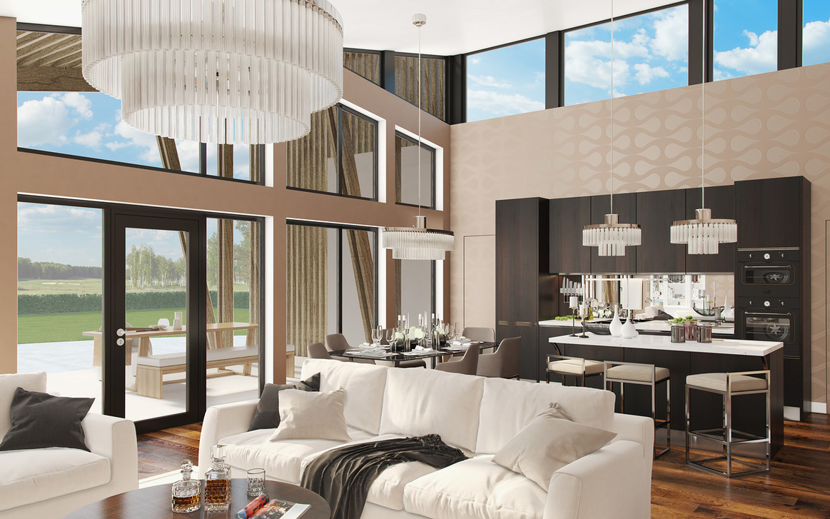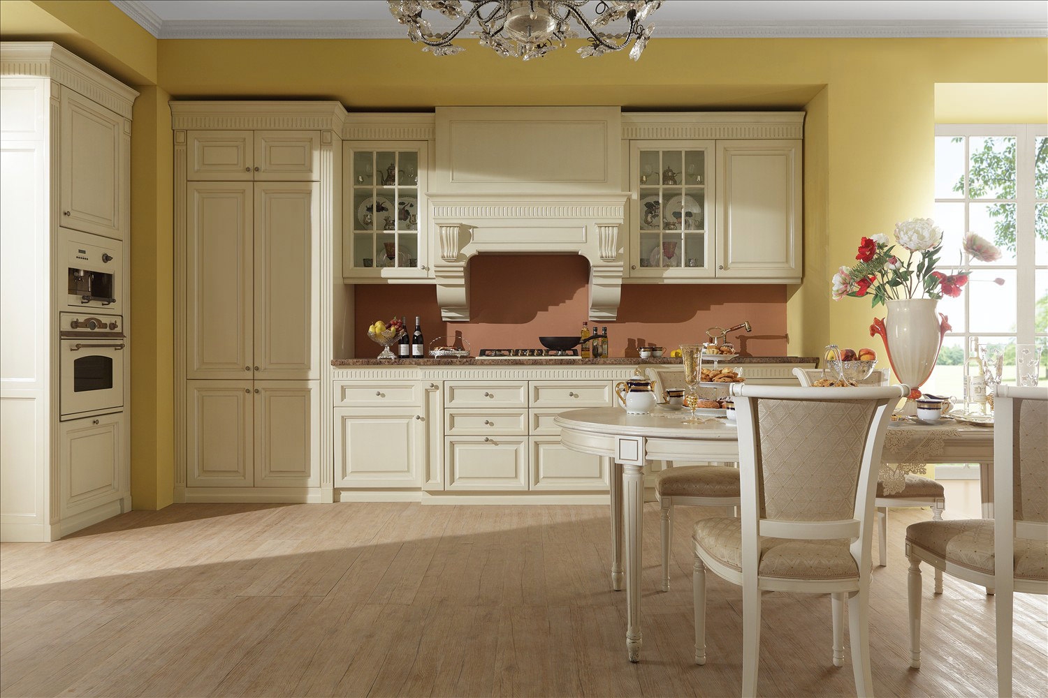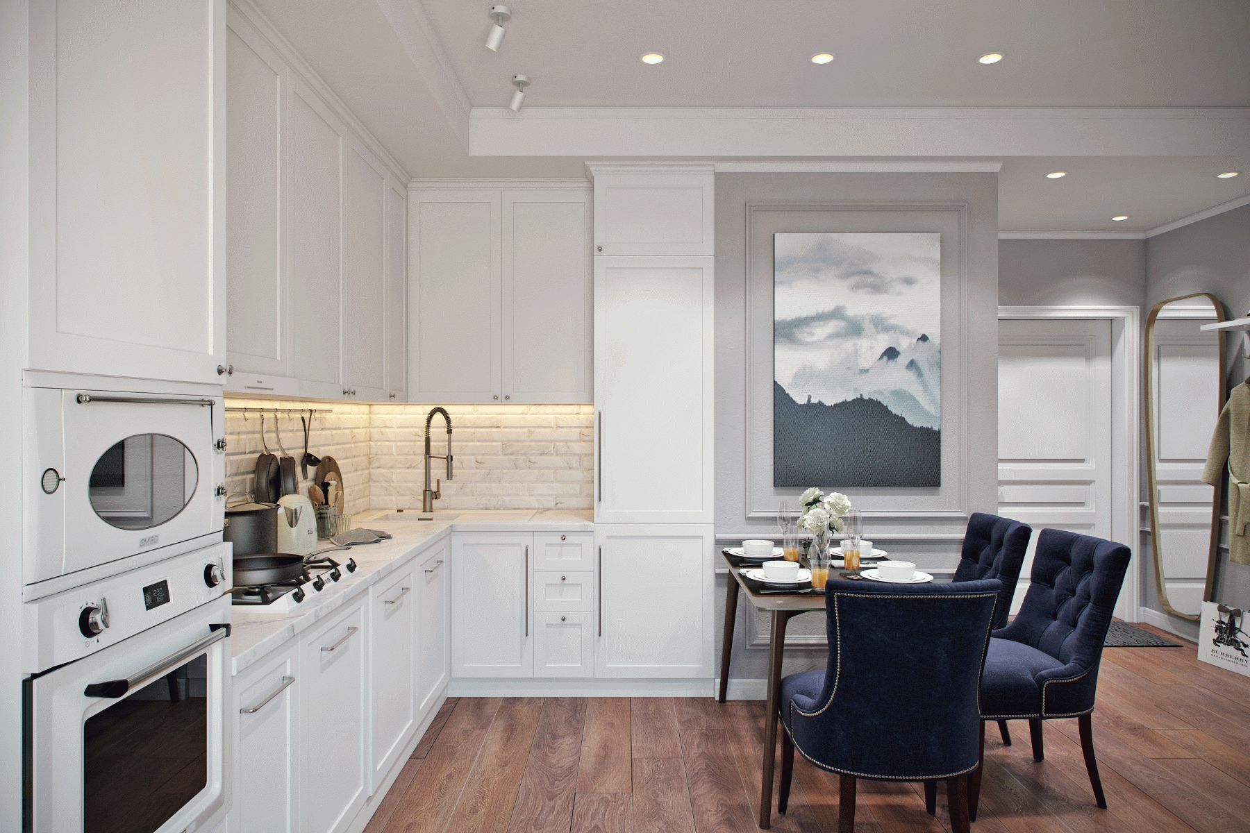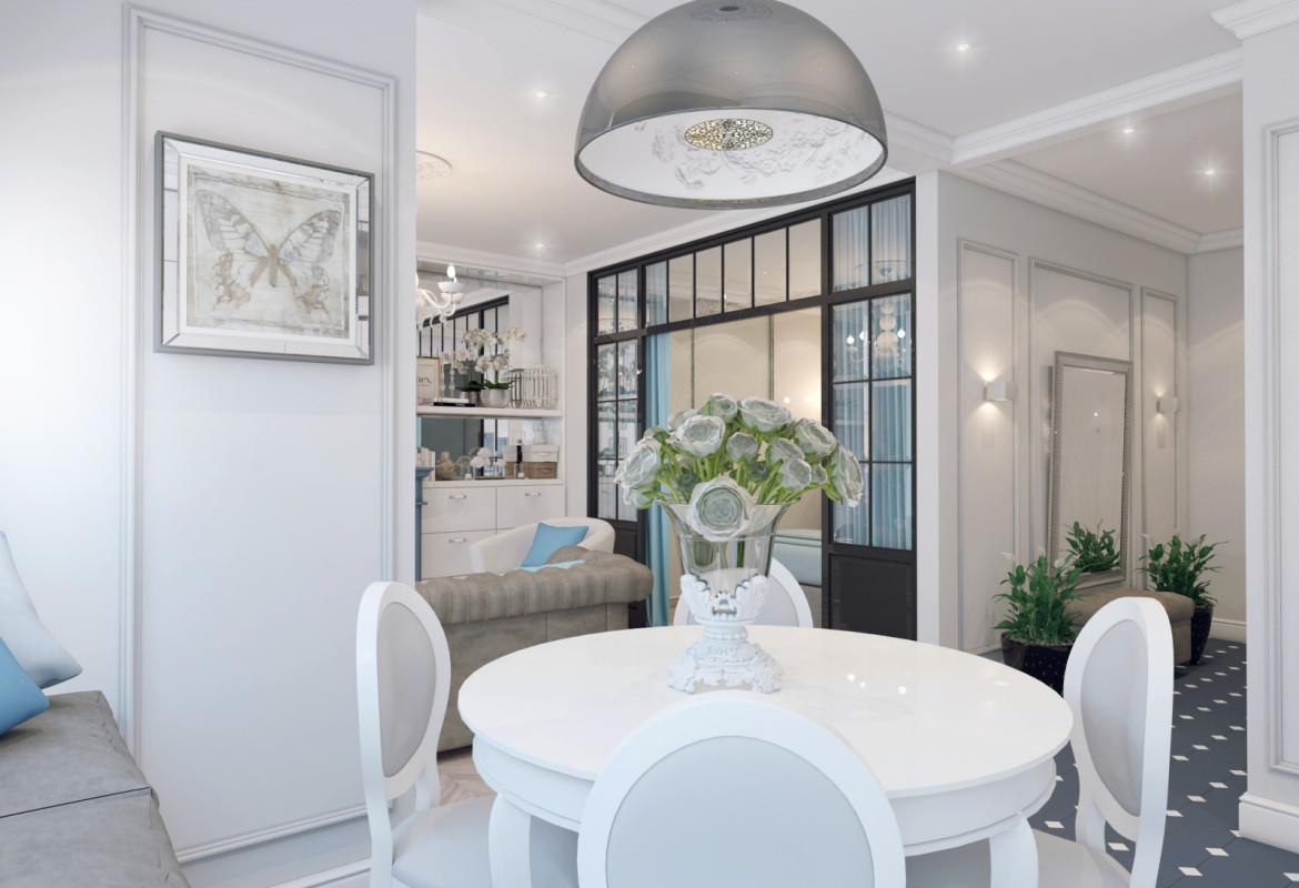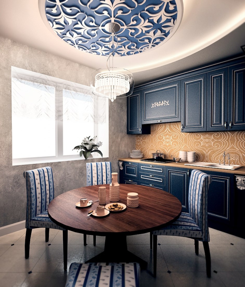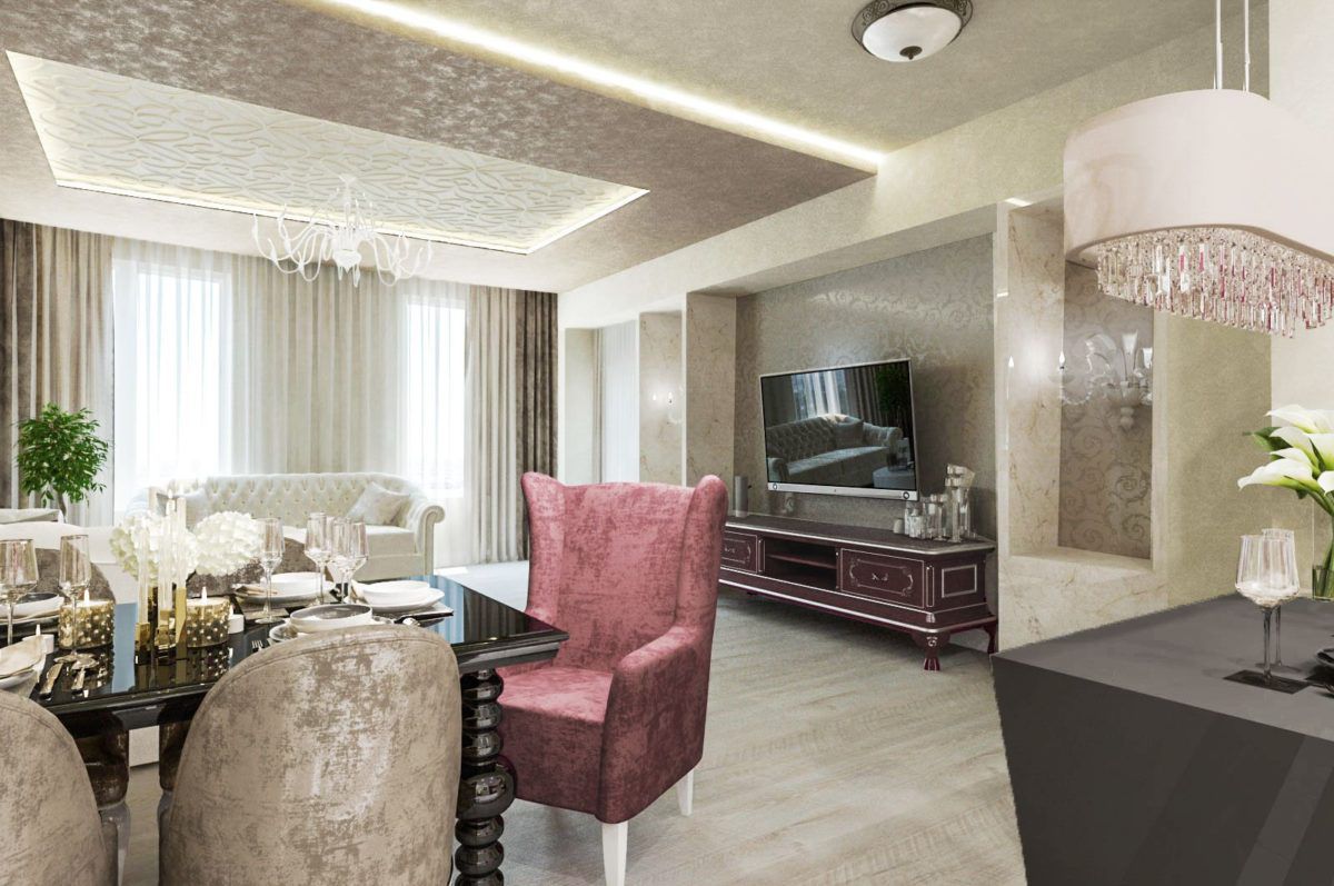O neoclassicismo sugere quartos espaçosos com tetos altos. Se a sala de jantar a cozinha e sala de estar pequeno, é melhor combiná-los em um quarto. Cozinha no centro, pegando o resto da mobília debaixo dela.