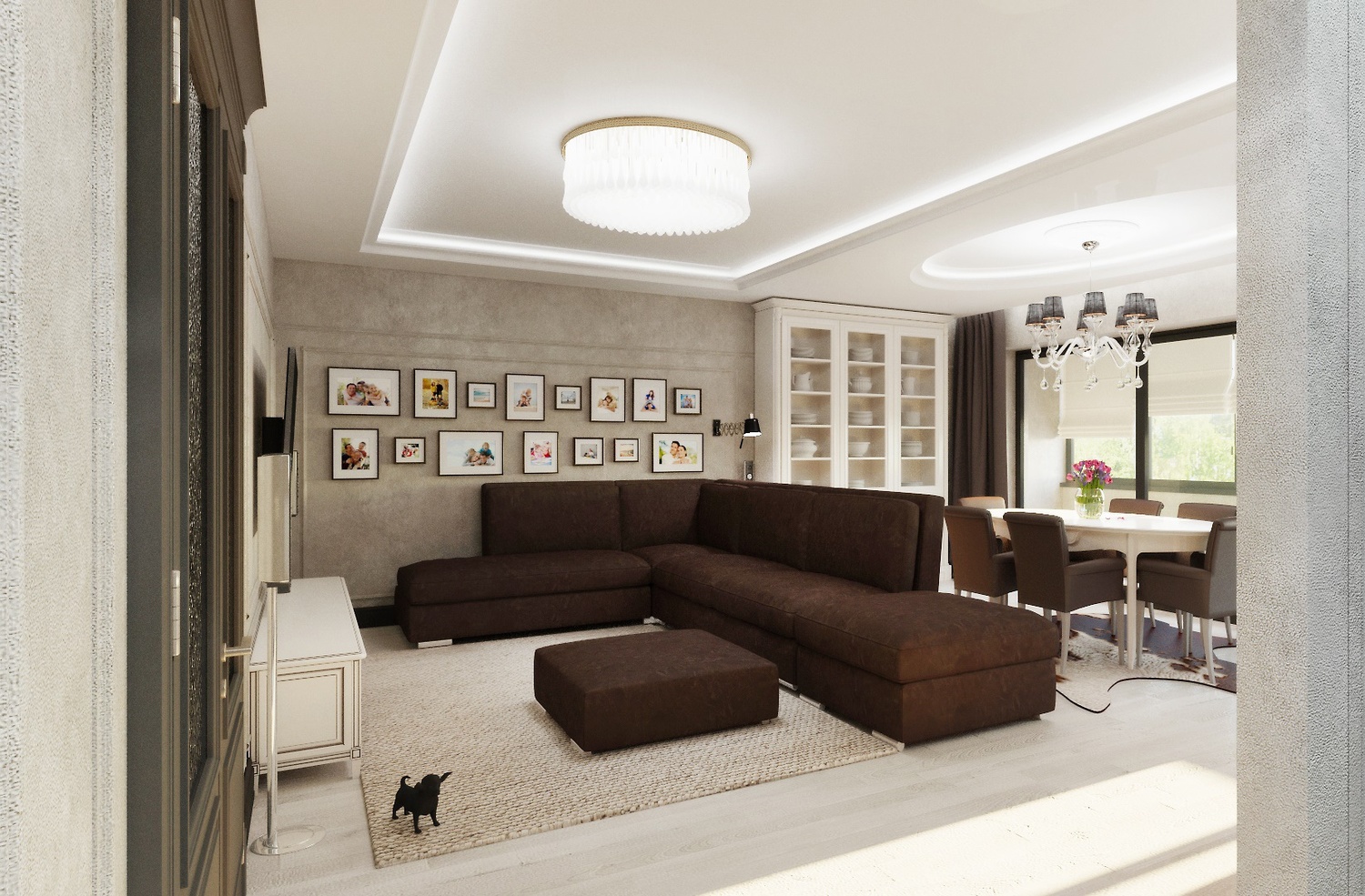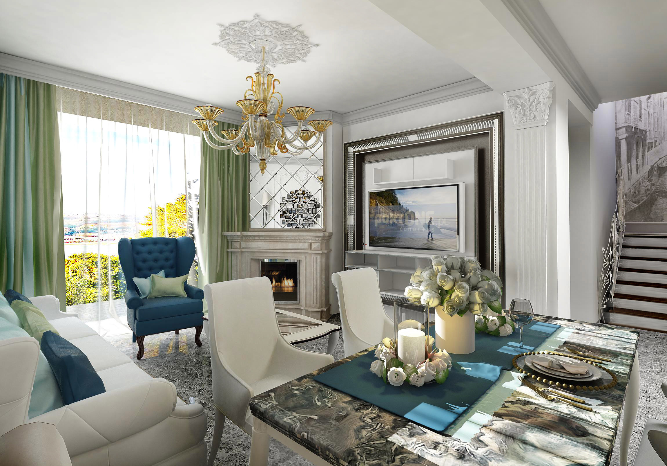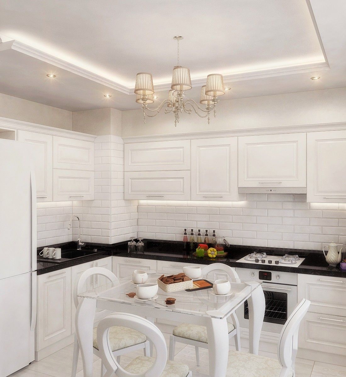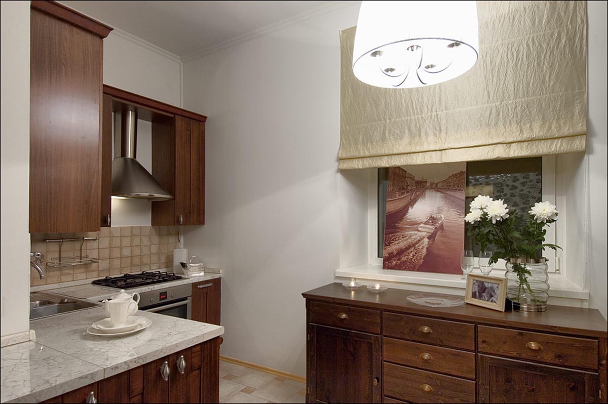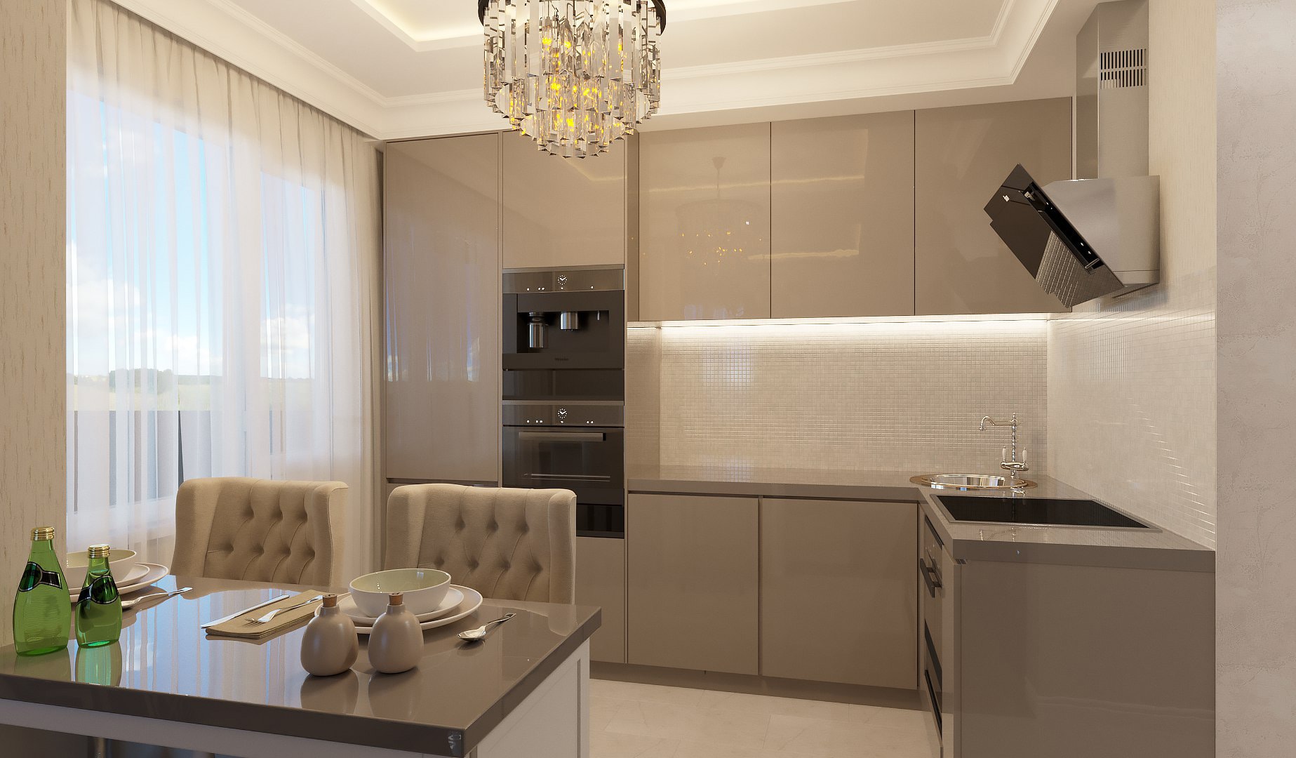 O neoclassicismo sugere quartos espaçosos com tetos altos. Se a sala de jantar a cozinha e sala de estar pequeno, é melhor combiná-los em um quarto. Cozinha no centro, pegando o resto da mobília debaixo dela.