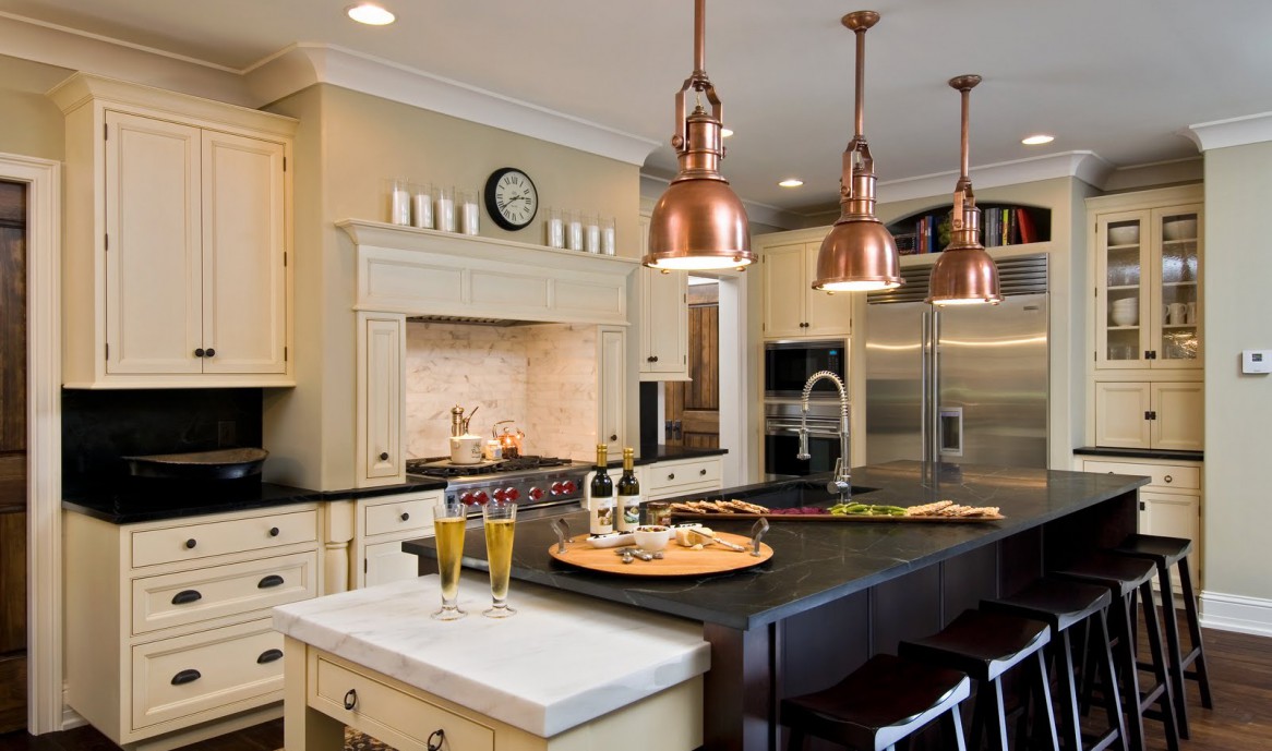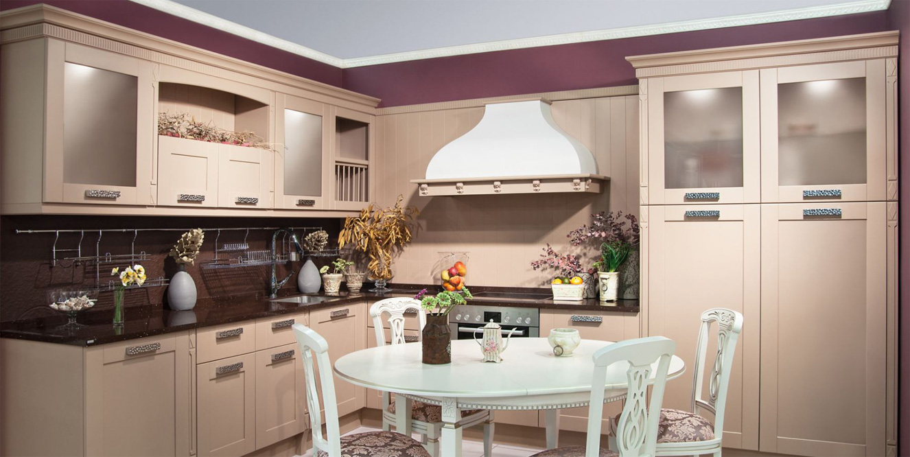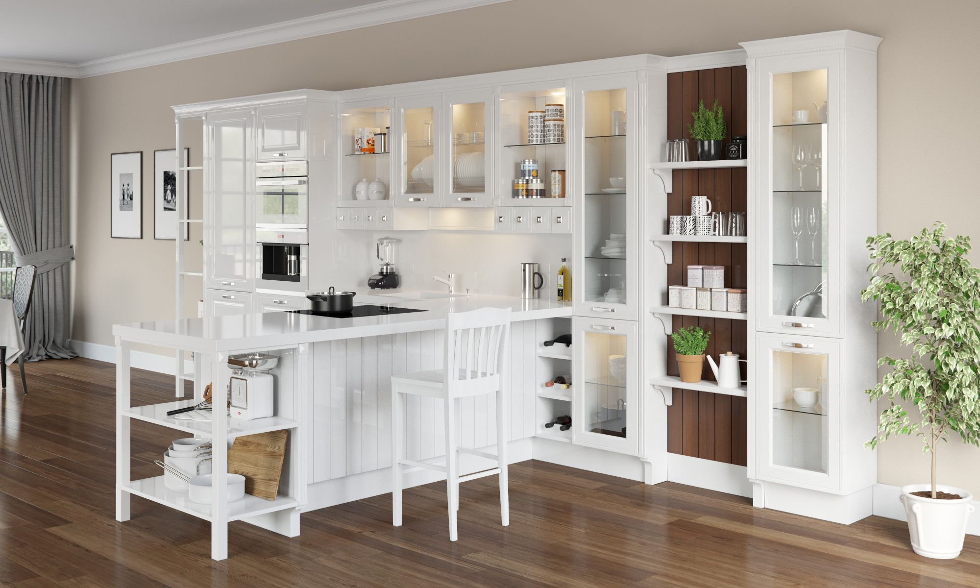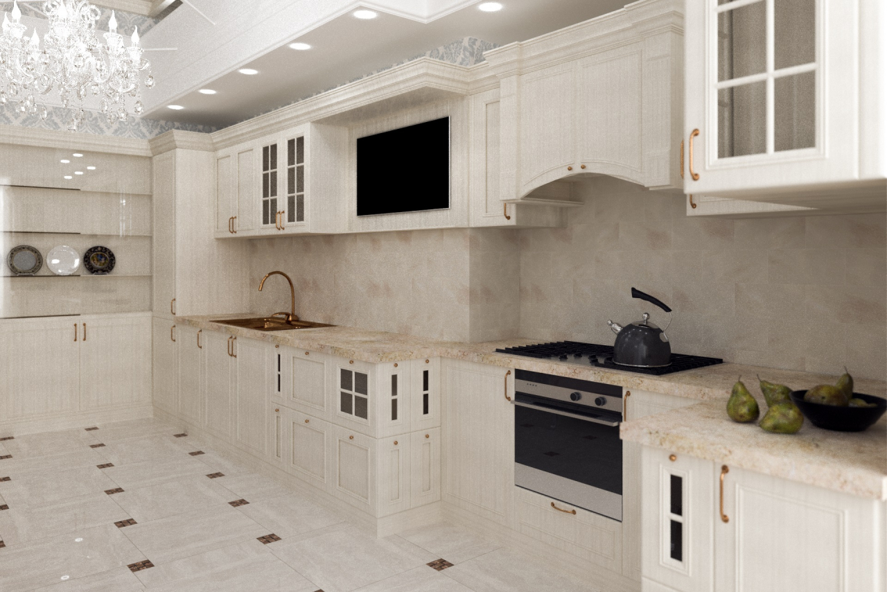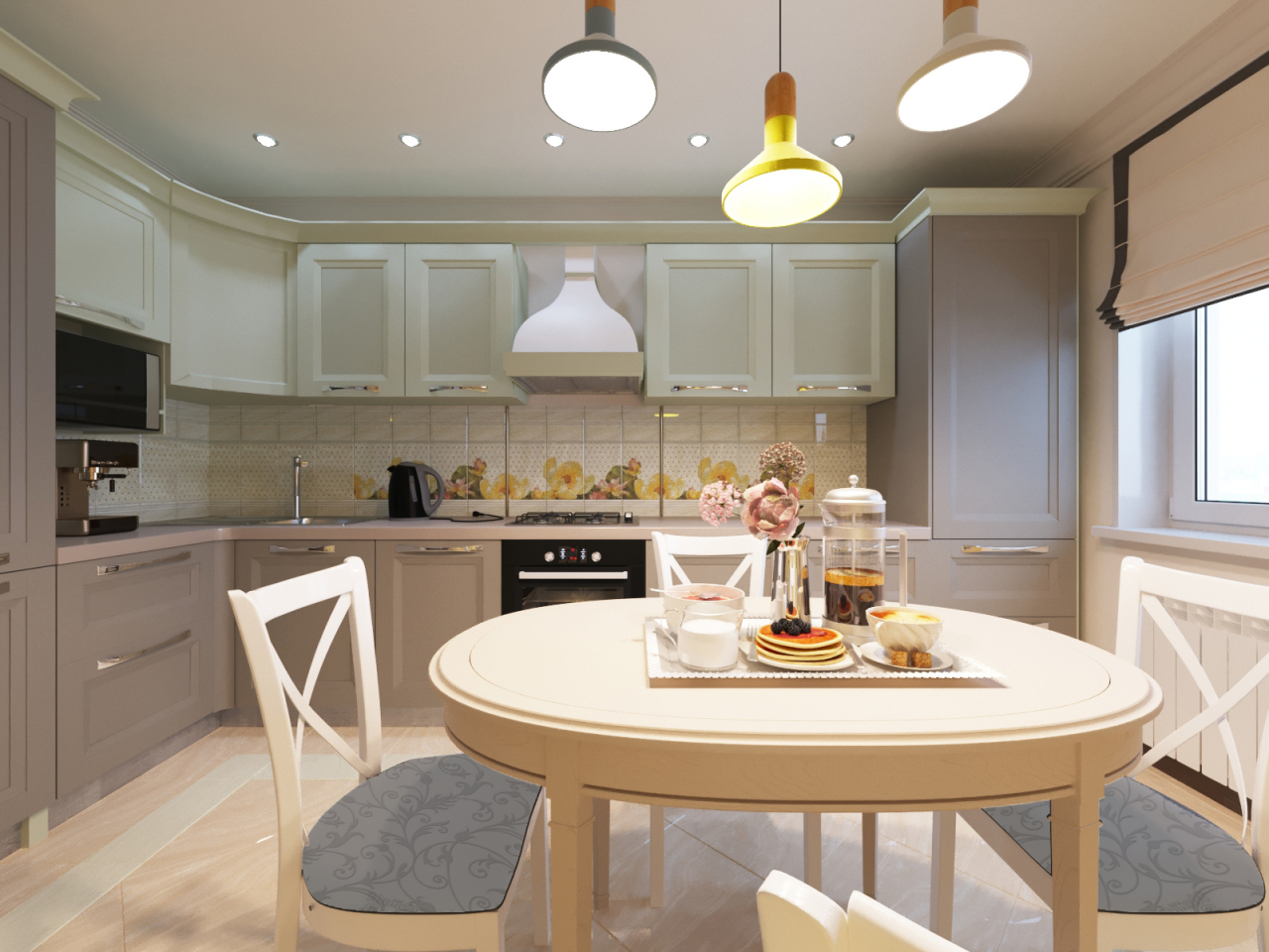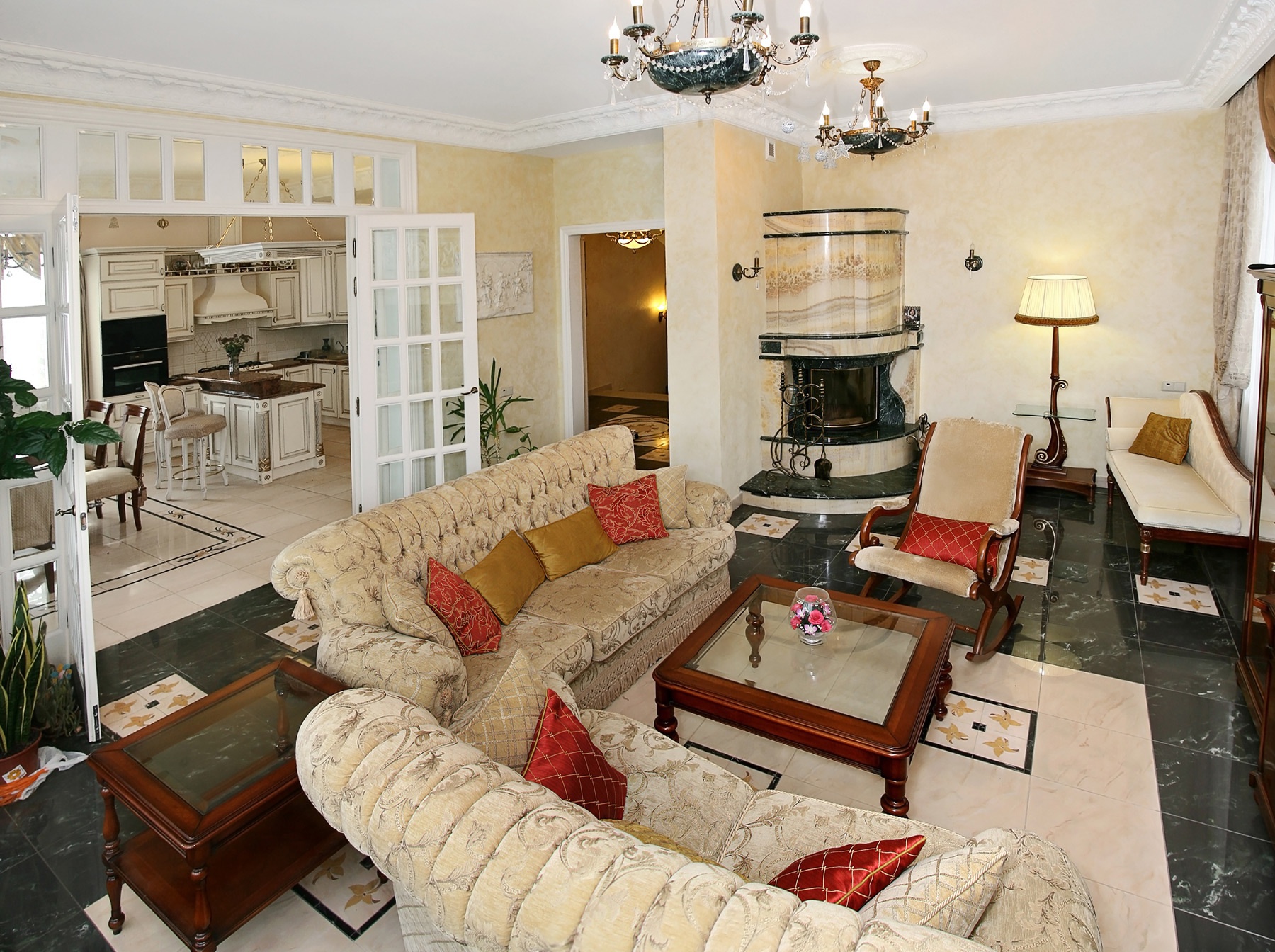 O neoclassicismo sugere quartos espaçosos com tetos altos. Se a sala de jantar a cozinha e sala de estar pequeno, é melhor combiná-los em um quarto. Cozinha no centro, pegando o resto da mobília debaixo dela.