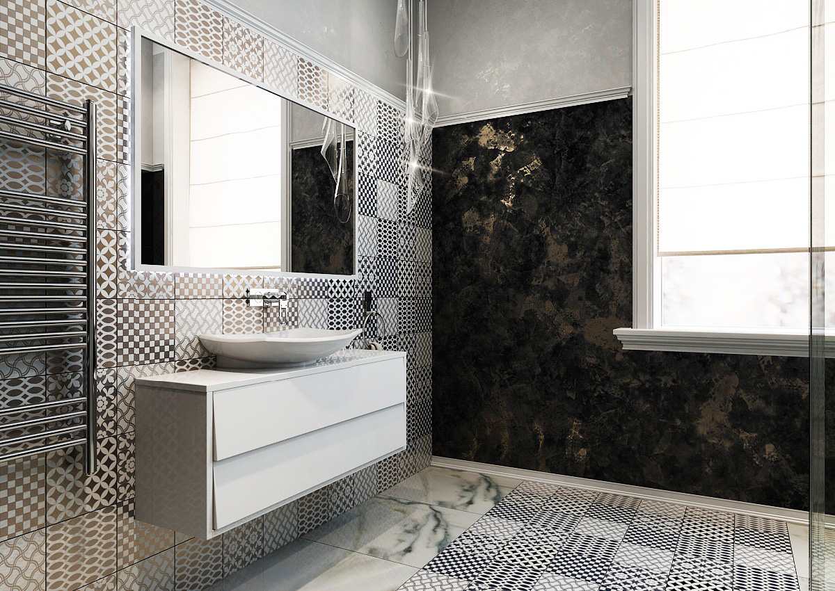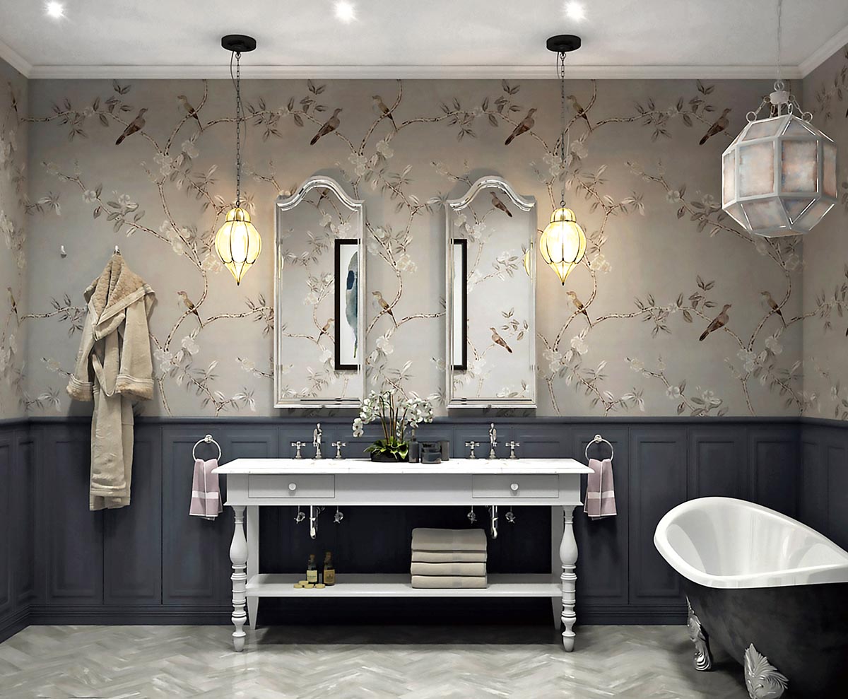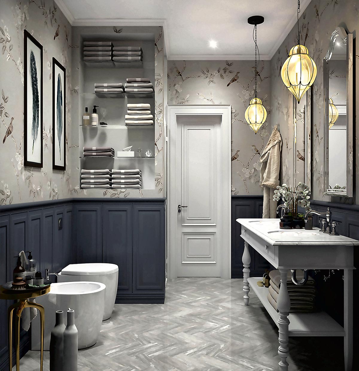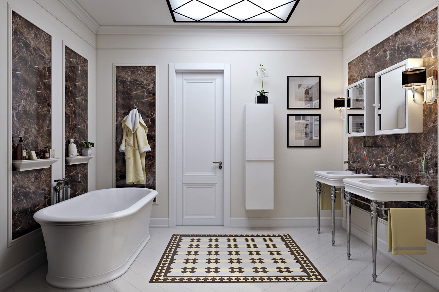 No interior do neoclássico, as paredes e o piso são revestidos de cerâmica. É aconselhável ficar em cores pastel com padrões antigos.