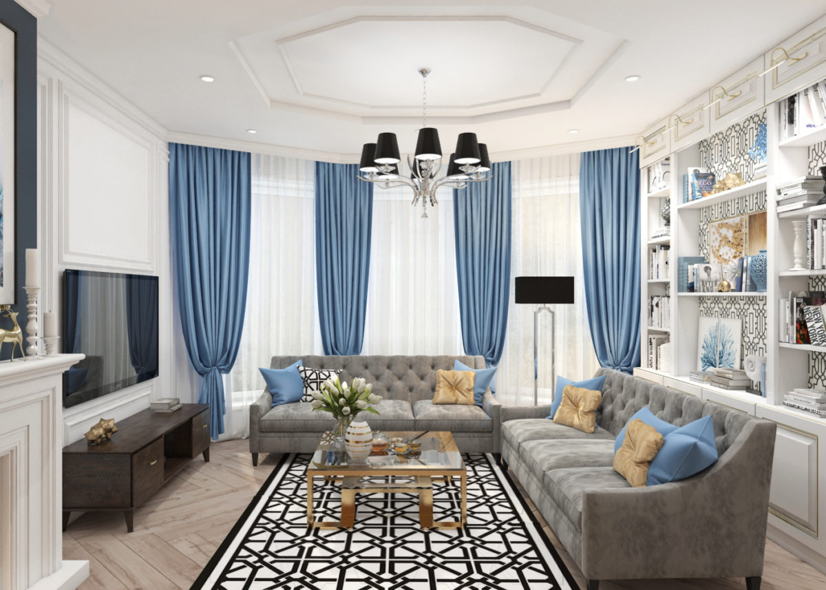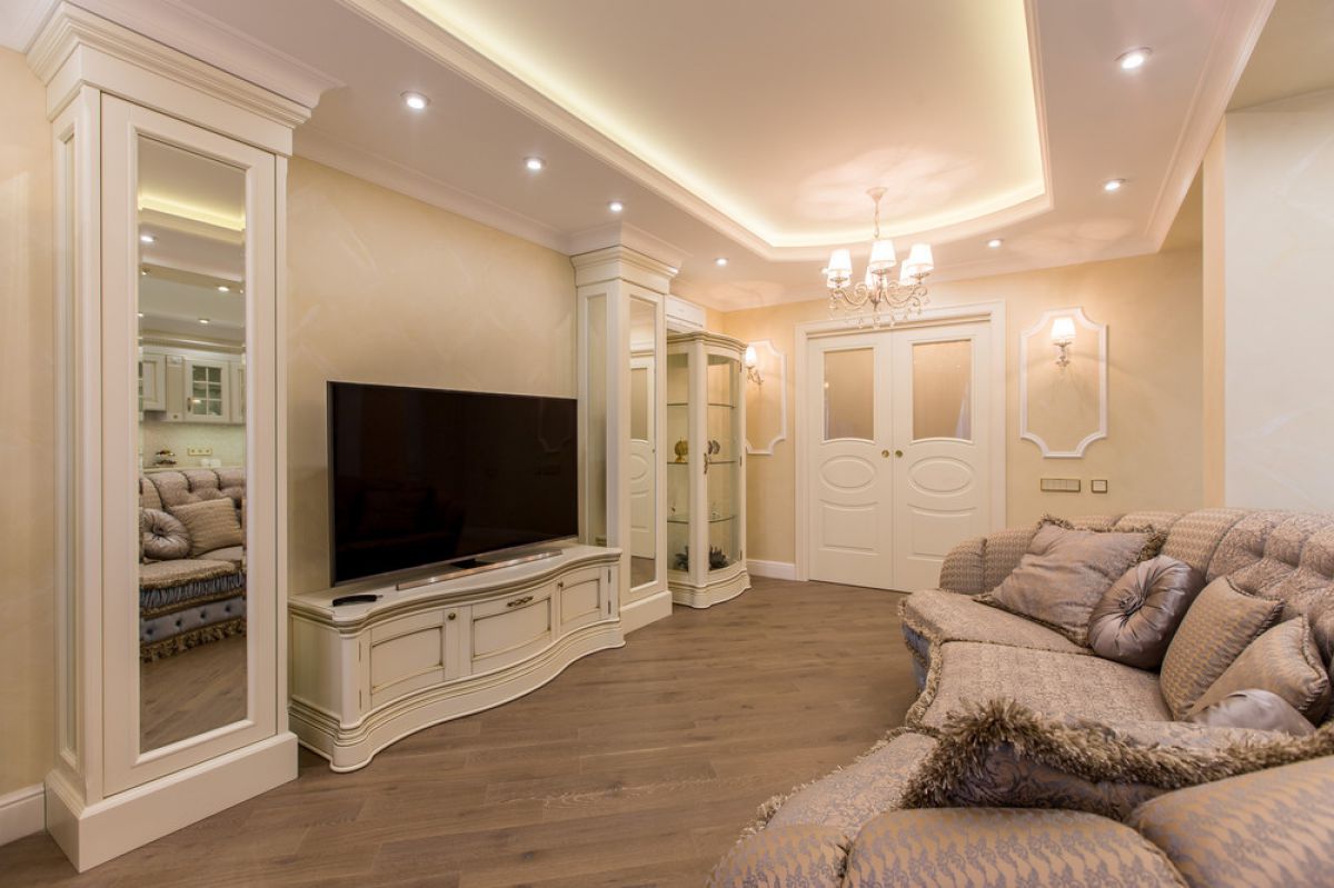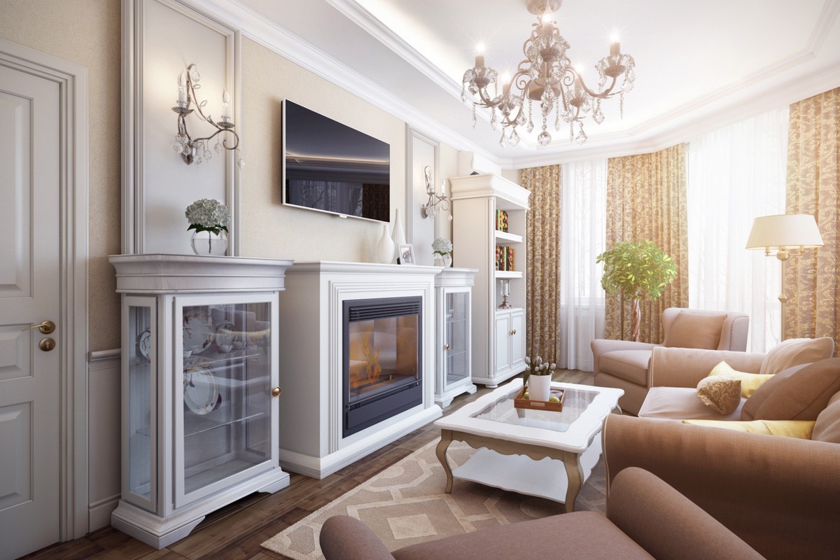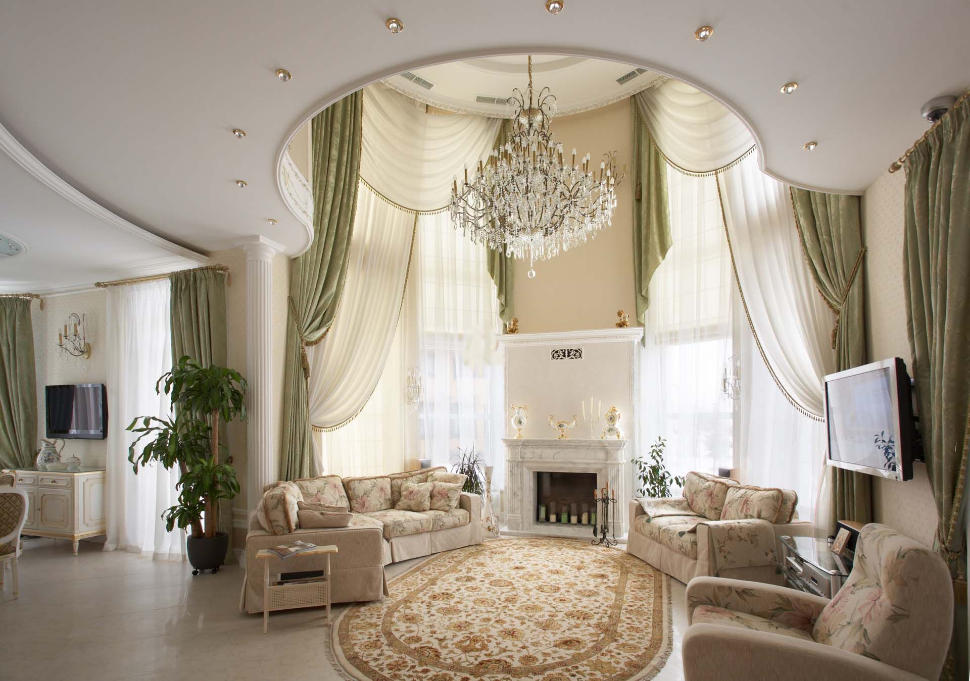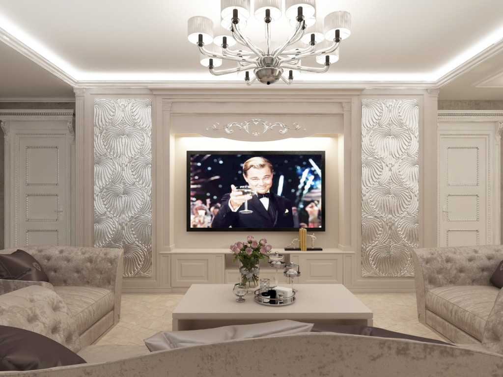 O desejo de simetria, respeito pelas proporções, formas retangulares - as características do neoclassicismo no interior da sala de estar. A situação é mais adequada para uma mansão do que para um pequeno apartamento. A espaçosa sala de estar permitirá incorporar a ideia do designer de um interior rico, conveniente para viver.