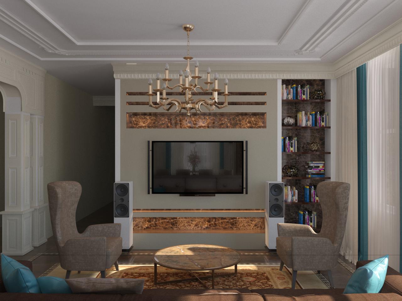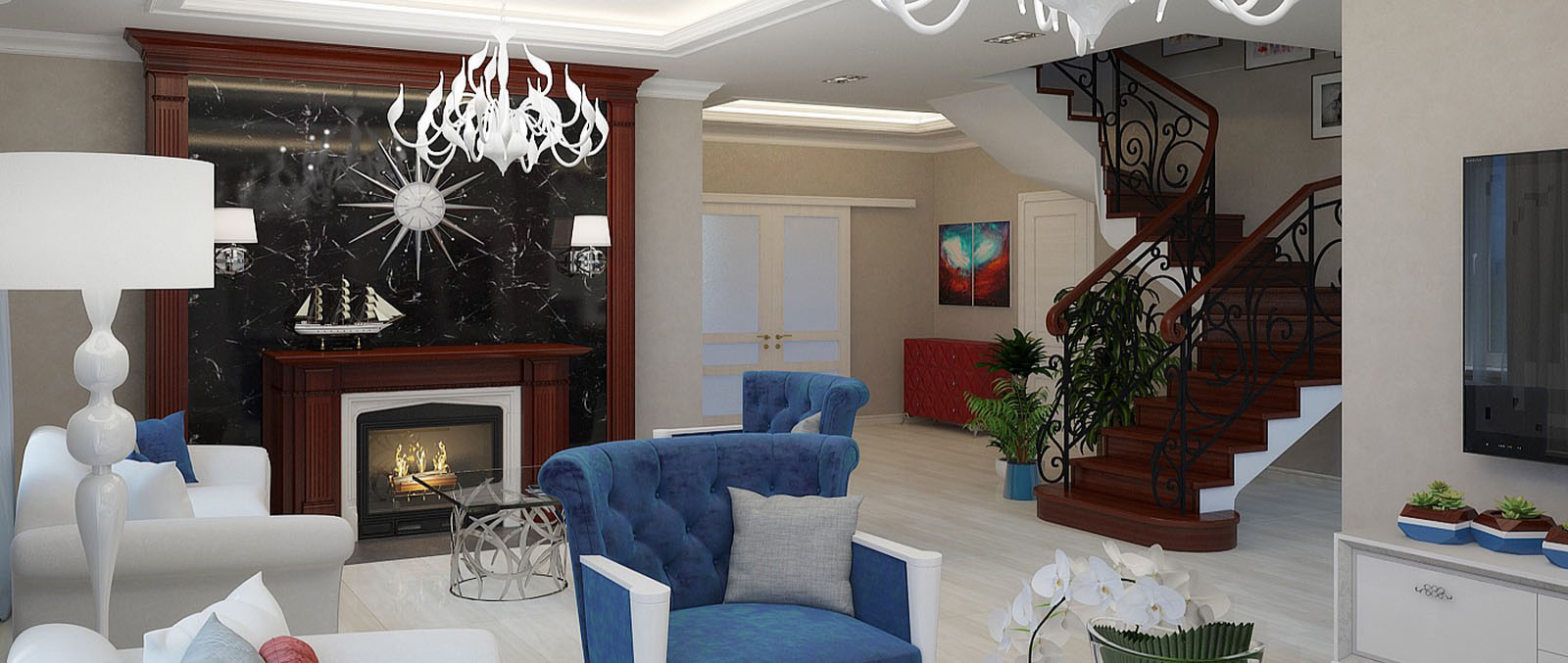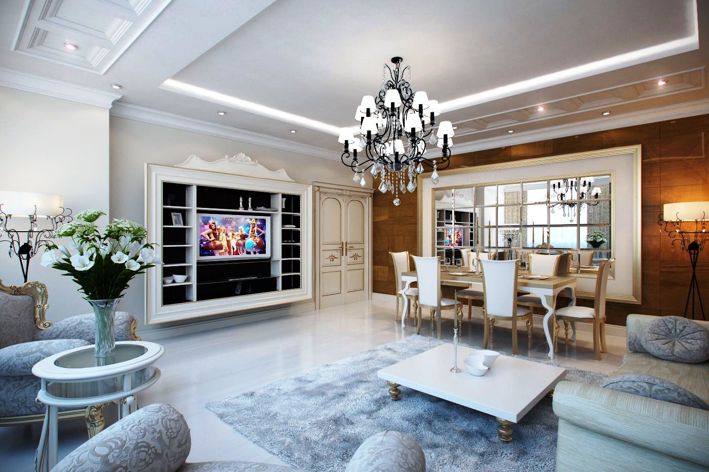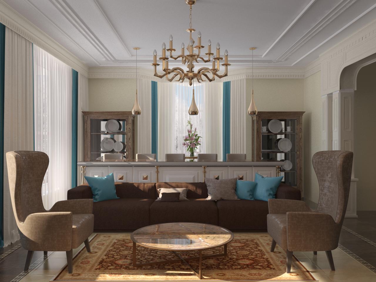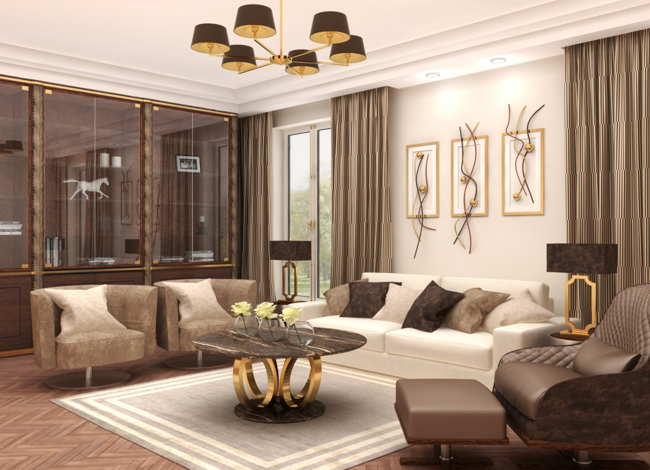 O desejo de simetria, respeito pelas proporções, formas retangulares - as características do neoclassicismo no interior da sala de estar. A situação é mais adequada para uma mansão do que para um pequeno apartamento. A espaçosa sala de estar permitirá incorporar a ideia do designer de um interior rico, conveniente para viver.