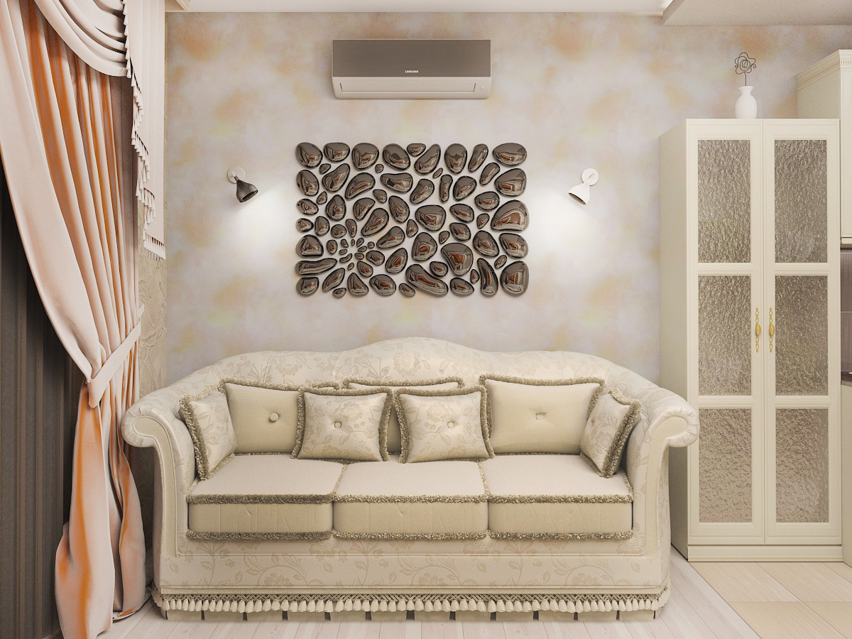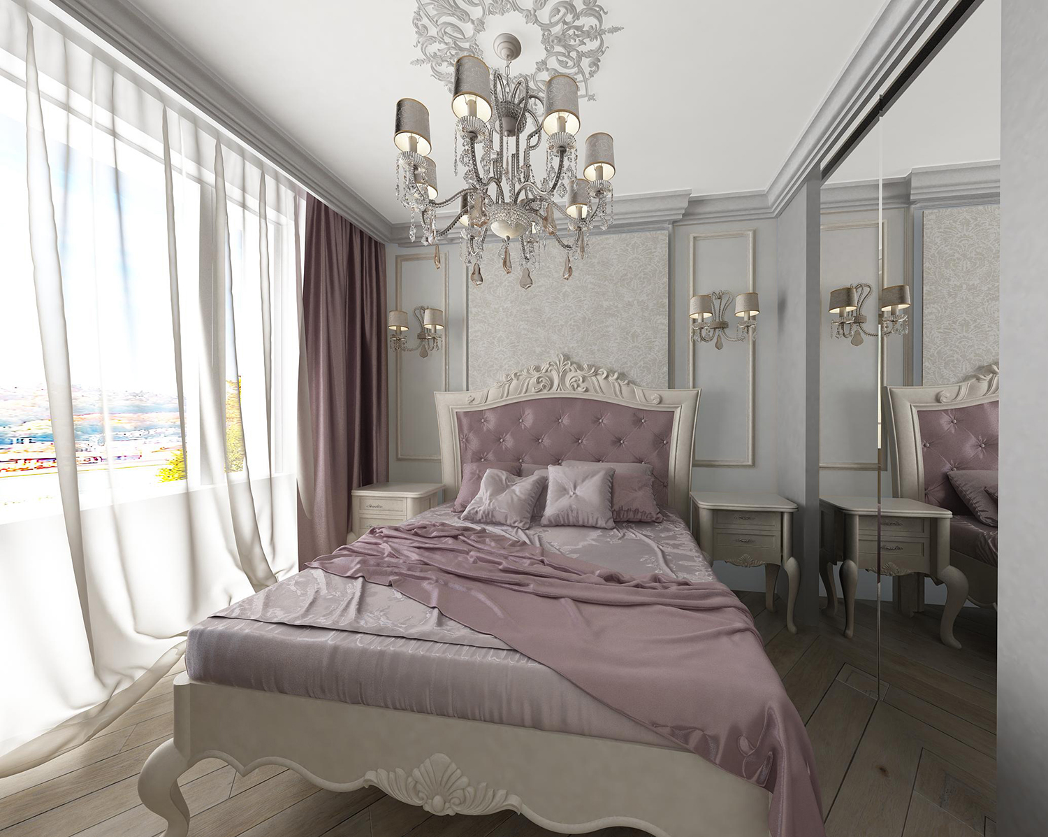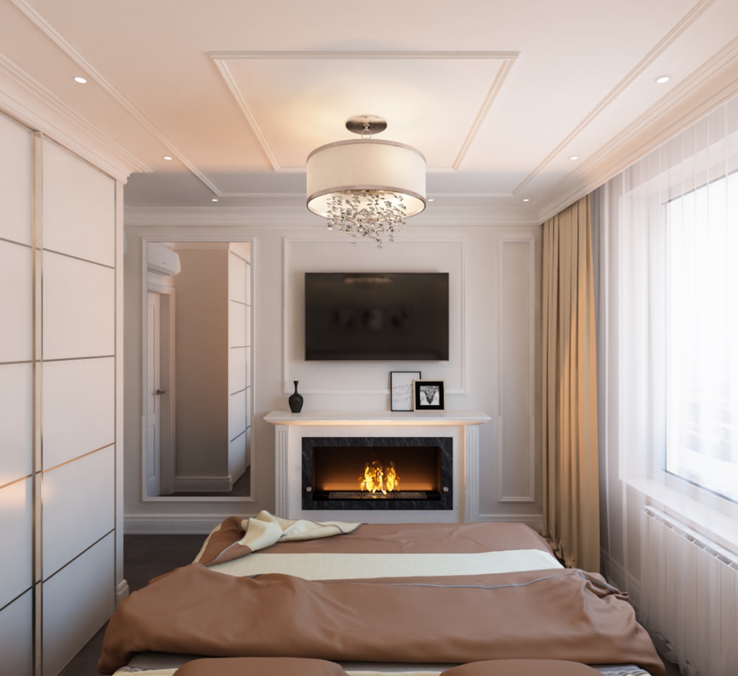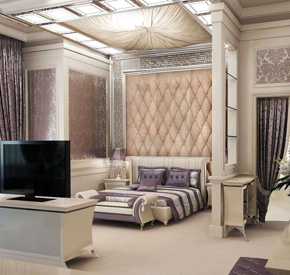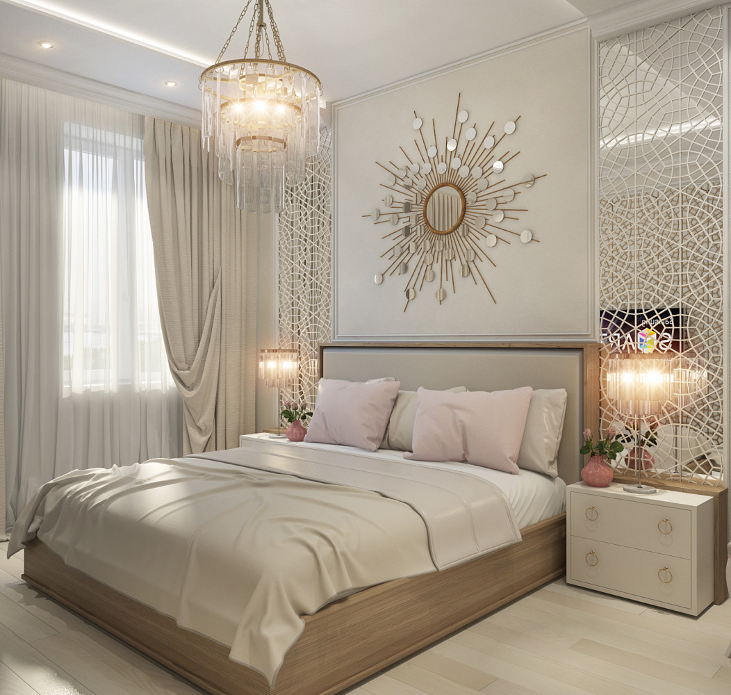 Para o interior do quarto, escolha uma paleta neutra que acrescente facilidade de espaço. Aderir às regras de zoneamento, isto é, as portas são substituídas por arcos, decorados com colunas e semicolunas com padrões antigos. O número de eletrodomésticos é minimizado.