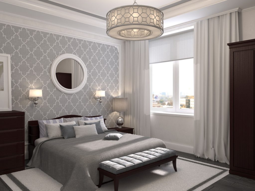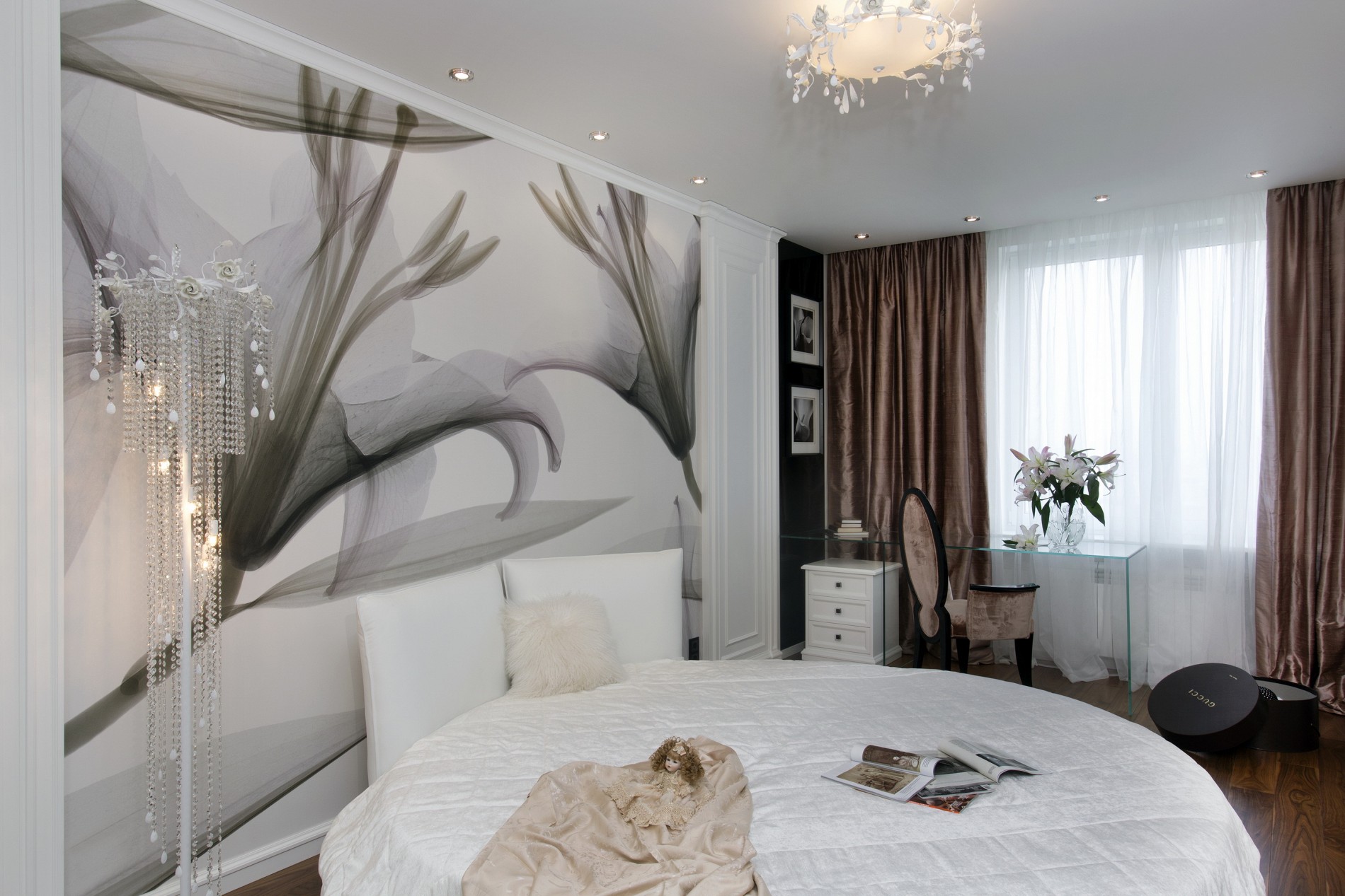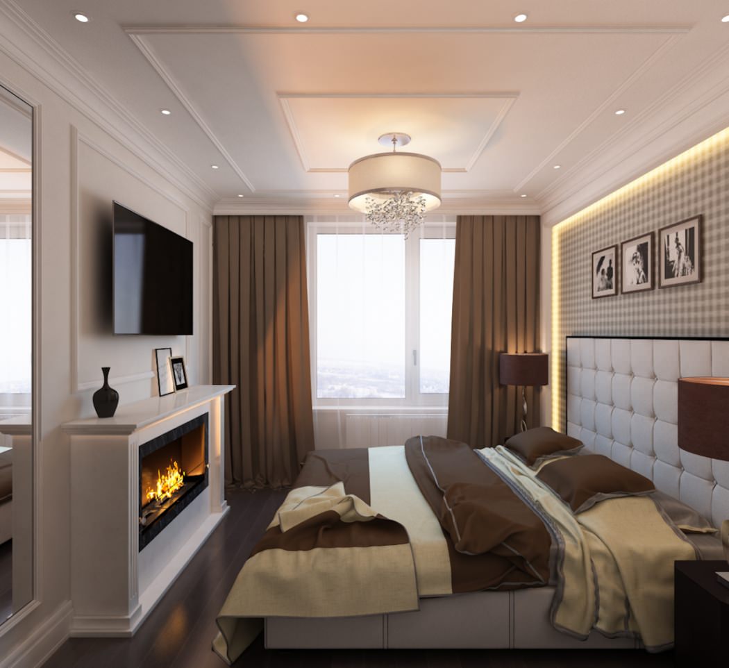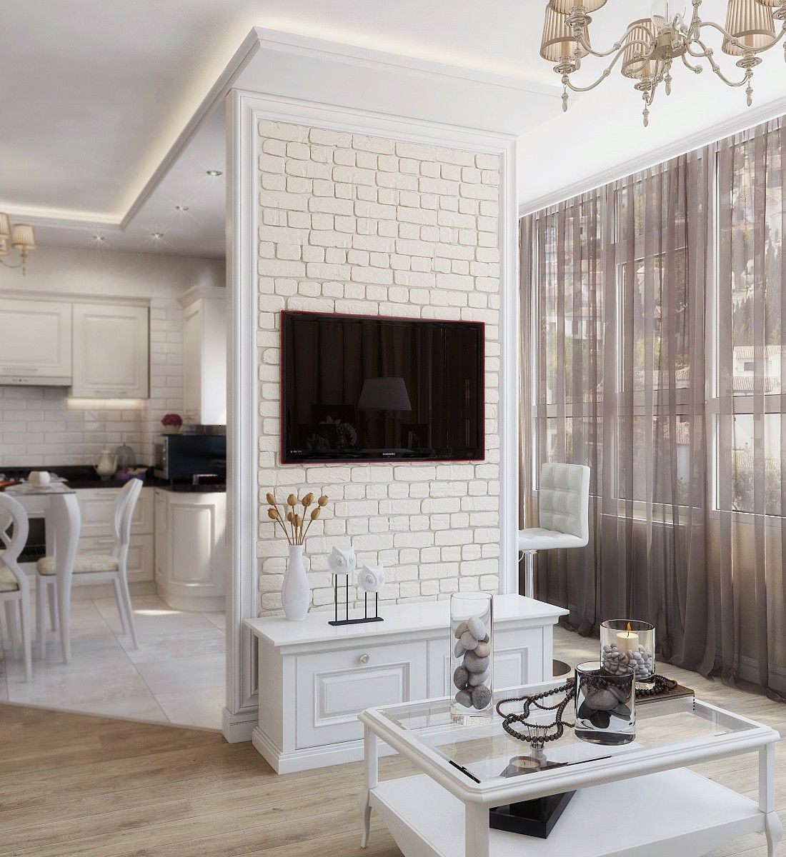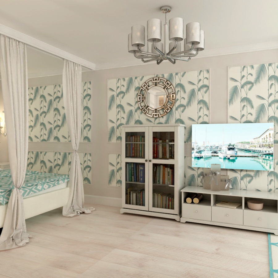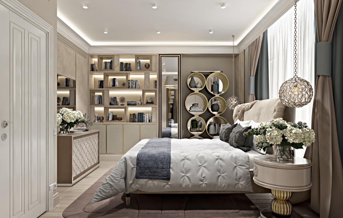 Para o interior do quarto, escolha uma paleta neutra que acrescente facilidade de espaço. Aderir às regras de zoneamento, isto é, as portas são substituídas por arcos, decorados com colunas e semicolunas com padrões antigos. O número de eletrodomésticos é minimizado.